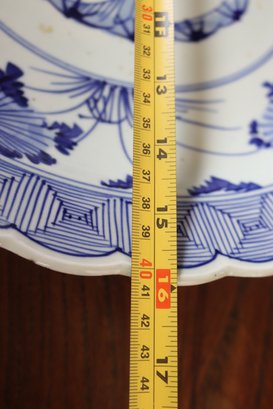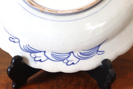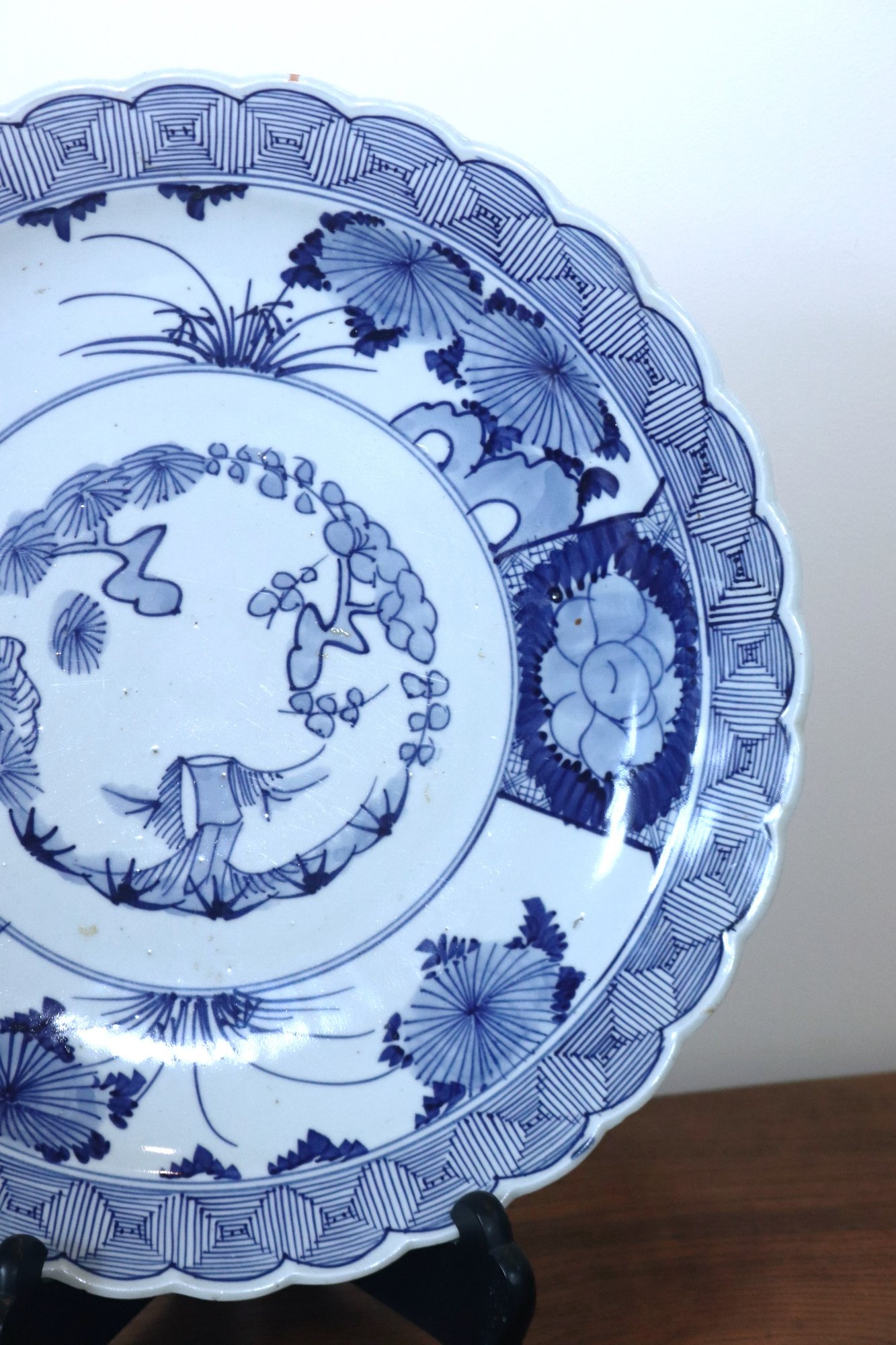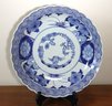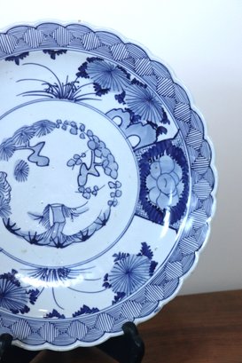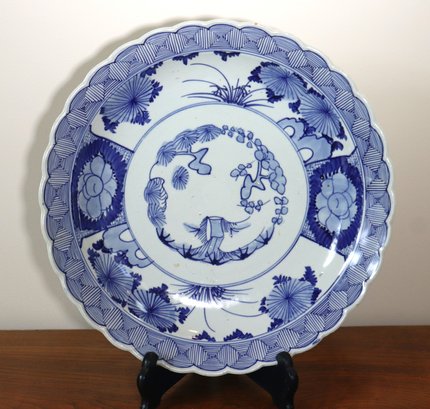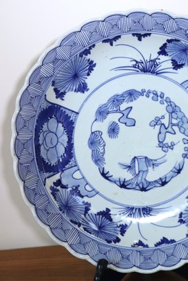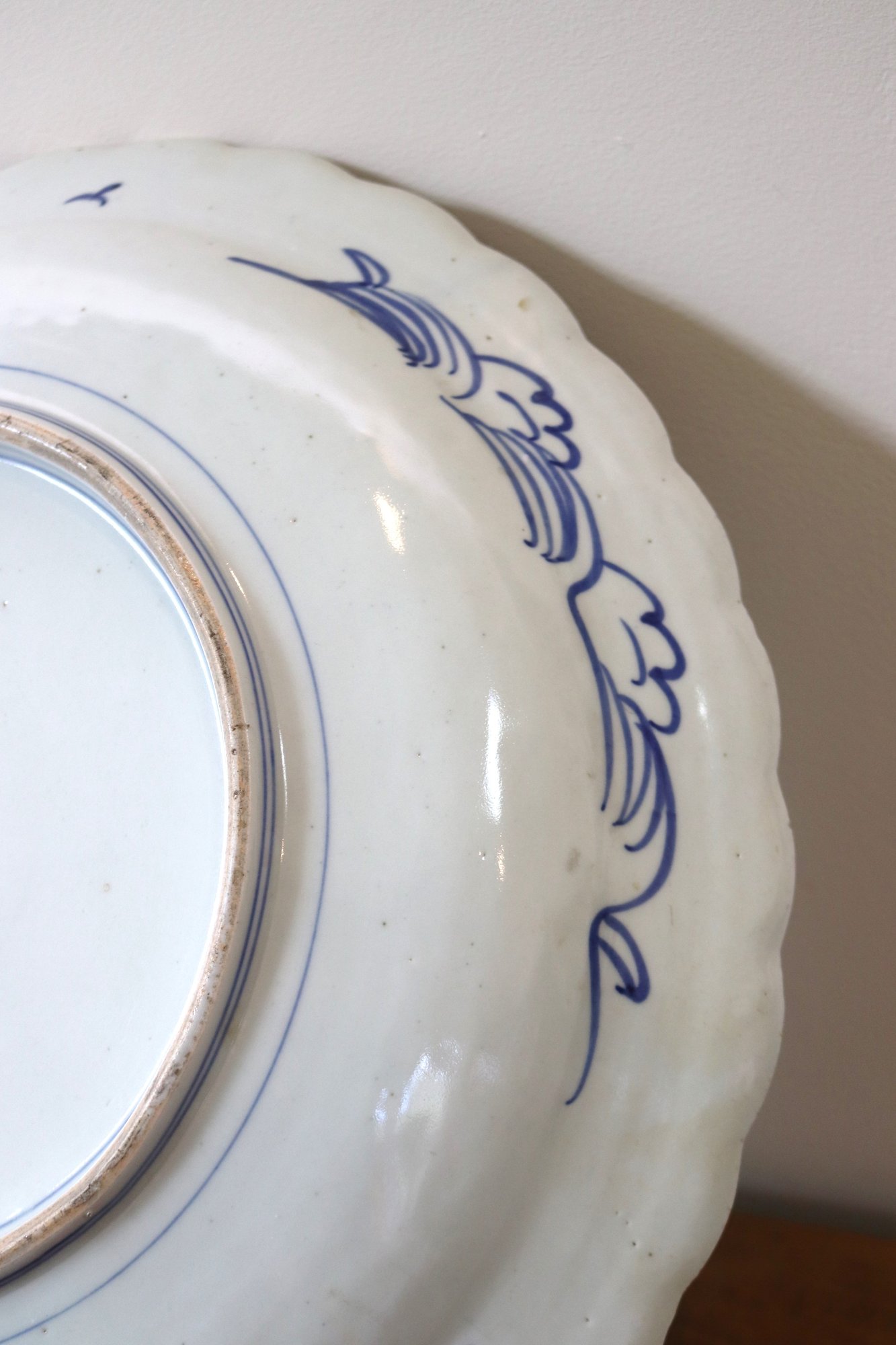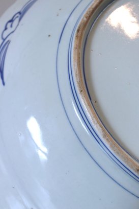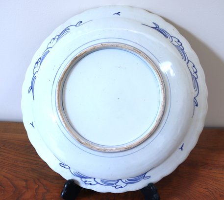 Japanese blue and white porcelain charger with blue circle marks on underside.