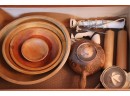 4 large wooden mixing bowls, Hand Mixer, Rolling Pins, Electric Lemon Squeezer & Terra Cotta pot. The largest wood bowl is 17” Dia.