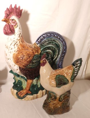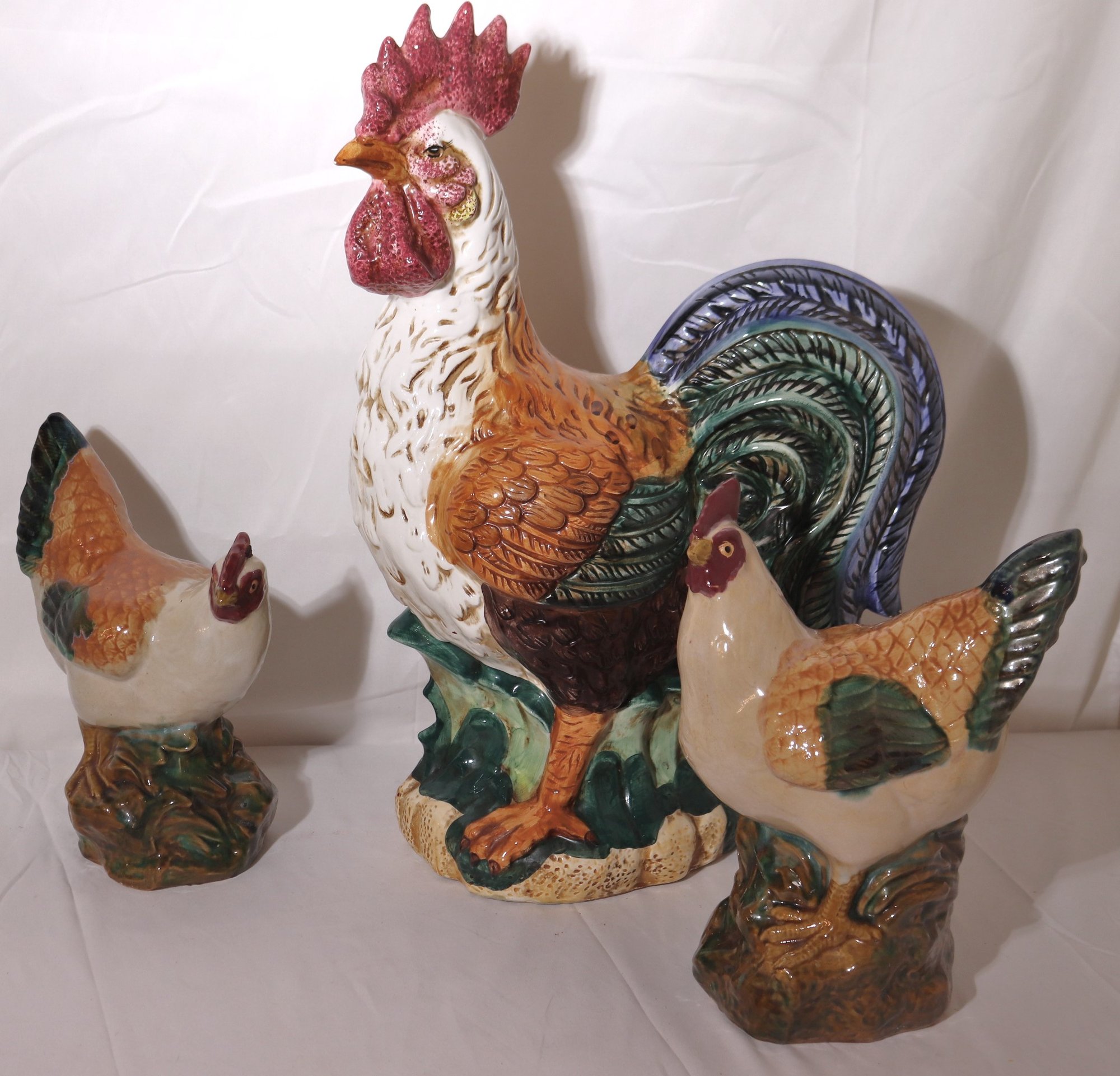 Large ceramic rooster and 2 decorative ceramic chickens.