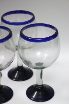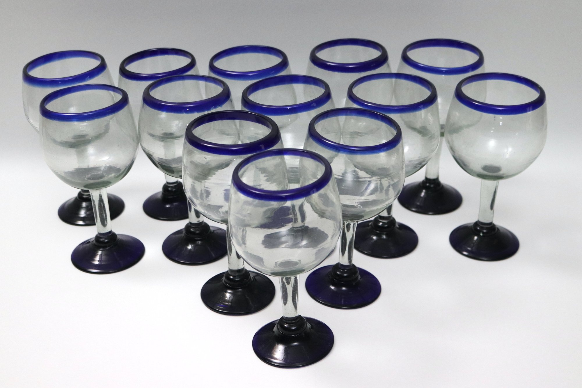 Large lot of 17 hand blown Mexican stemmed red wine glasses with blue rim approx. 8"t