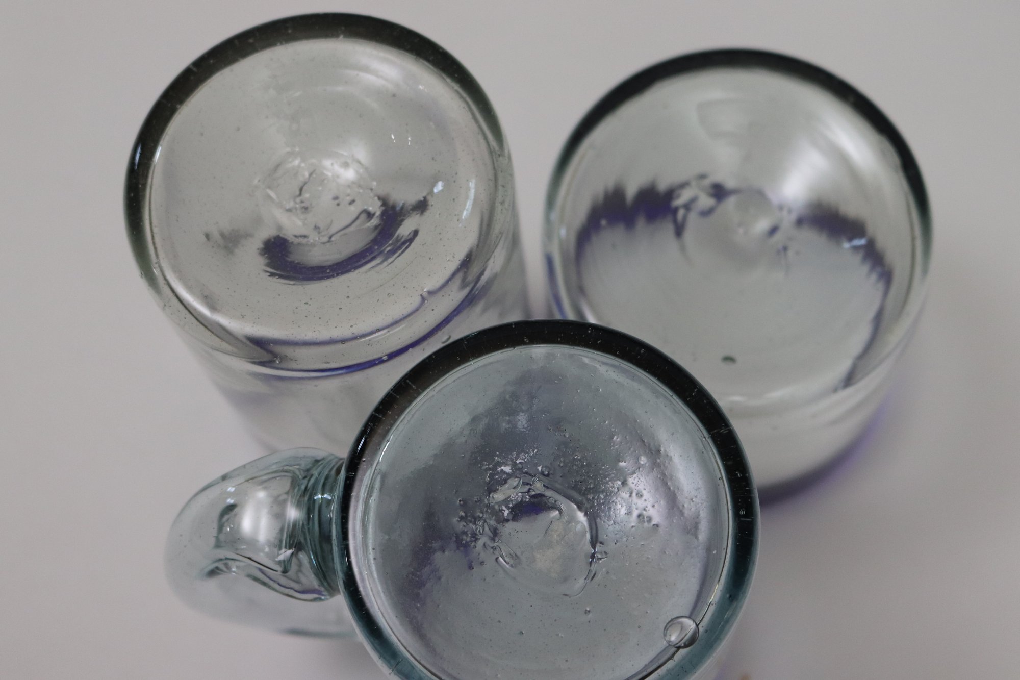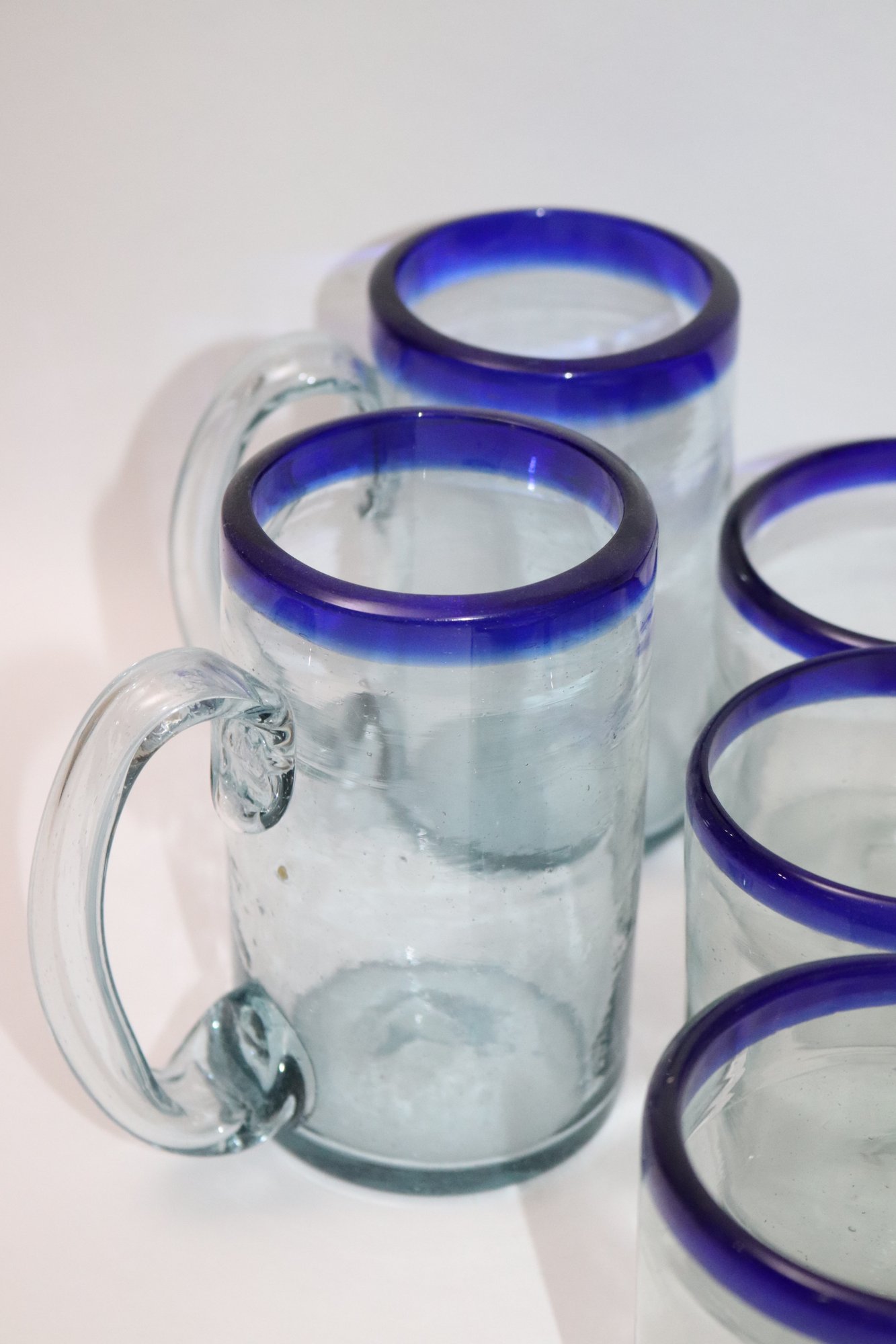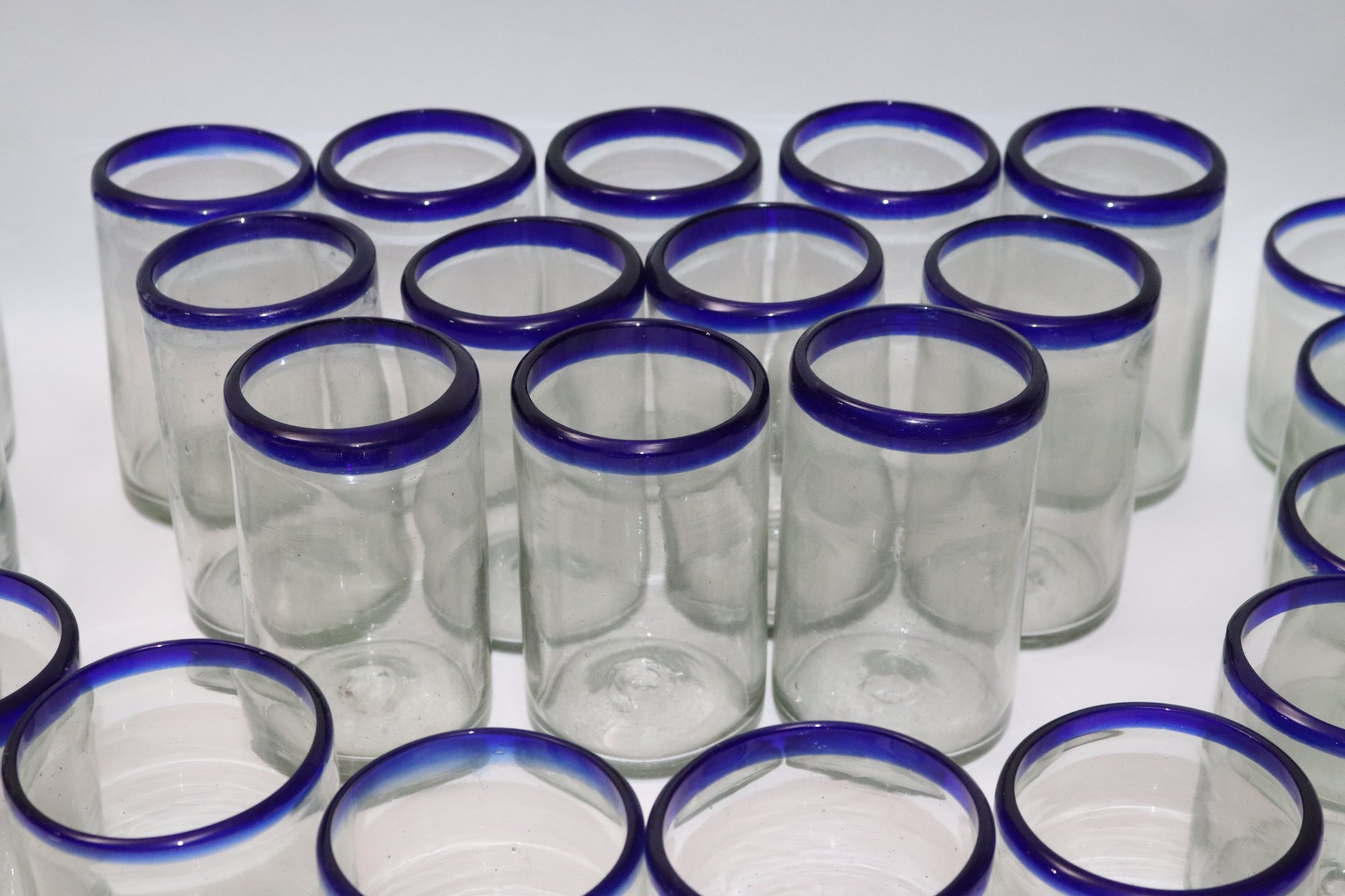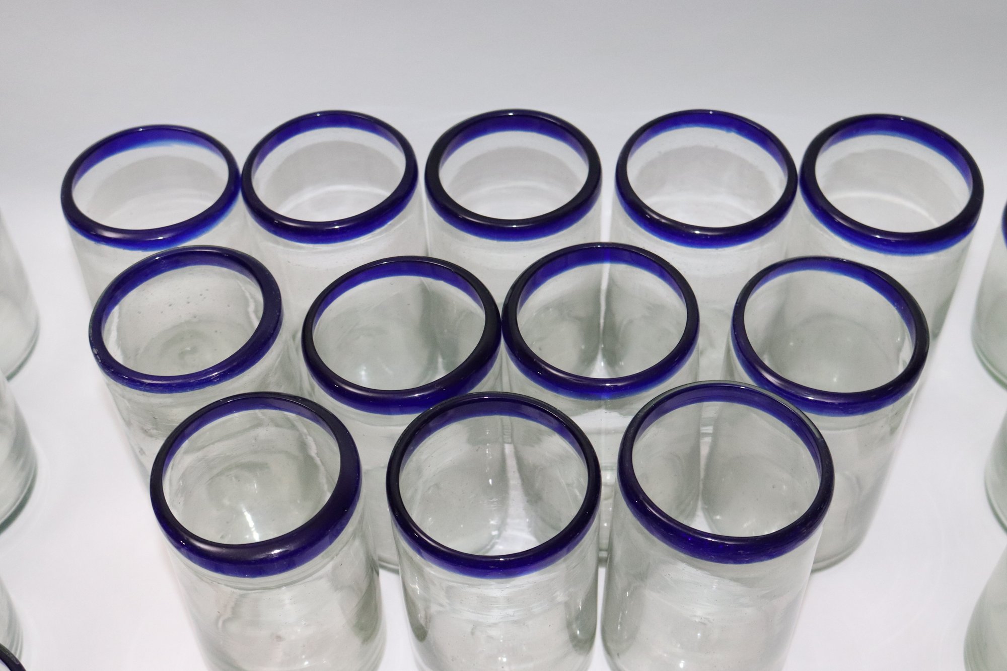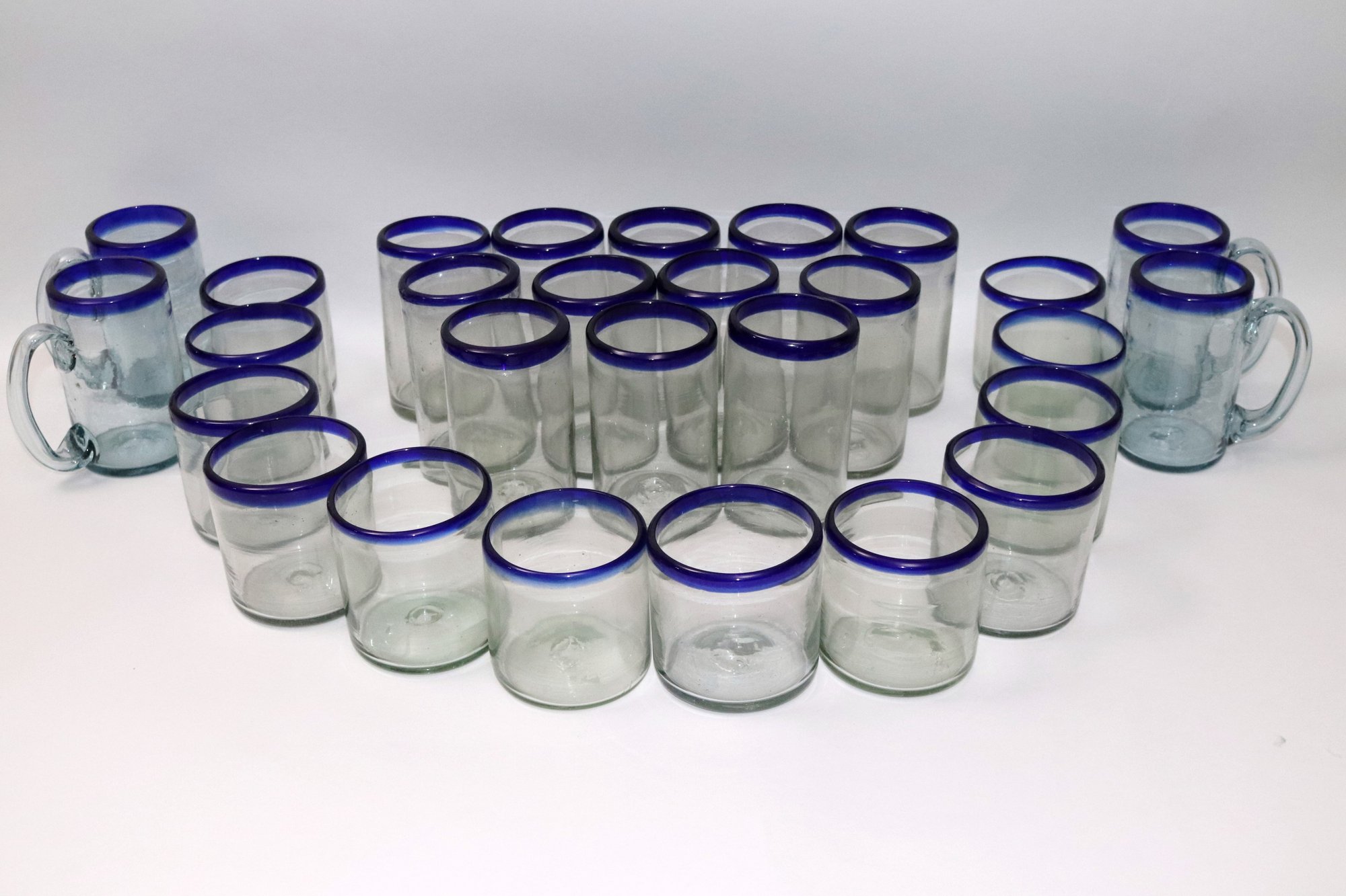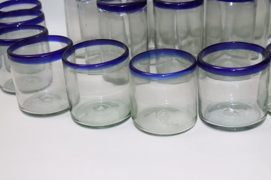 Large lot of Mexican hand-blown water, glasses, tall and short and four glass mugs. Lot includes 12 tall glasses, 12 short glasses & 4 mugs.