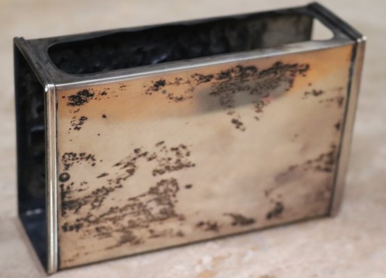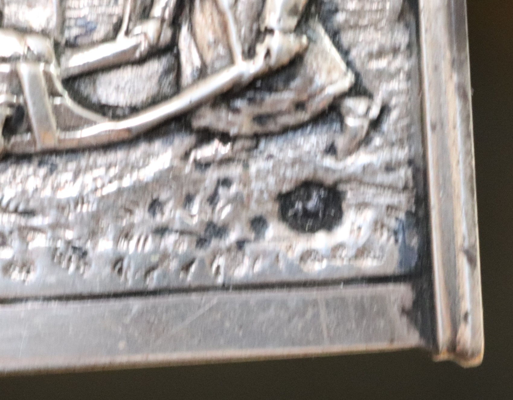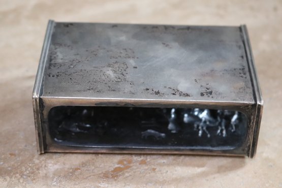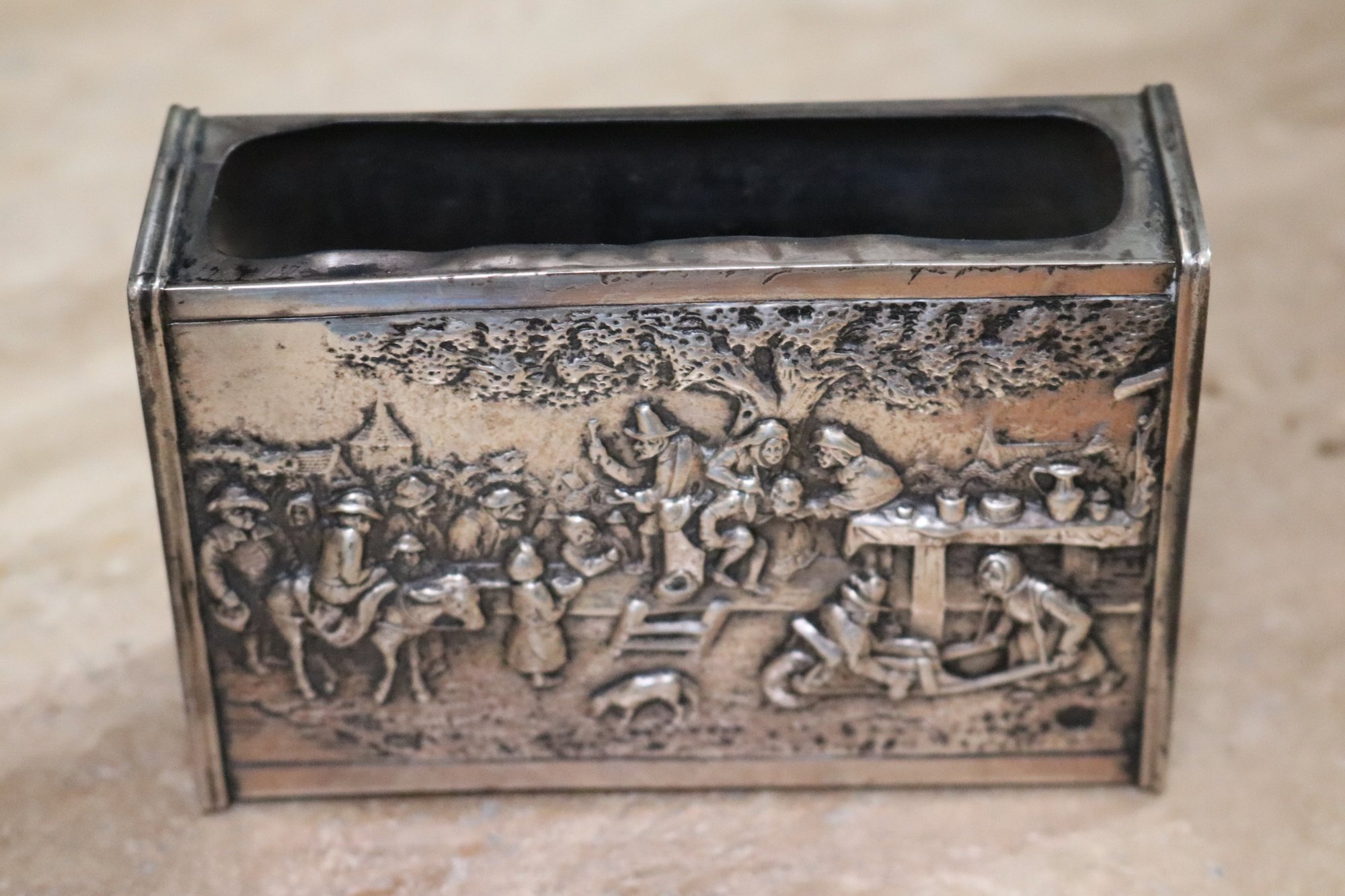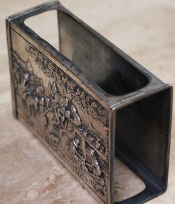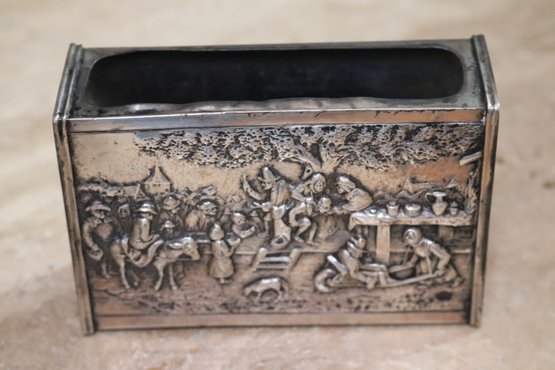 Large Ornate stamped Sterling silver matchbox cover with medieval town scene. Measures 4.25”x 3” x 1.5”