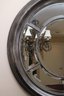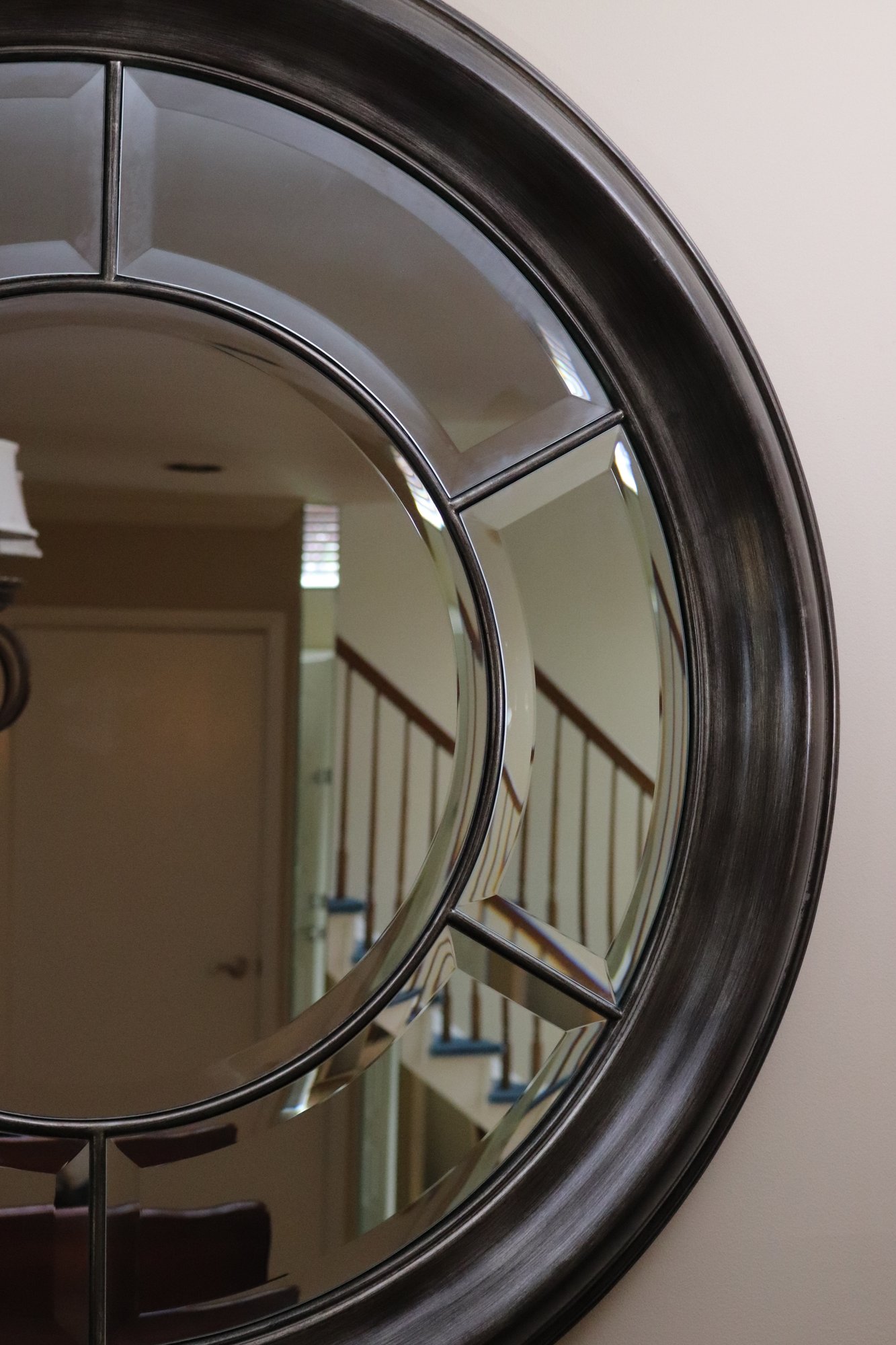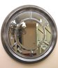 Large round modernist style wall mirror with wood frame & beveled mirror panels. Make a nice entrance way even more special with this large contemporary wall mirror.