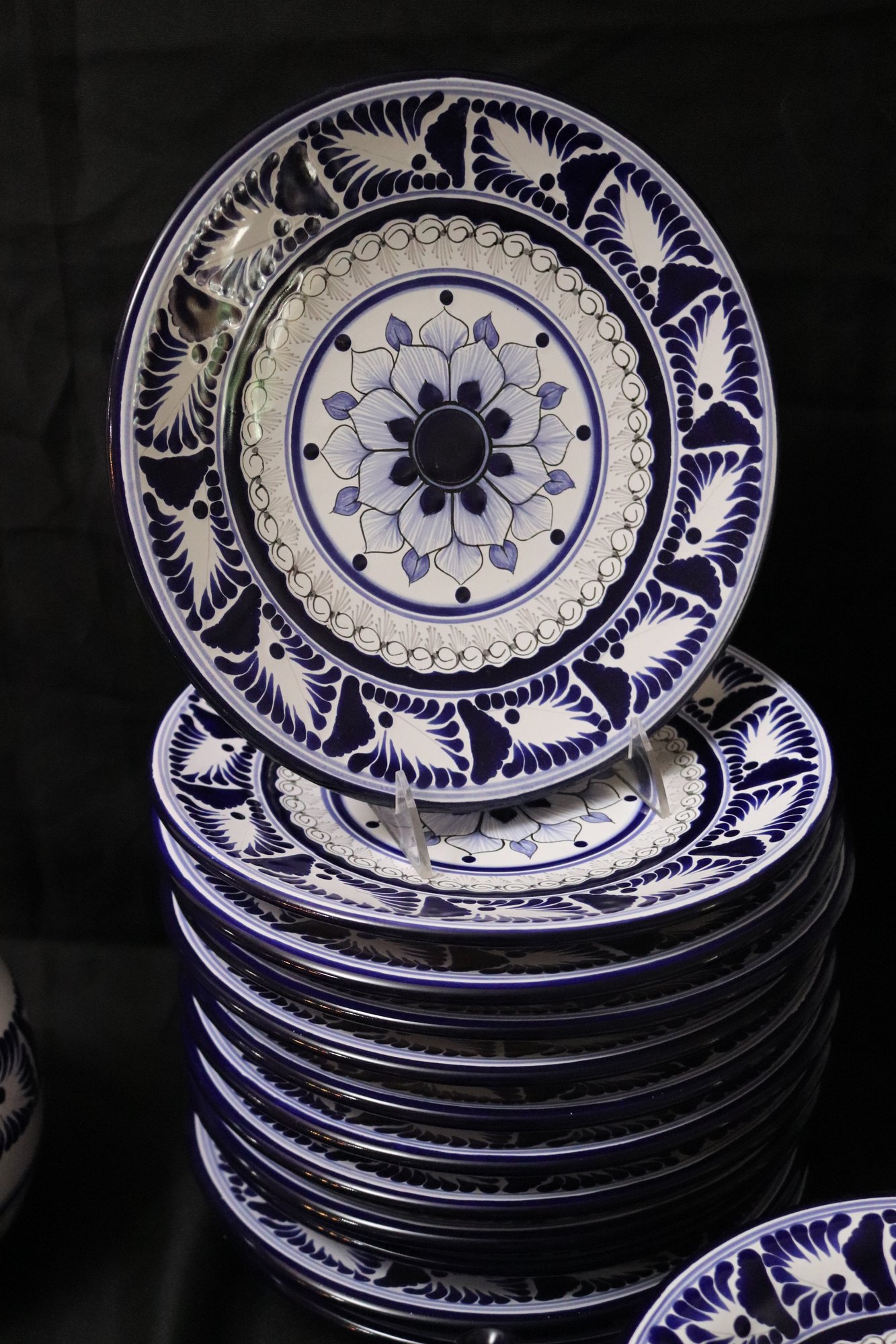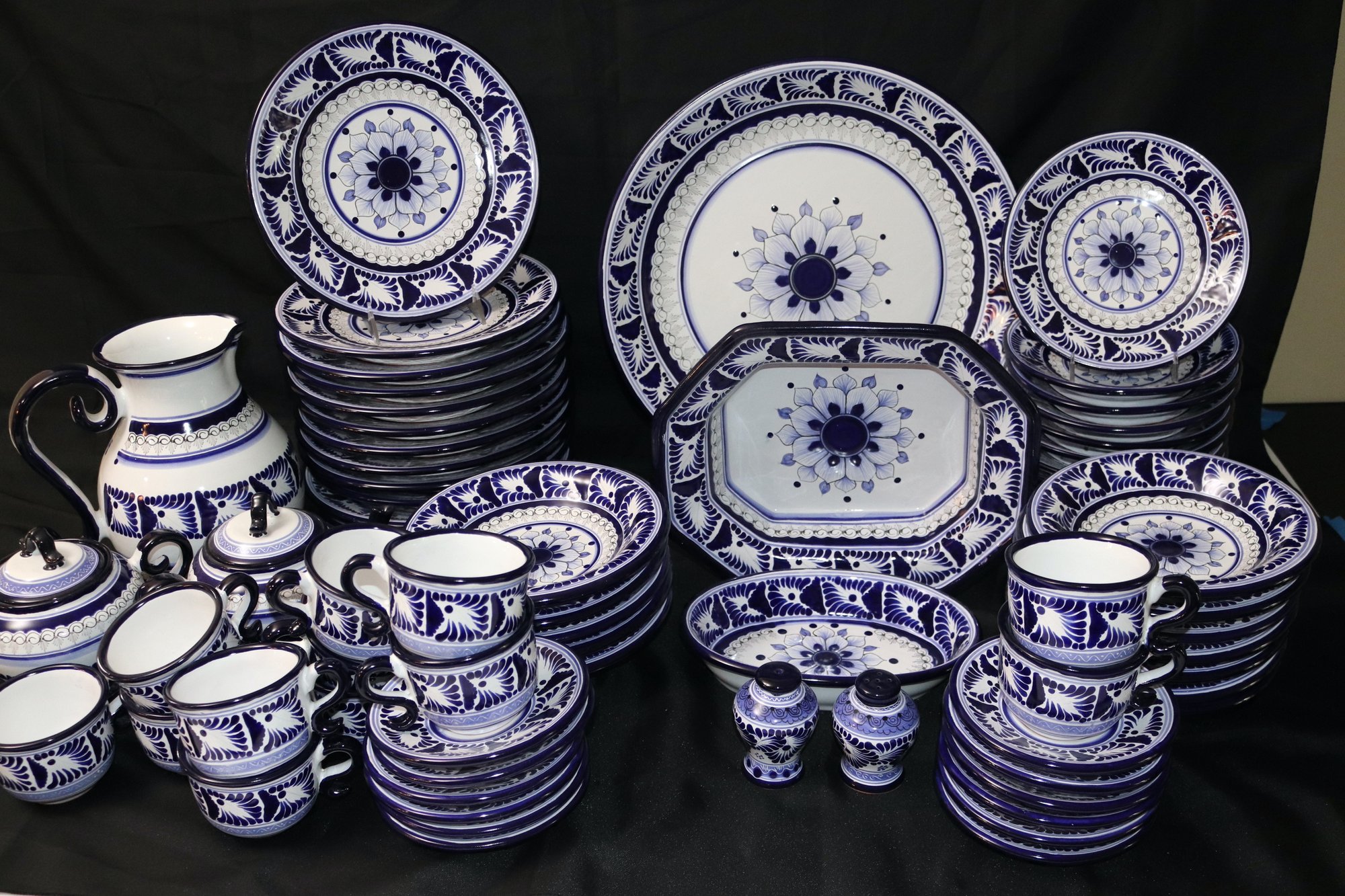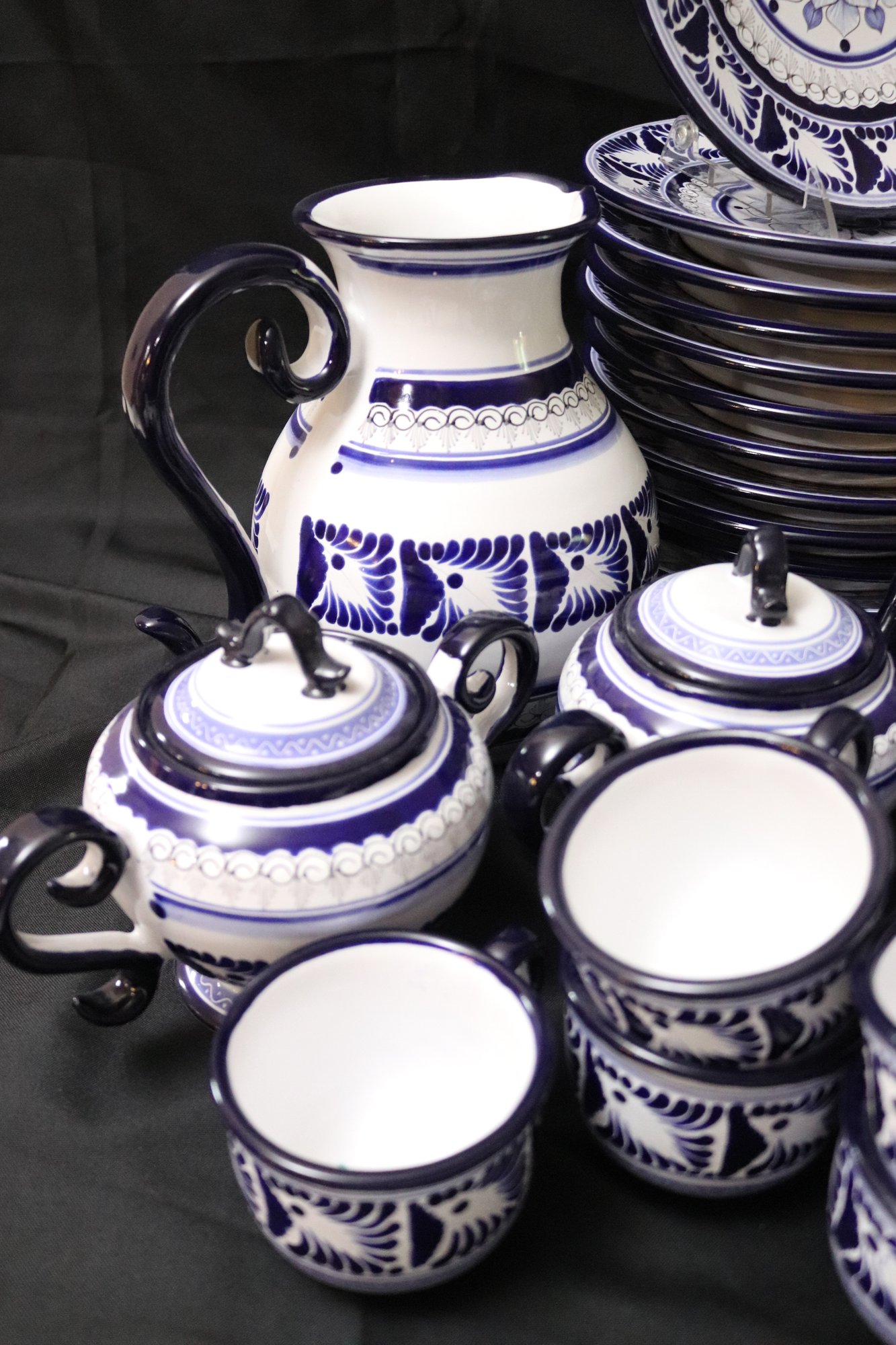 You’ll fee. like its always a good time to celebrate and enjoy entertaining with this large set of blue and white hand painted ceramic dinnerware by Hernandez Mexico Featuring 12 dinner plates, 12 salads,12 soup bowls, 12 cups & saucers, round serving platter, hexagonal serving bowl, pitcher, sugar and creamer.