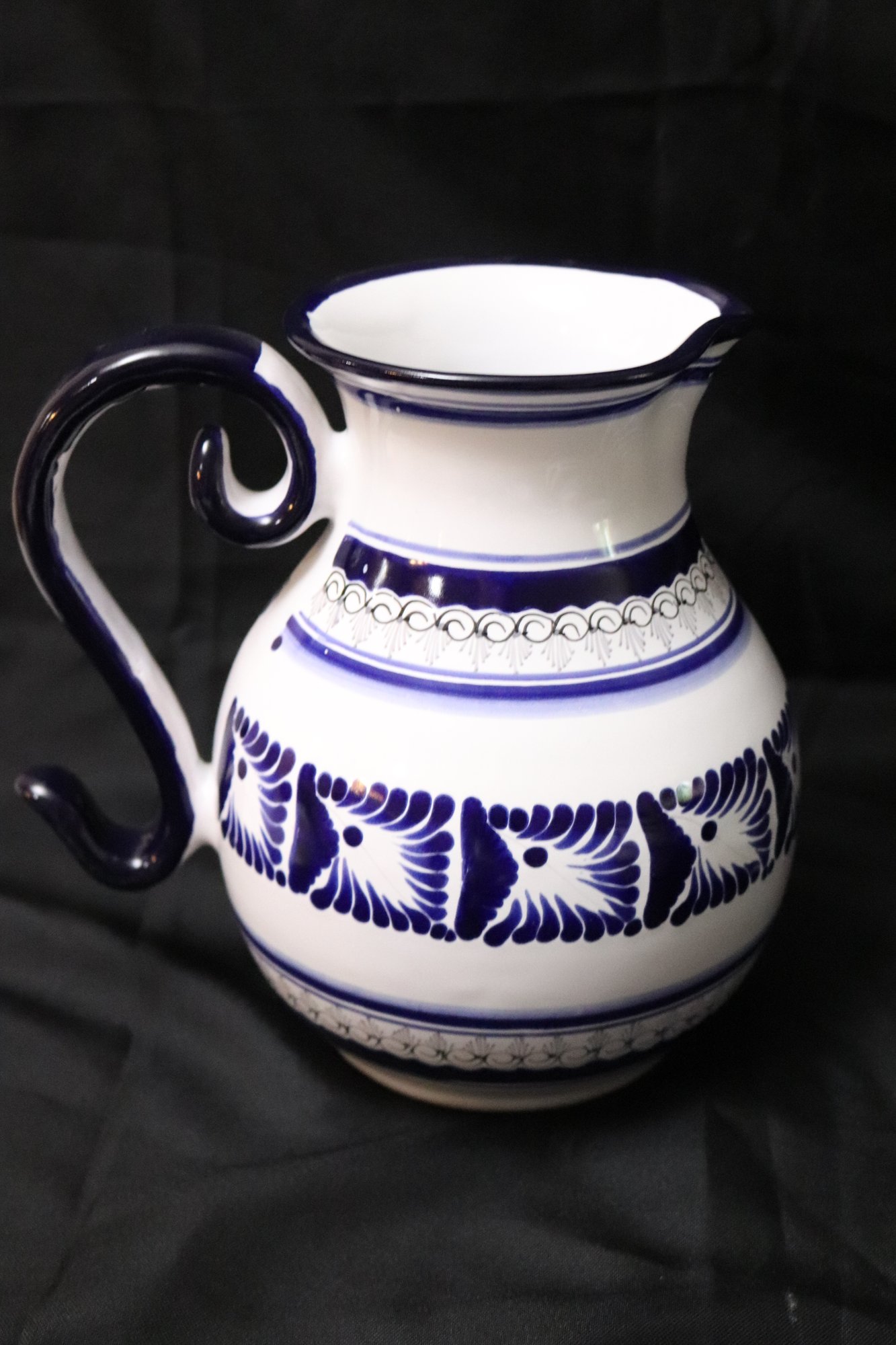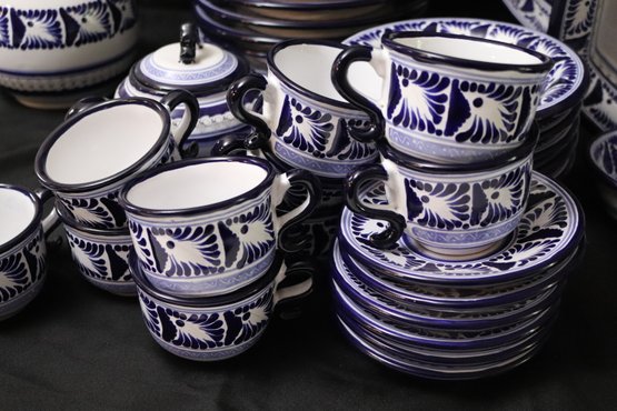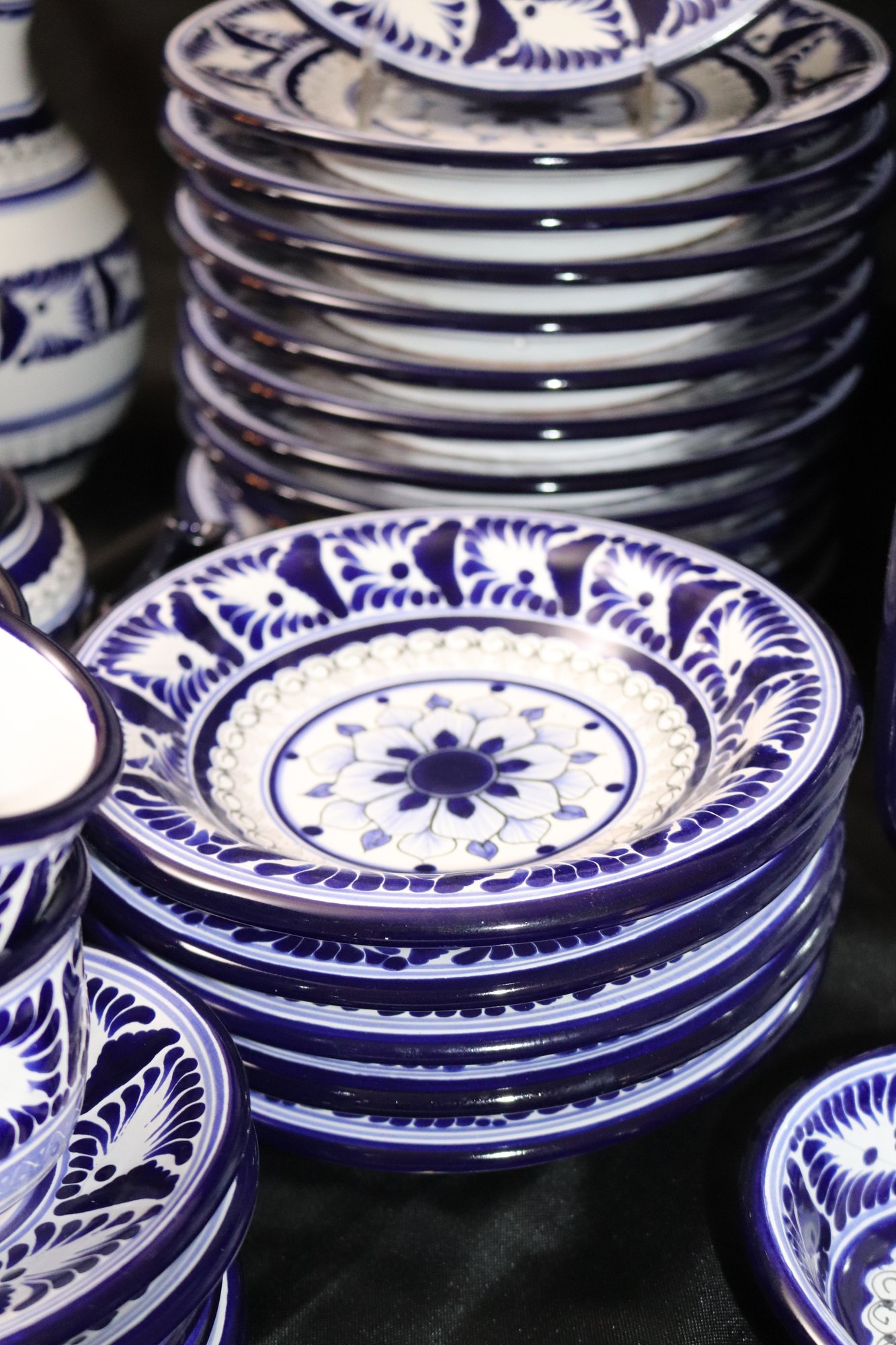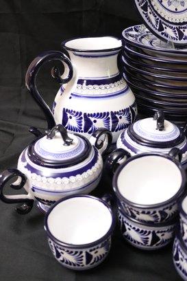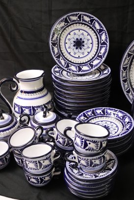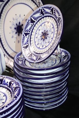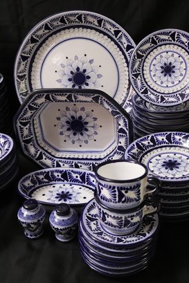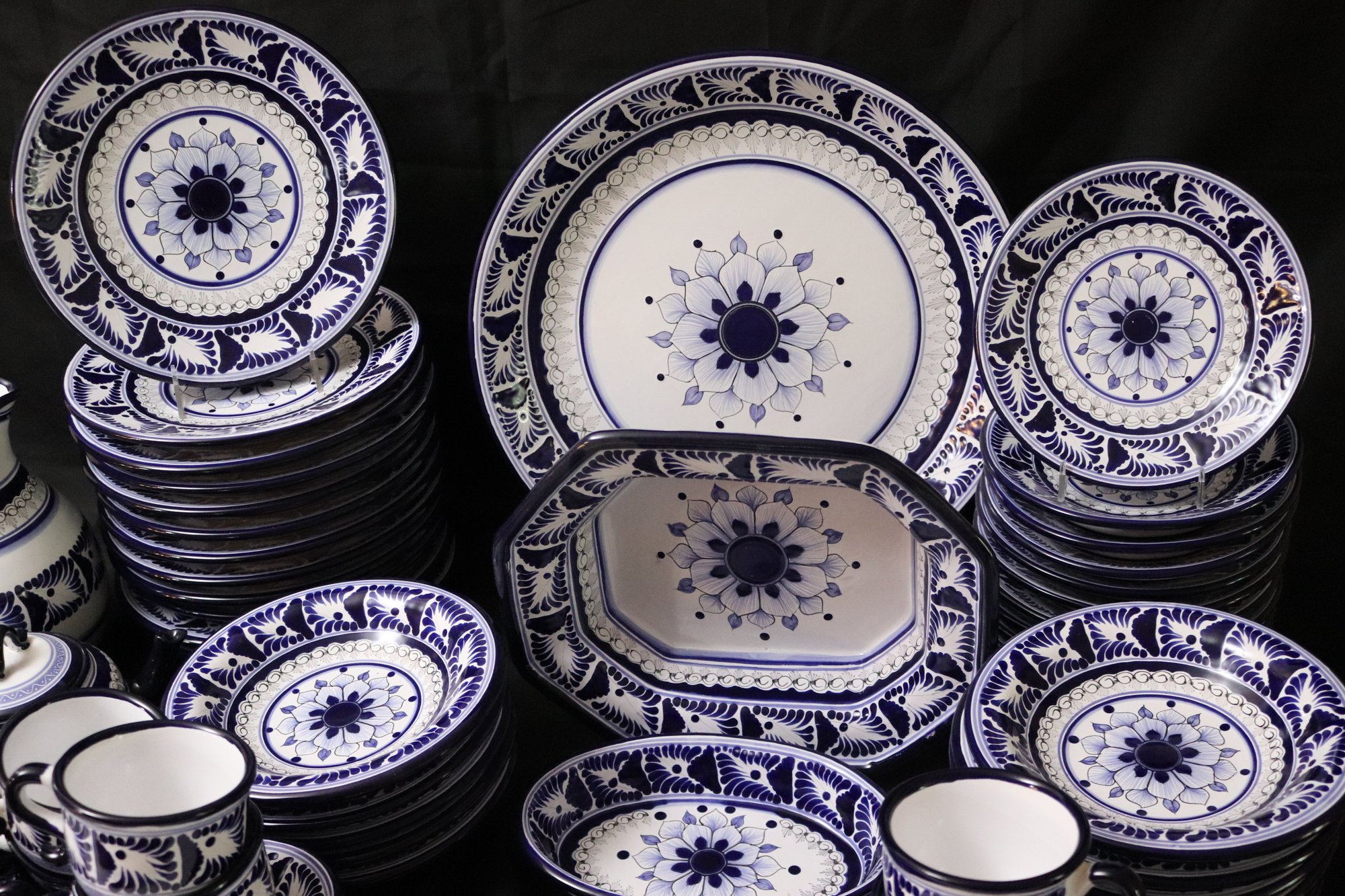 You’ll fee. like its always a good time to celebrate and enjoy entertaining with this large set of blue and white hand painted ceramic dinnerware by Hernandez Mexico Featuring 12 dinner plates, 12 salads,12 soup bowls, 12 cups & saucers, round serving platter, hexagonal serving bowl, pitcher, sugar and creamer.