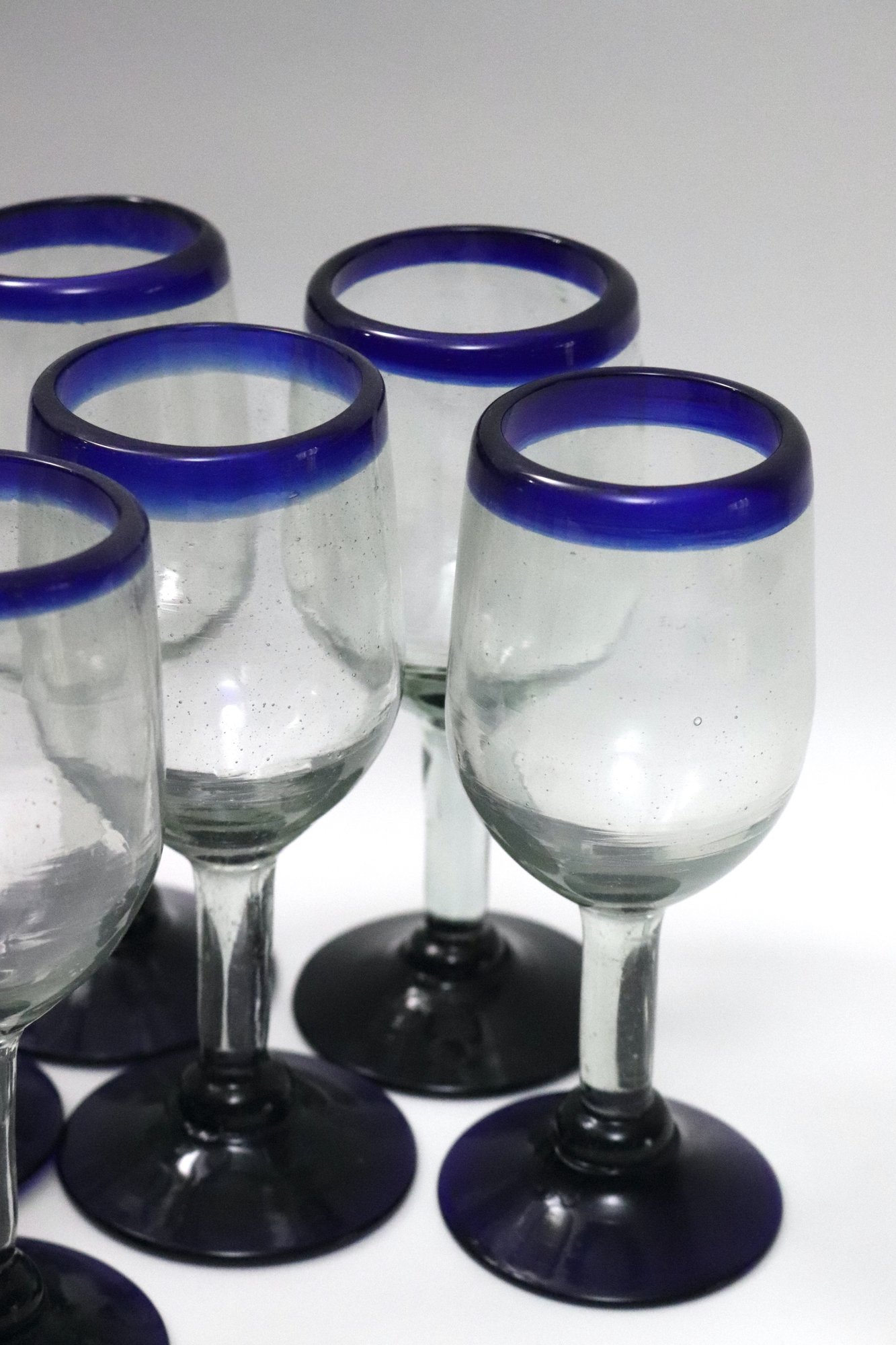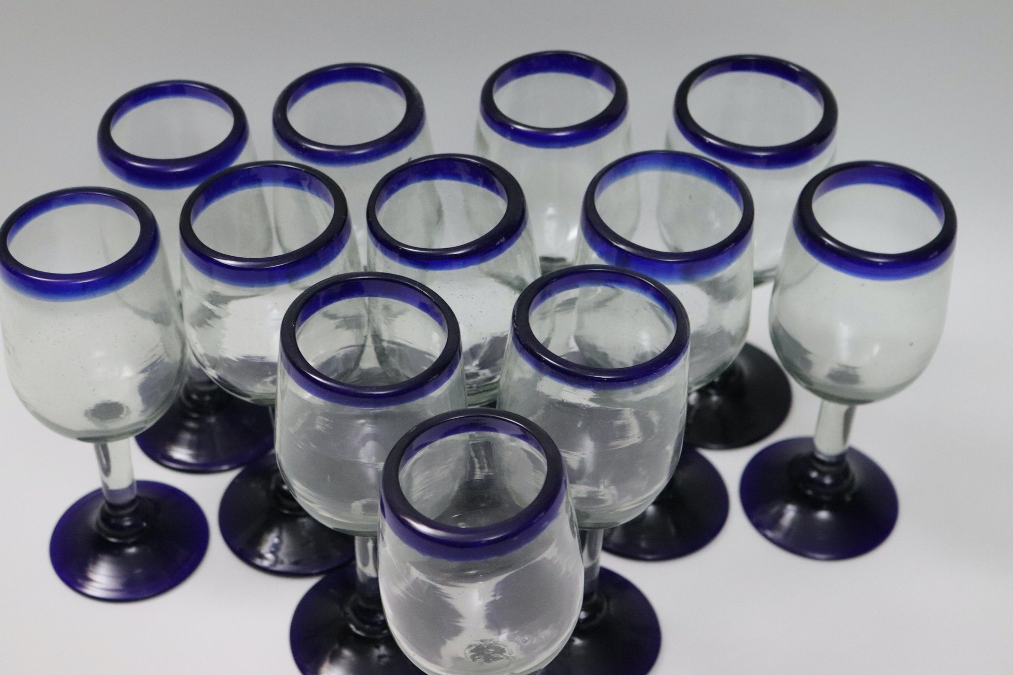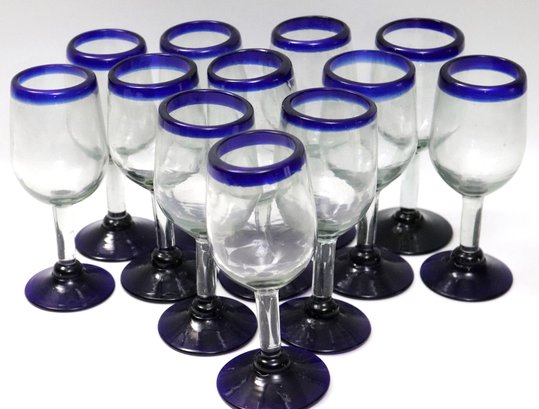 Lof of 12 hand blown Mexican stemmed white wine glasses with blue trim.