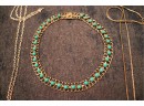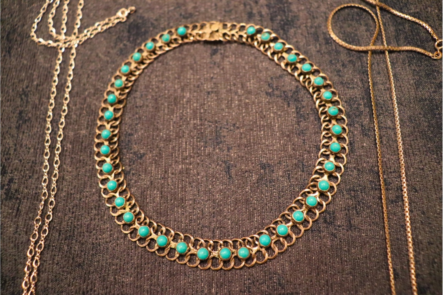 There are 2, chic, sterling silver chain necklaces & 1 with turquoise beads. Measurements between 10”- 11”, turquoise bead necklace is 7” L