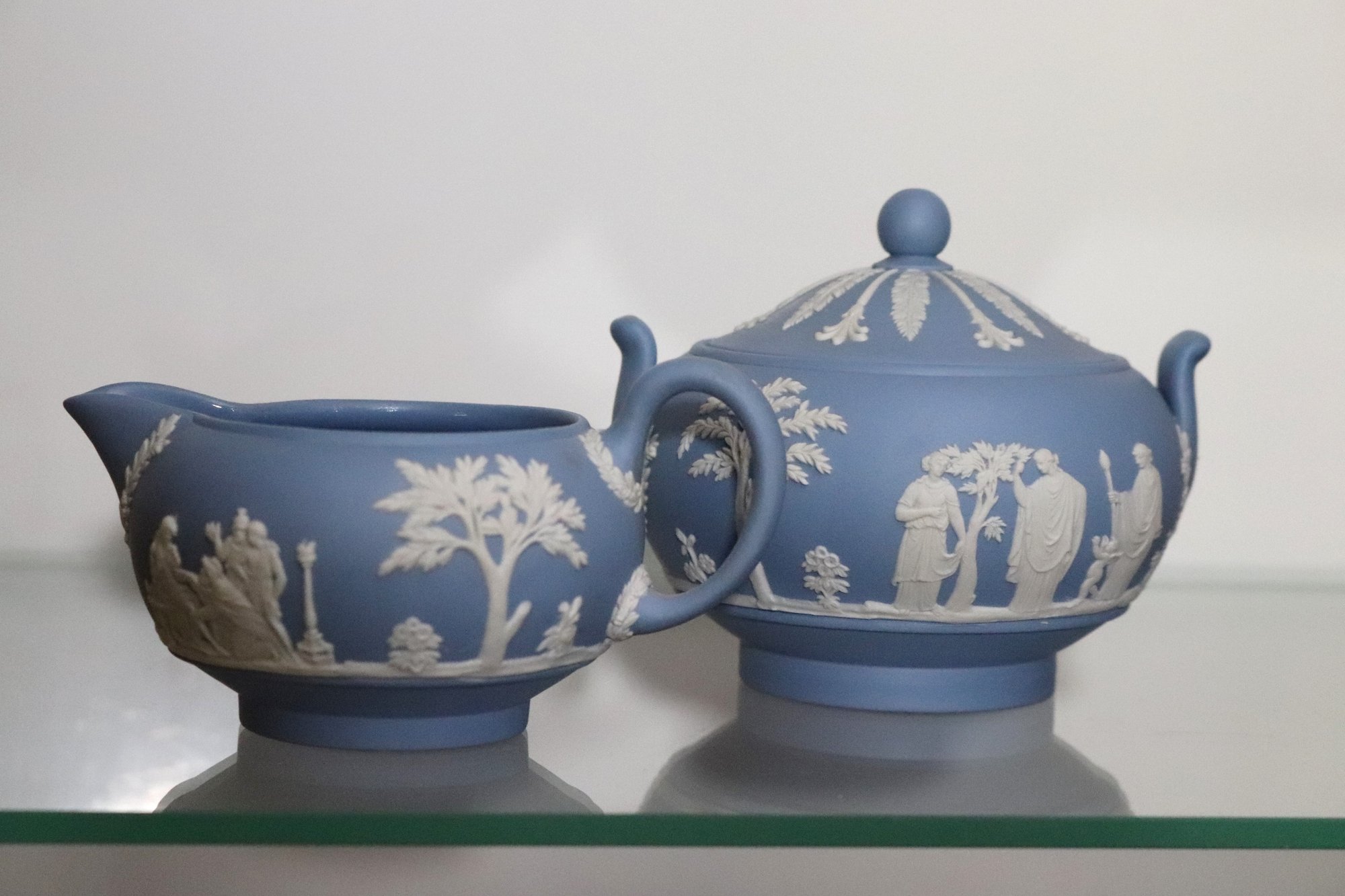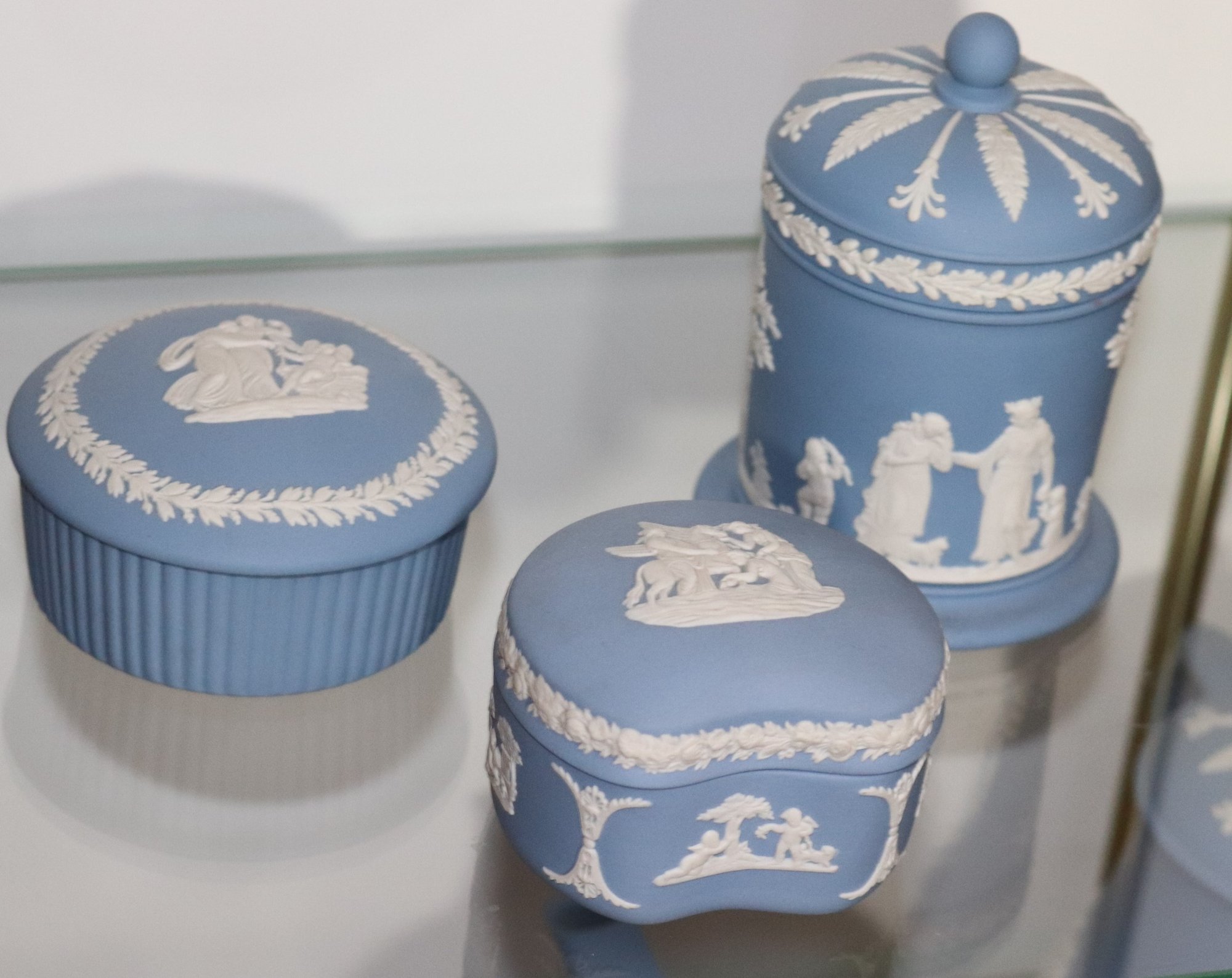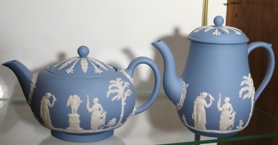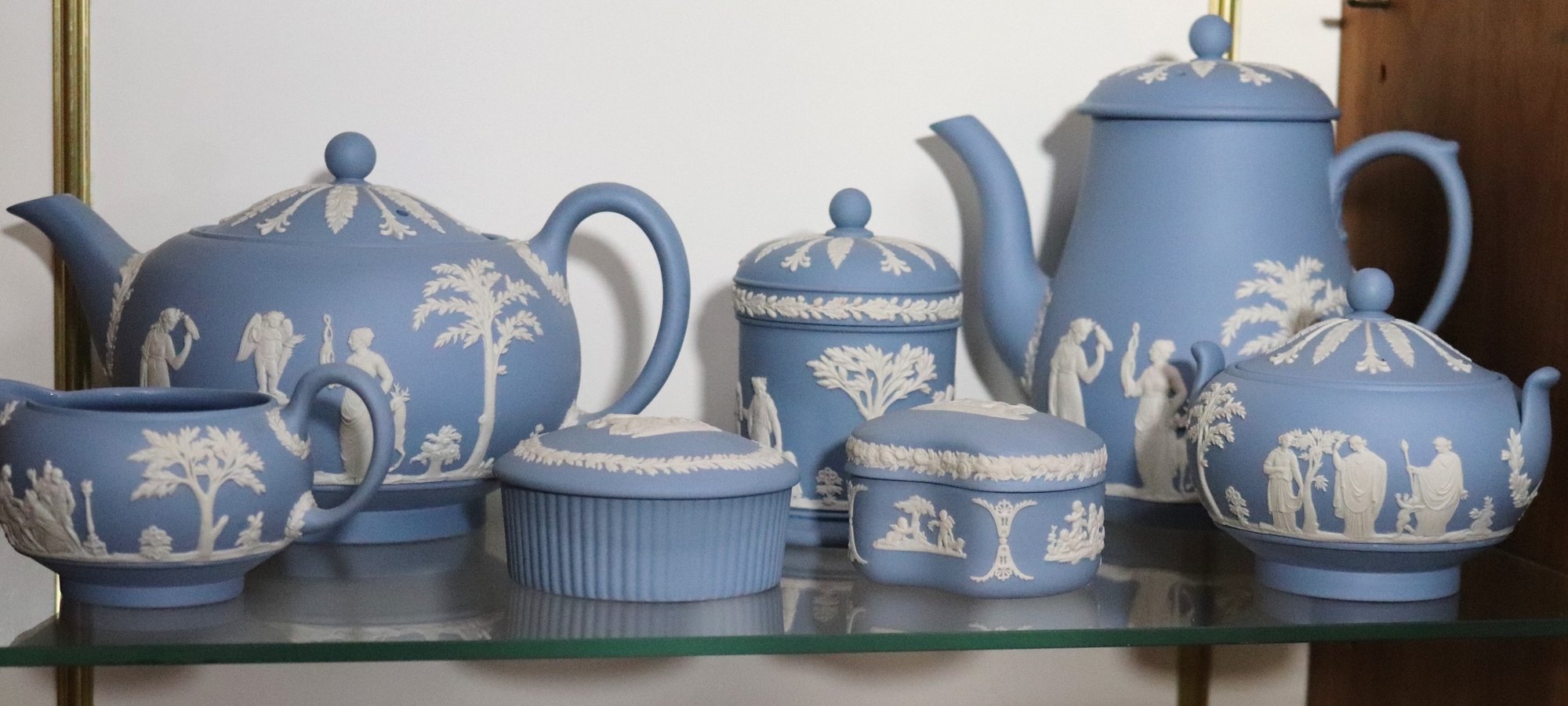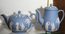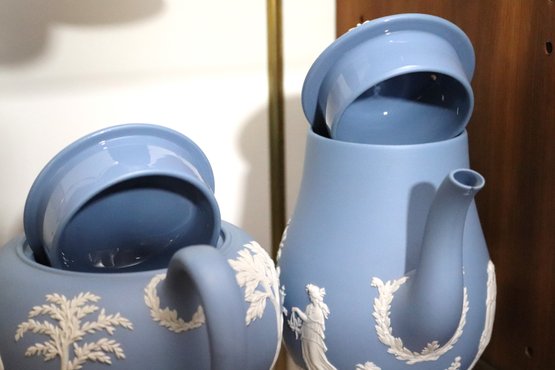 Lot of 7 blue & white Wedgwood pieces with lids including teapot, coffee pot, sugar & creamer & 2 boxes, all with original lids