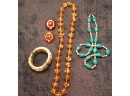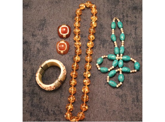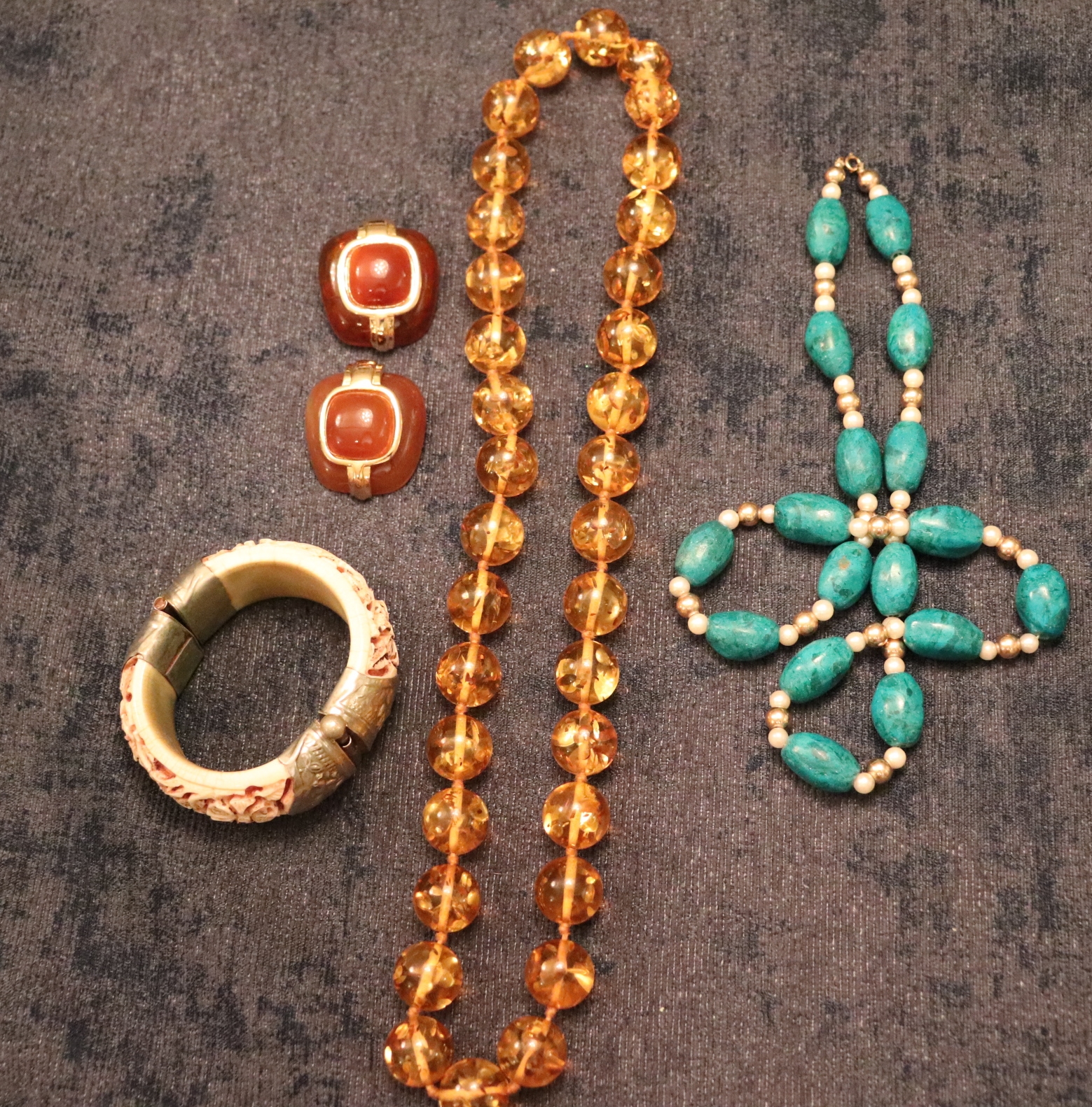 In this lot we have a Carved Bangle & Clip Earrings. Necklaces measure approx. 12” L & 13” L, Bracelet is approx. 2.25” W interior, clip earrings are approx. 1.75” L, 1.5” W
