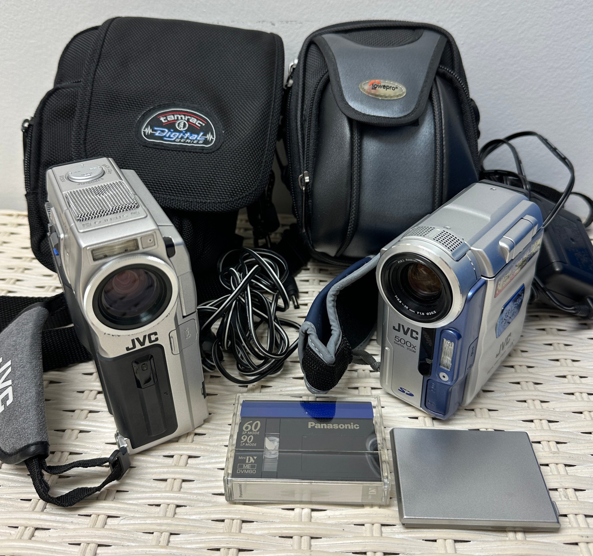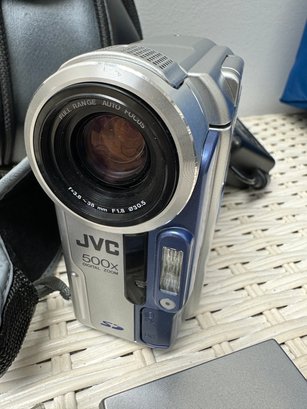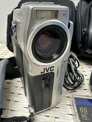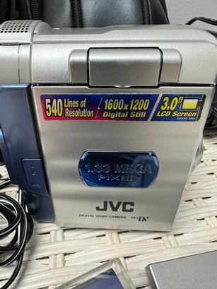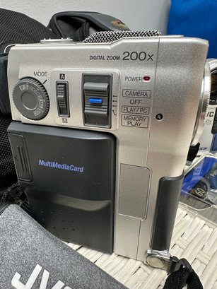 Lot with JVC digital video camera, cases, batteries & much more equipment.This lot also includes a JVC digital zoom 200X and JVC GR-DVM 90 digital video camera, progressive scan 1000 video. All items are vintage & have not been tested for working condition.