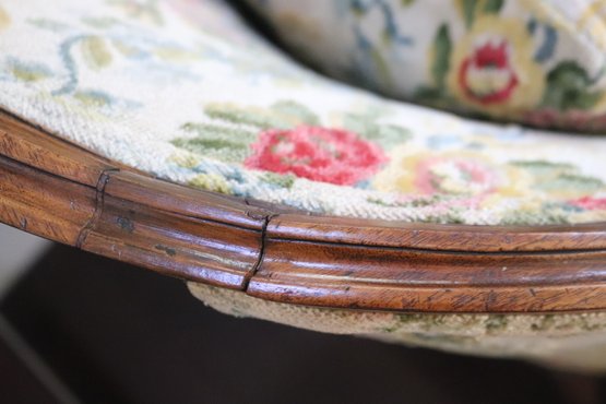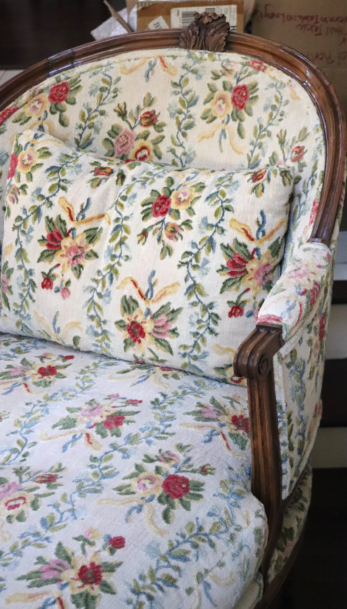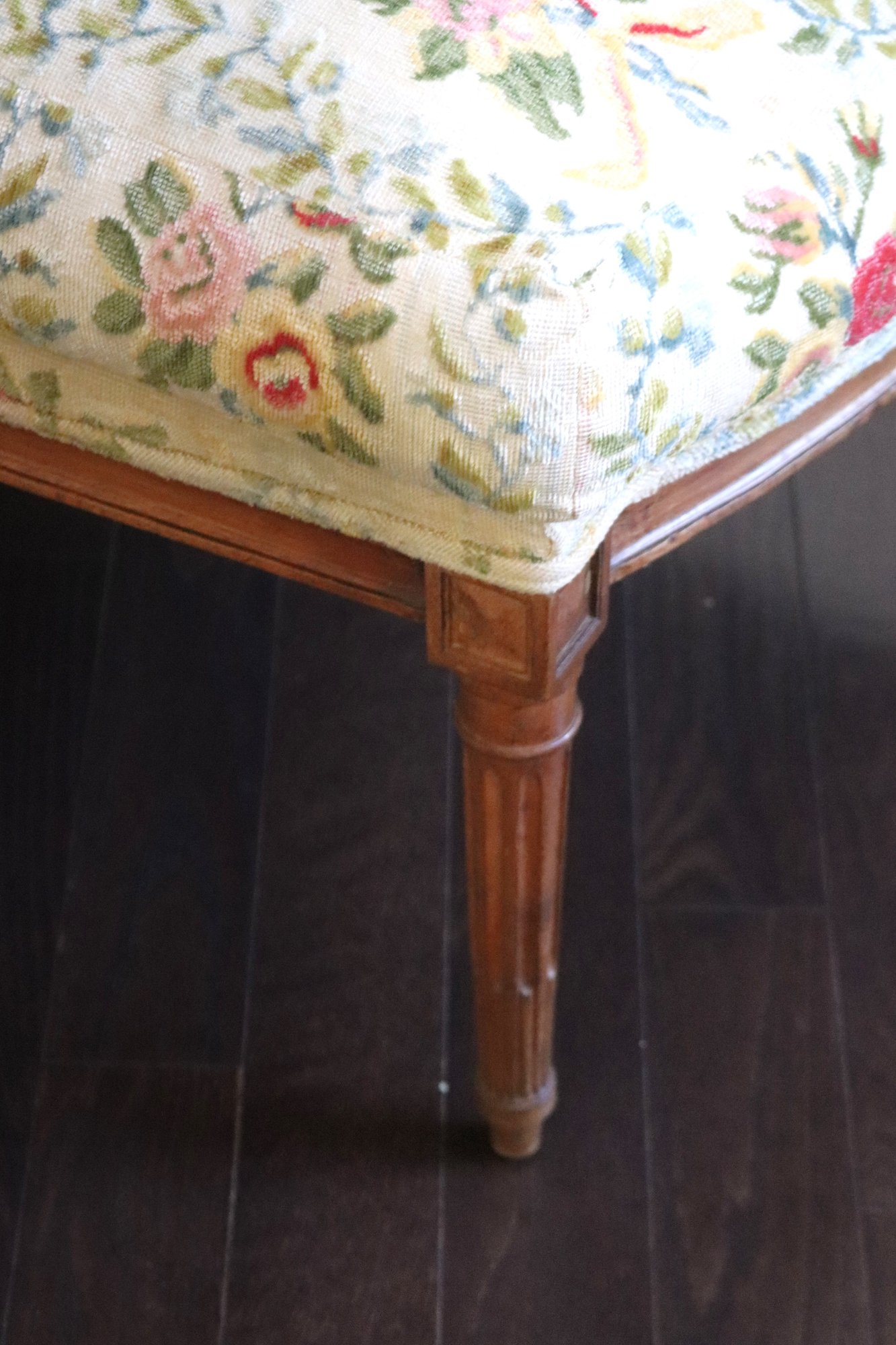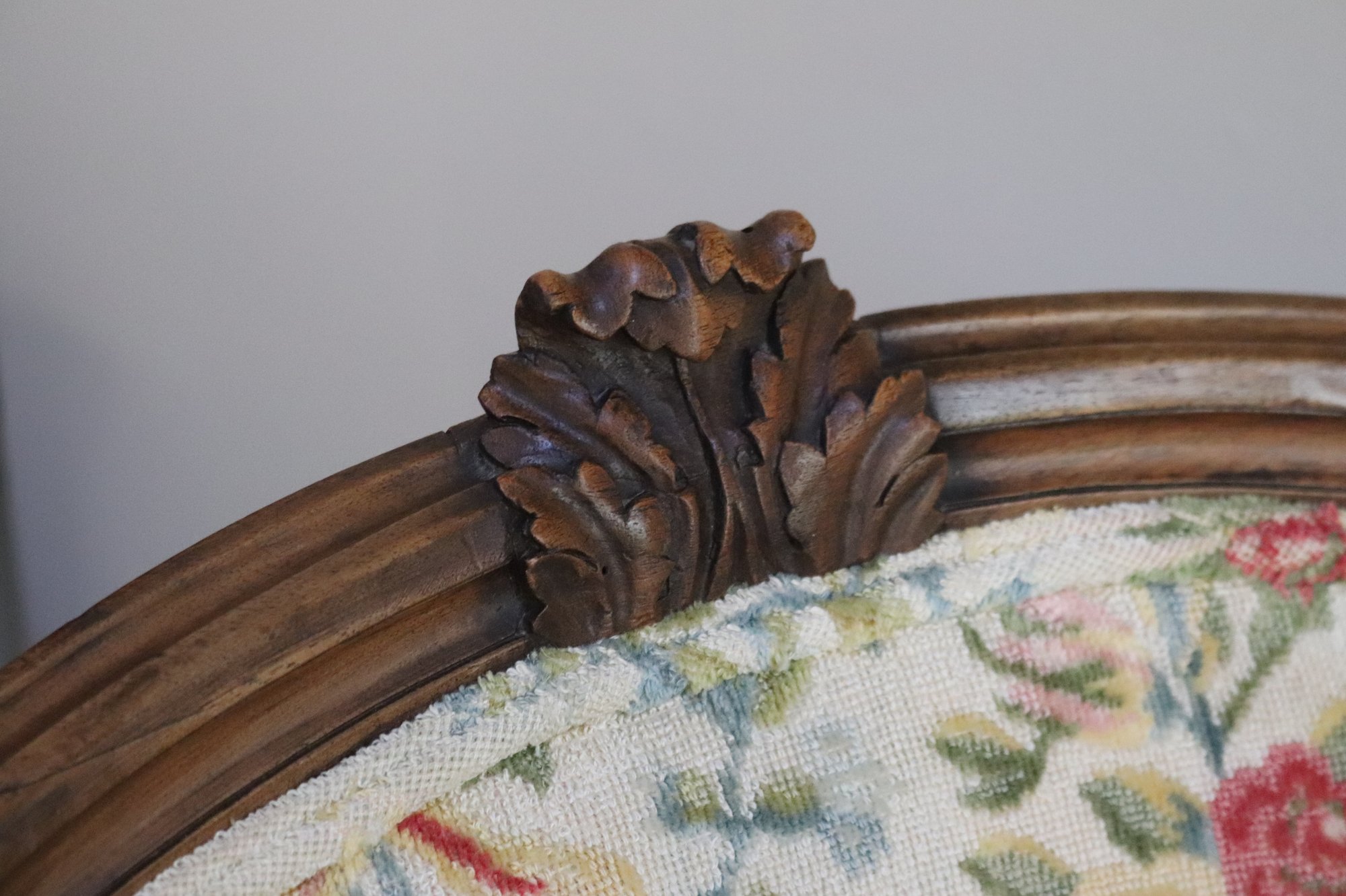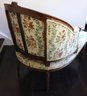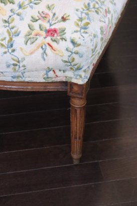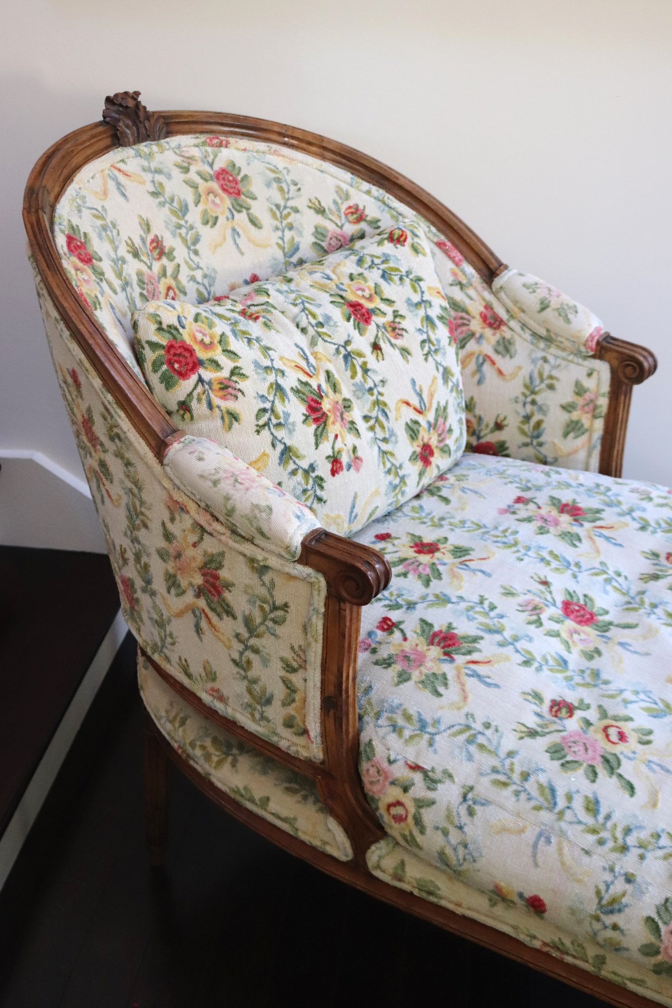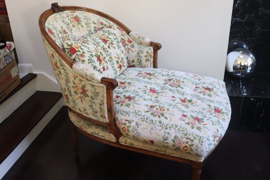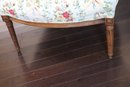 Louis XVI style semi chaise with floral fabric and wood trim. The