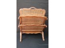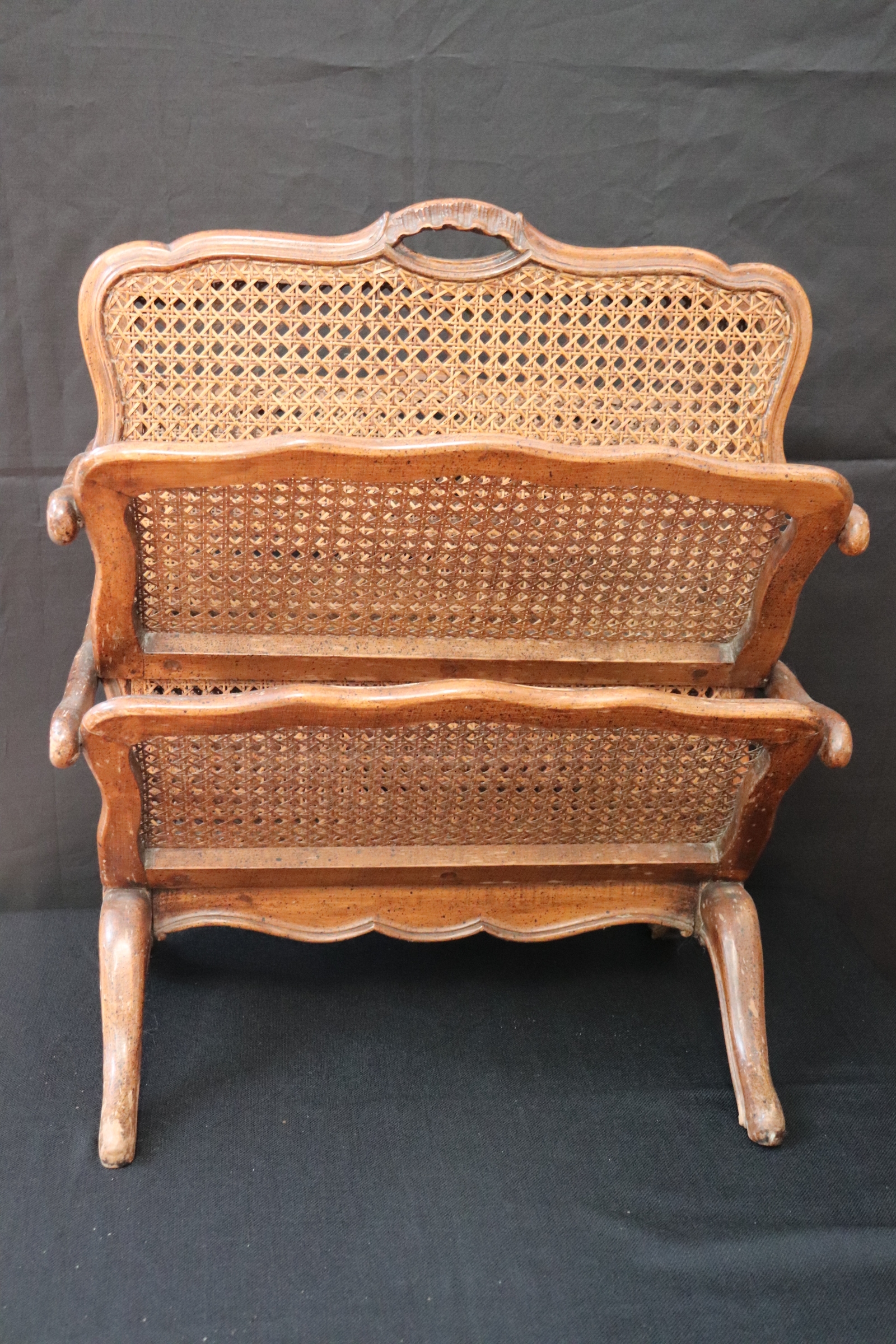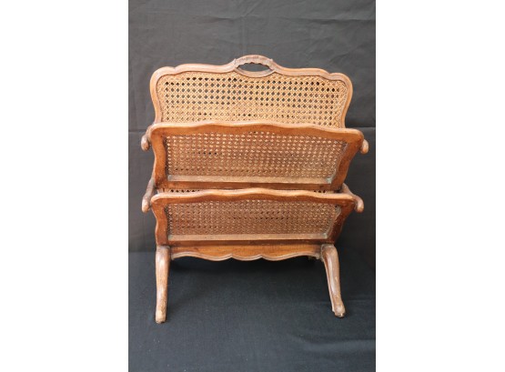 Elegant and functional caned magazine or paper holder, with some Age-Appropriate wear to wood stain on legs. Measures 22.25” L x 15” W x 27” T