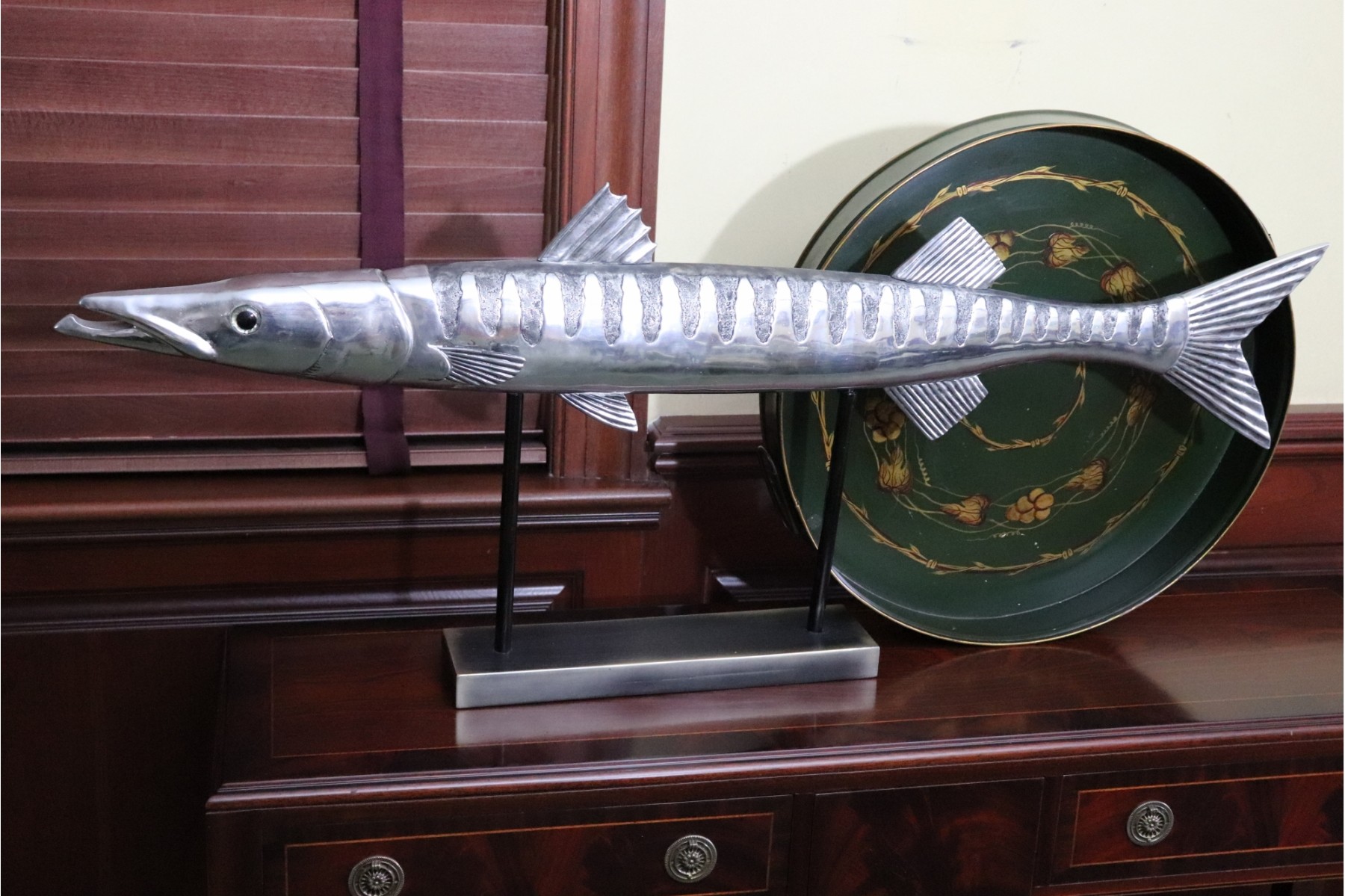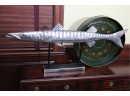 Metallic Finished Barracuda Fish Measures Approximately 38” W X 16” Tall On Stand Includes Stenciled Tole Tray With Handle.