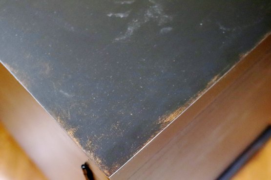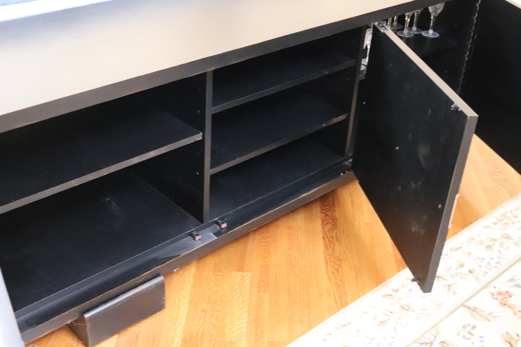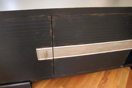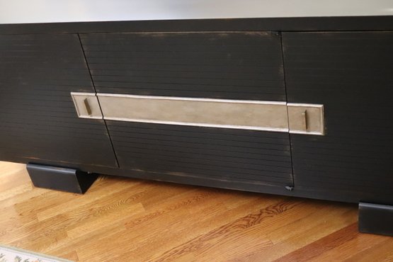 The cabinet has 3 doors with interesting silver color detailing and modern silver tone metal pulls, as well as interior shelves. Measures 76” L x 19.5” D x 28” T
