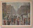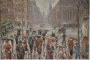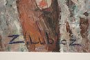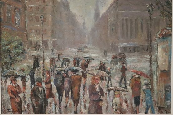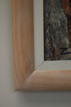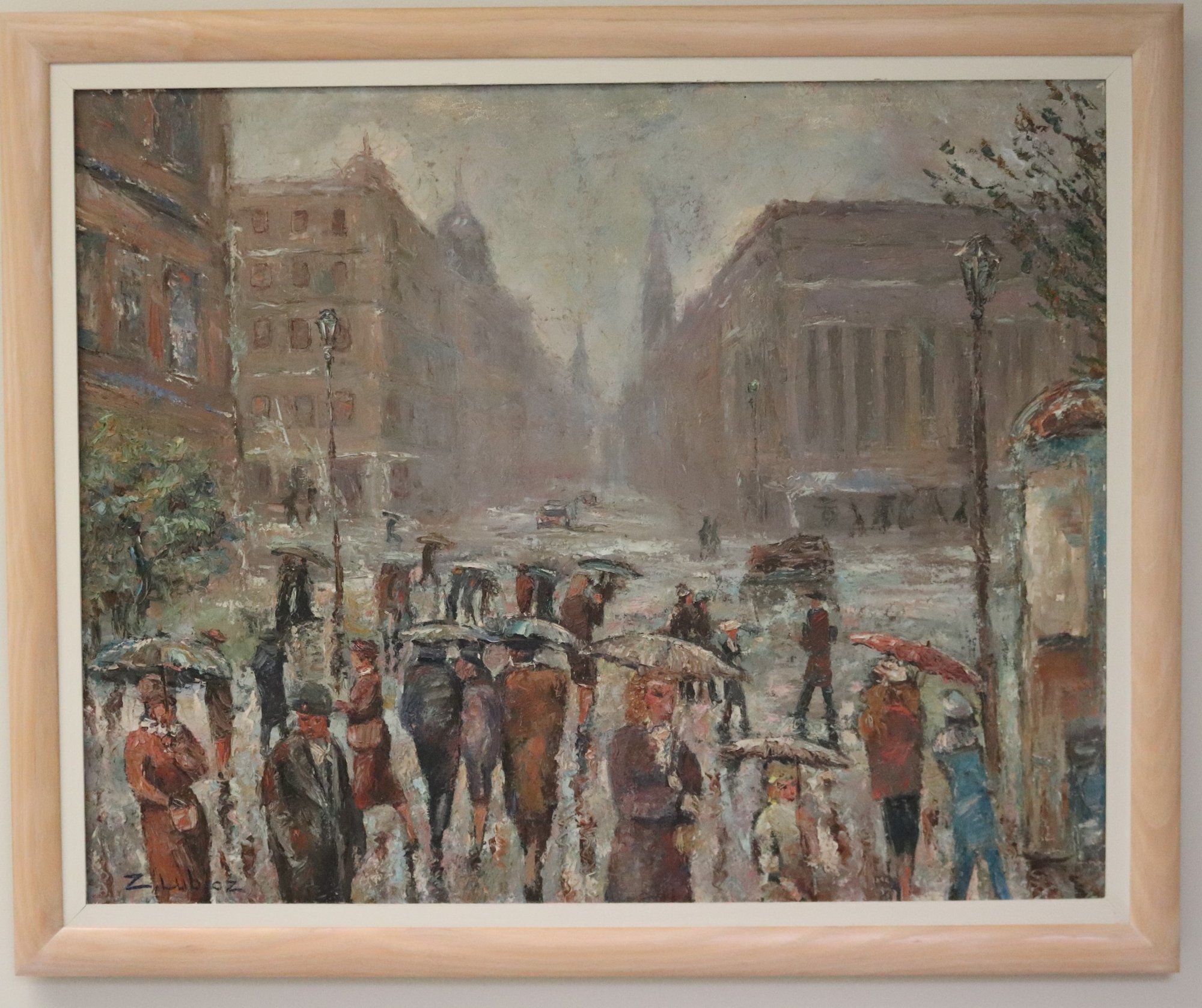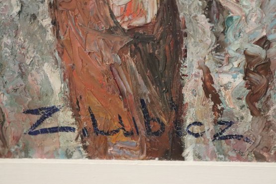 Midcentury modern painting of European street scene signed Z. Luboz. With its muted palette and textured finish, this quintessential street scene will look at home in your eclectic decor.