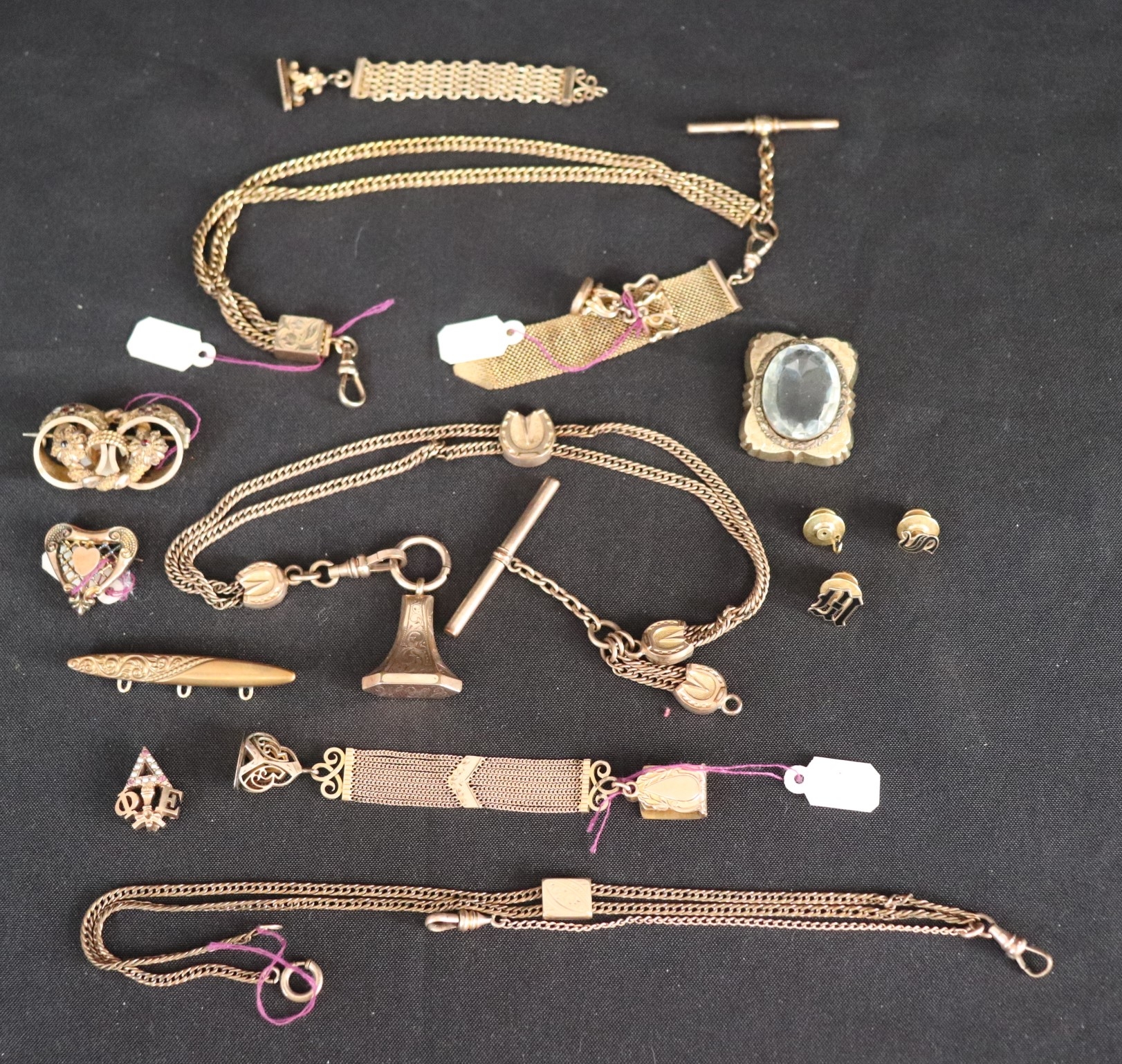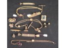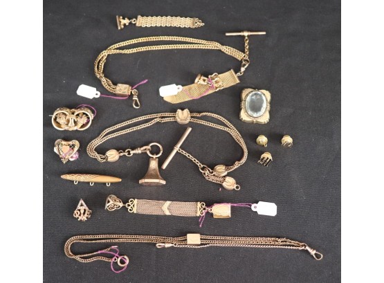 This vintage lot of antique necklaces and pin assortment includes watch fobs, pins, & tie pins. Some pieces have monograms, other have small stones, all are beautifully detailed.
