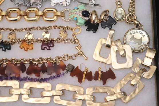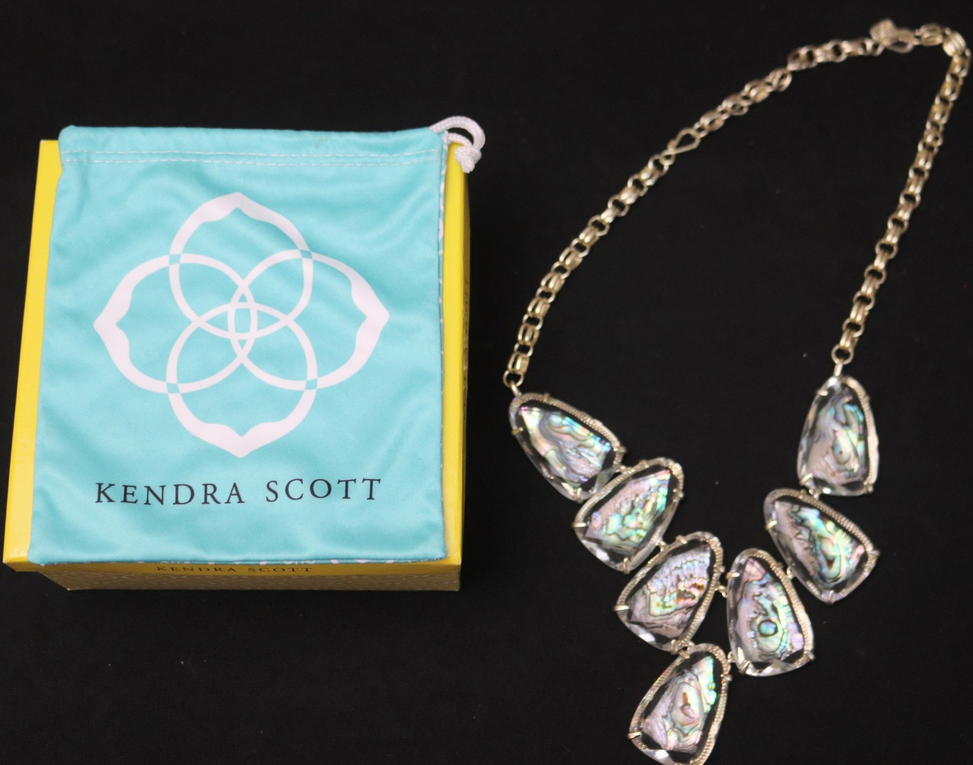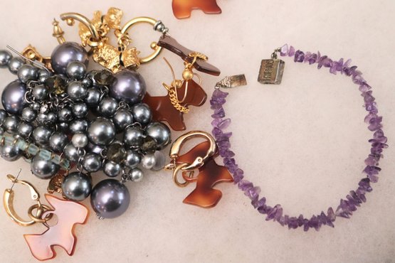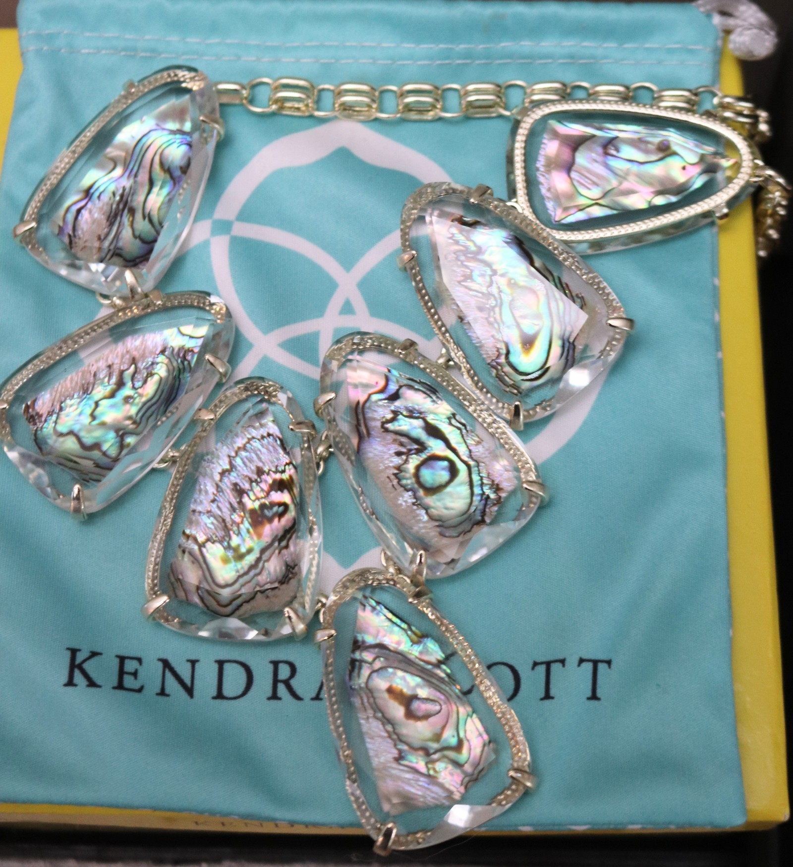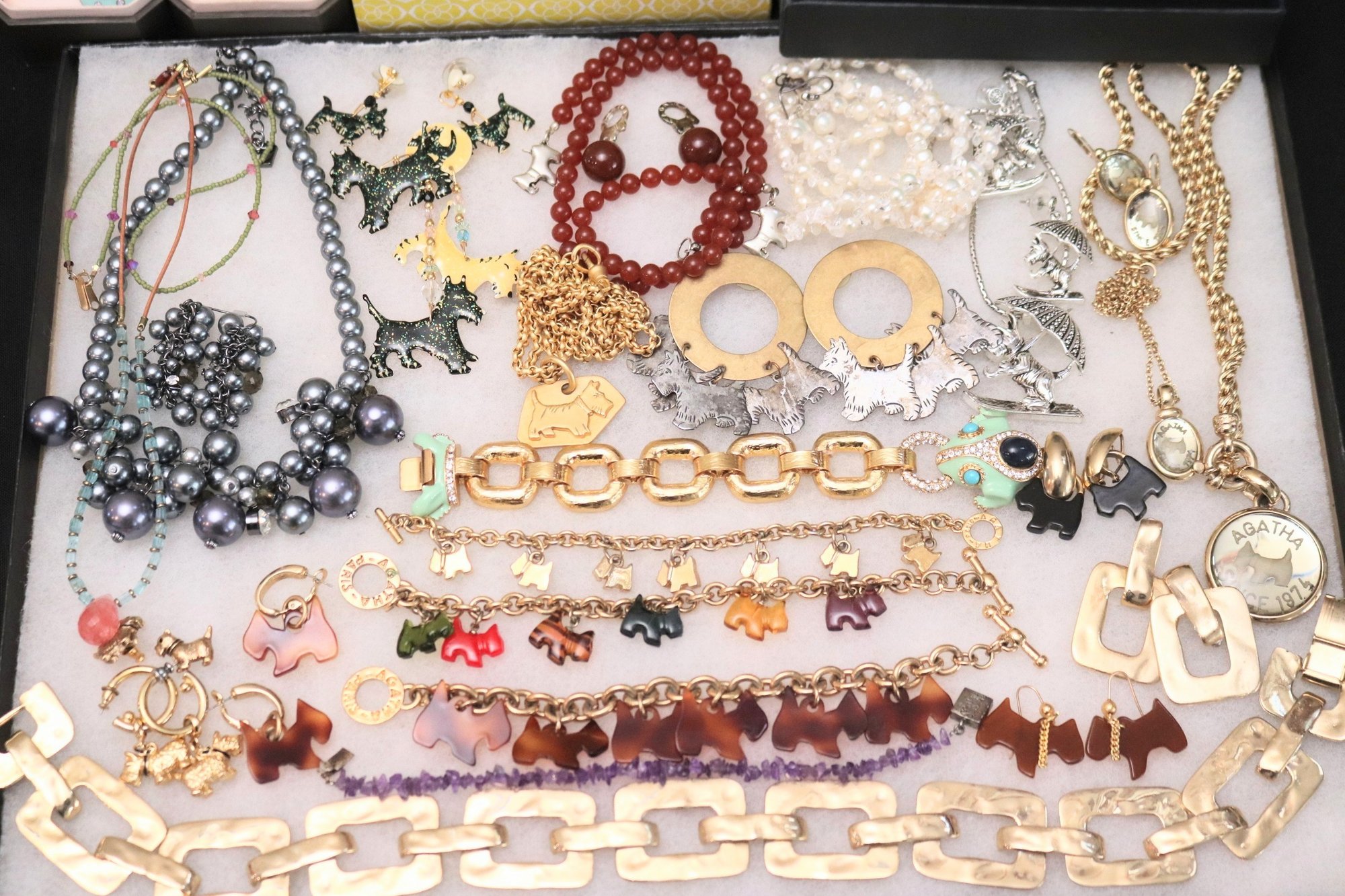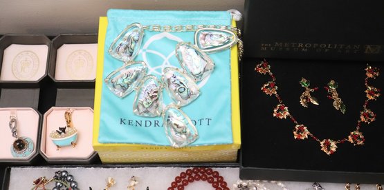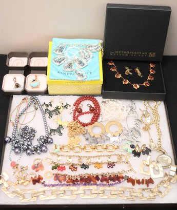 This lot of mixed quality fashion jewelry includes items by Kendra Scott, Lunch at the Ritz, Agatha, J.Crew, Holly Yashi and Susan Richardson. The necklace and earrings set in the Metropolitan Museum of Art Box are not marked MMA, they were simply placed in that box. All pieces are in working condition, some show light age-related wear.