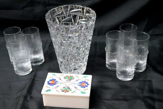 Vase is 6” x 8” T, glasses 5” T, box 5” x 3.5.”