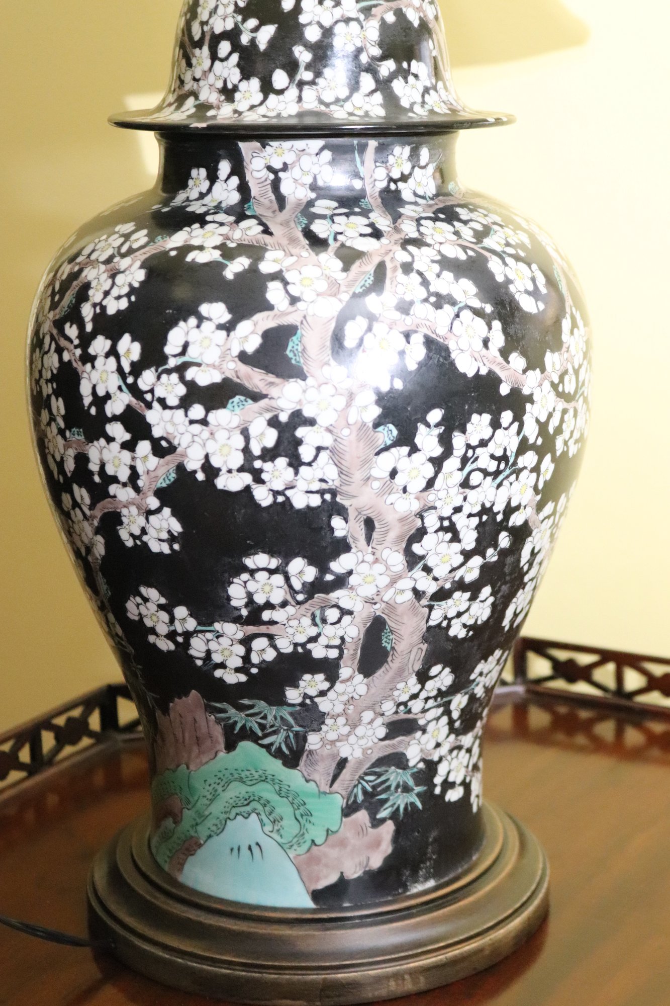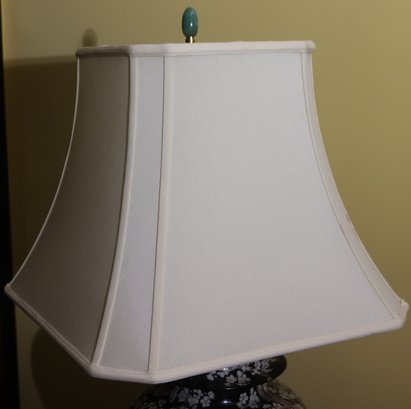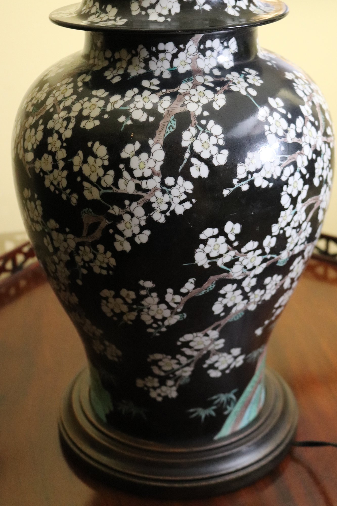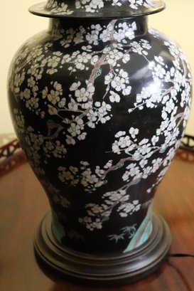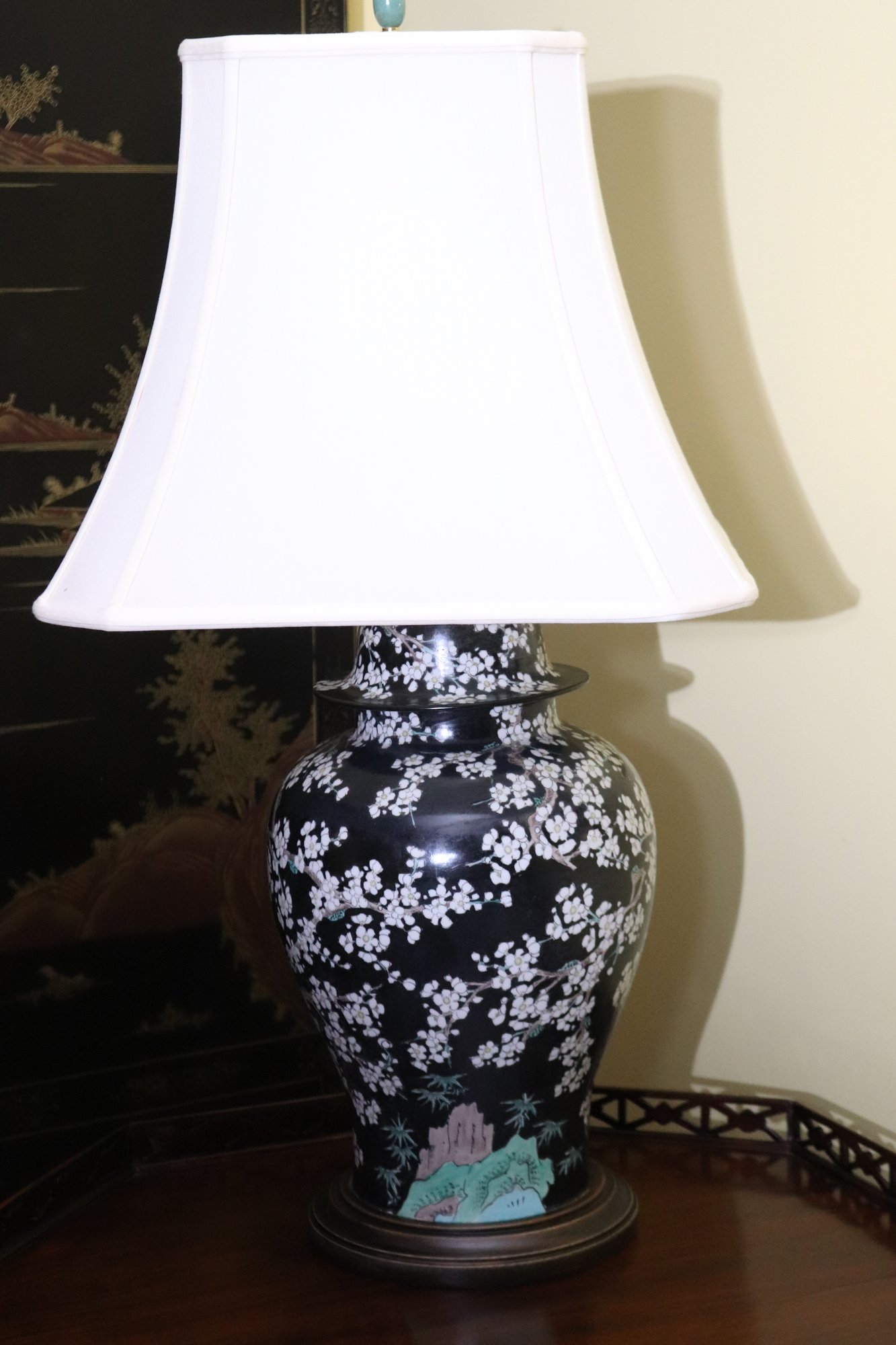Gorgeous antique Asian cherry blossom urn lamp conversion. This is a larger lamp and the urn part measures approximately 12” w x 12” d x 19” tall, this piece stands approximately 34” tall with shade and finial. Includes a fine silk shade measuring approximately 18” w x 18” d x 14.5” tall.