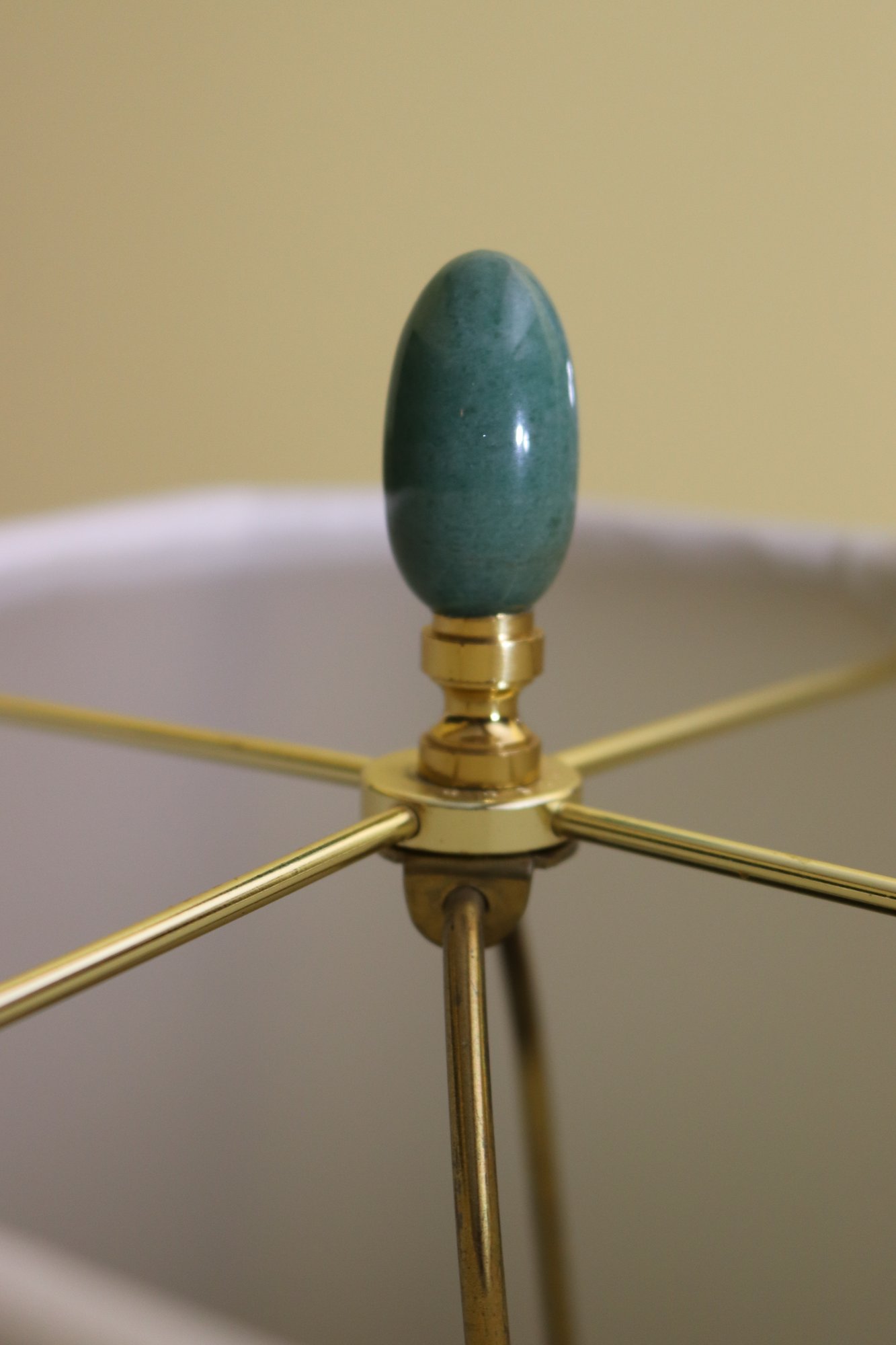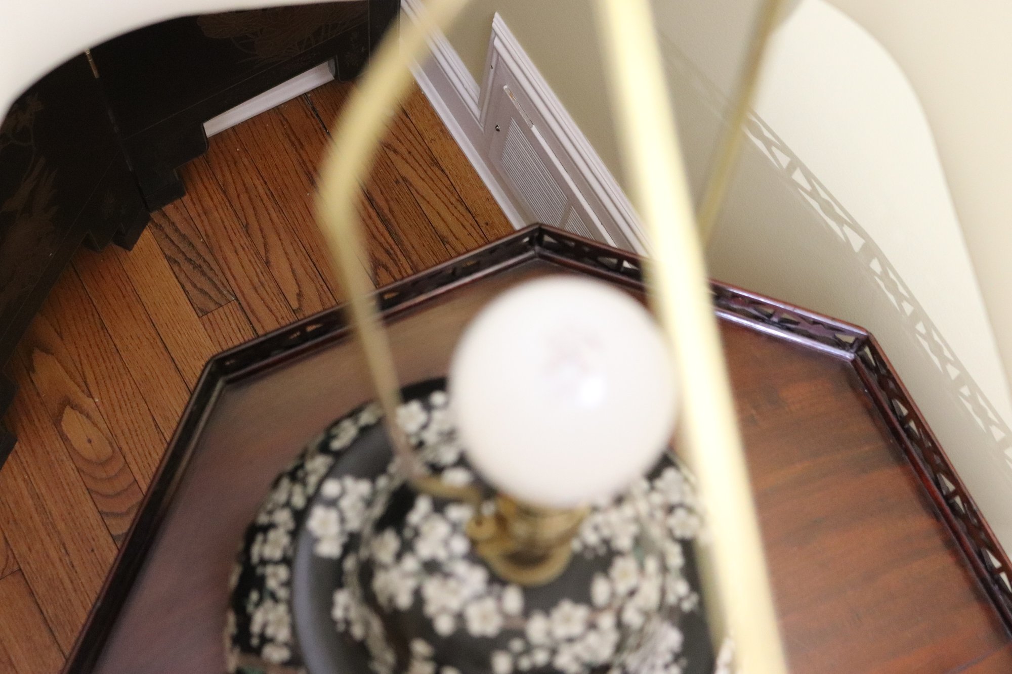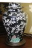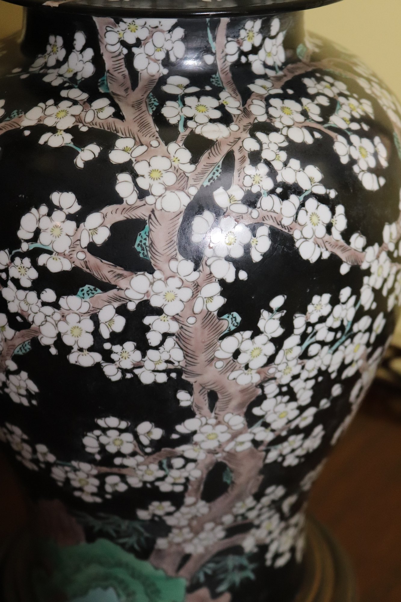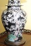 Gorgeous antique Asian cherry blossom urn lamp conversion. This is a larger lamp and the urn part measures approximately 12” w x 12” d x 19” tall, this piece stands approximately 34” tall with shade and finial. Includes a fine silk shade measuring approximately 18” w x 18” d x 14.5” tall.