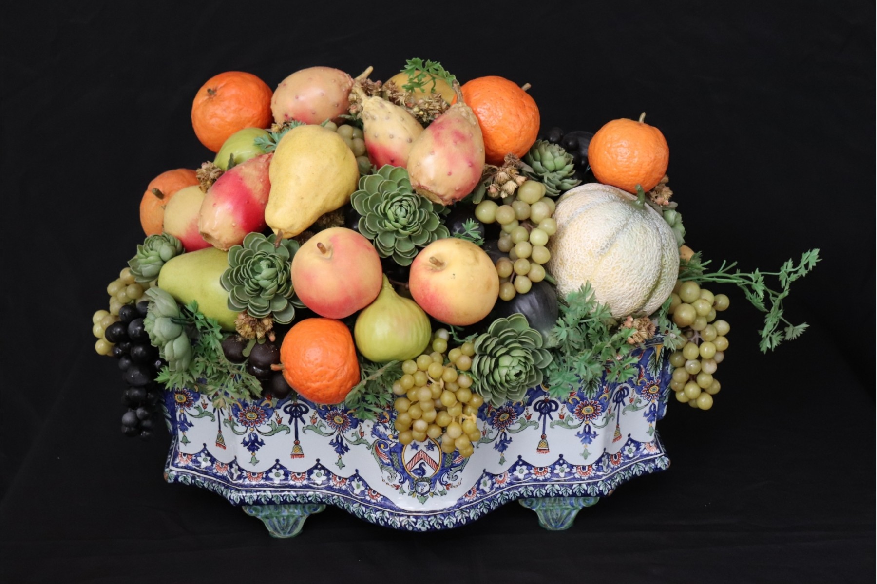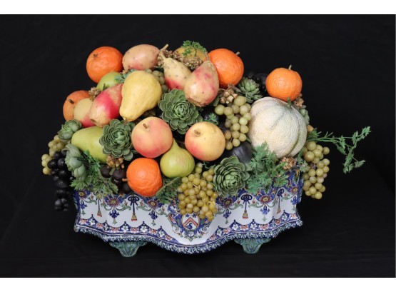 This large, hand painted centerpiece is signed on the bottom and if filled with nice quality faux fruit & succulents. The piece appears to be French and measures approx. 20” L x 12.5” x W 14” T