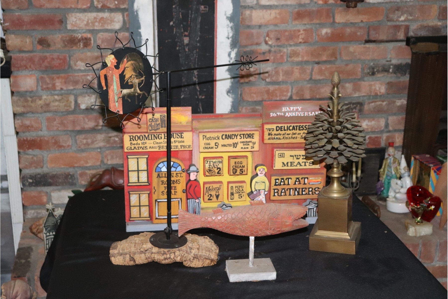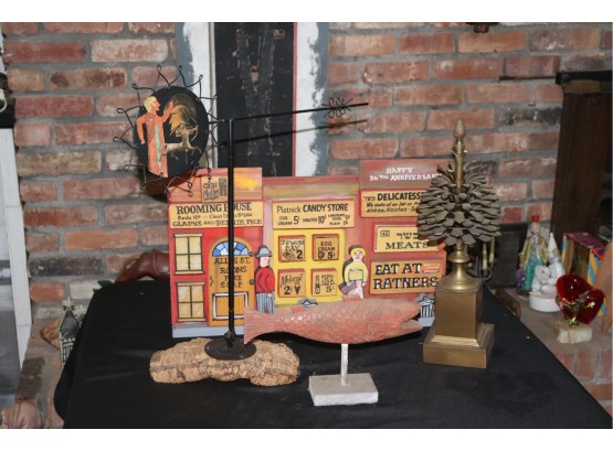 Original Harry Glaubach 1984 Hand Painted Folk Art Wood Sign, Brass Lamp Piece & Carved Fish Piece