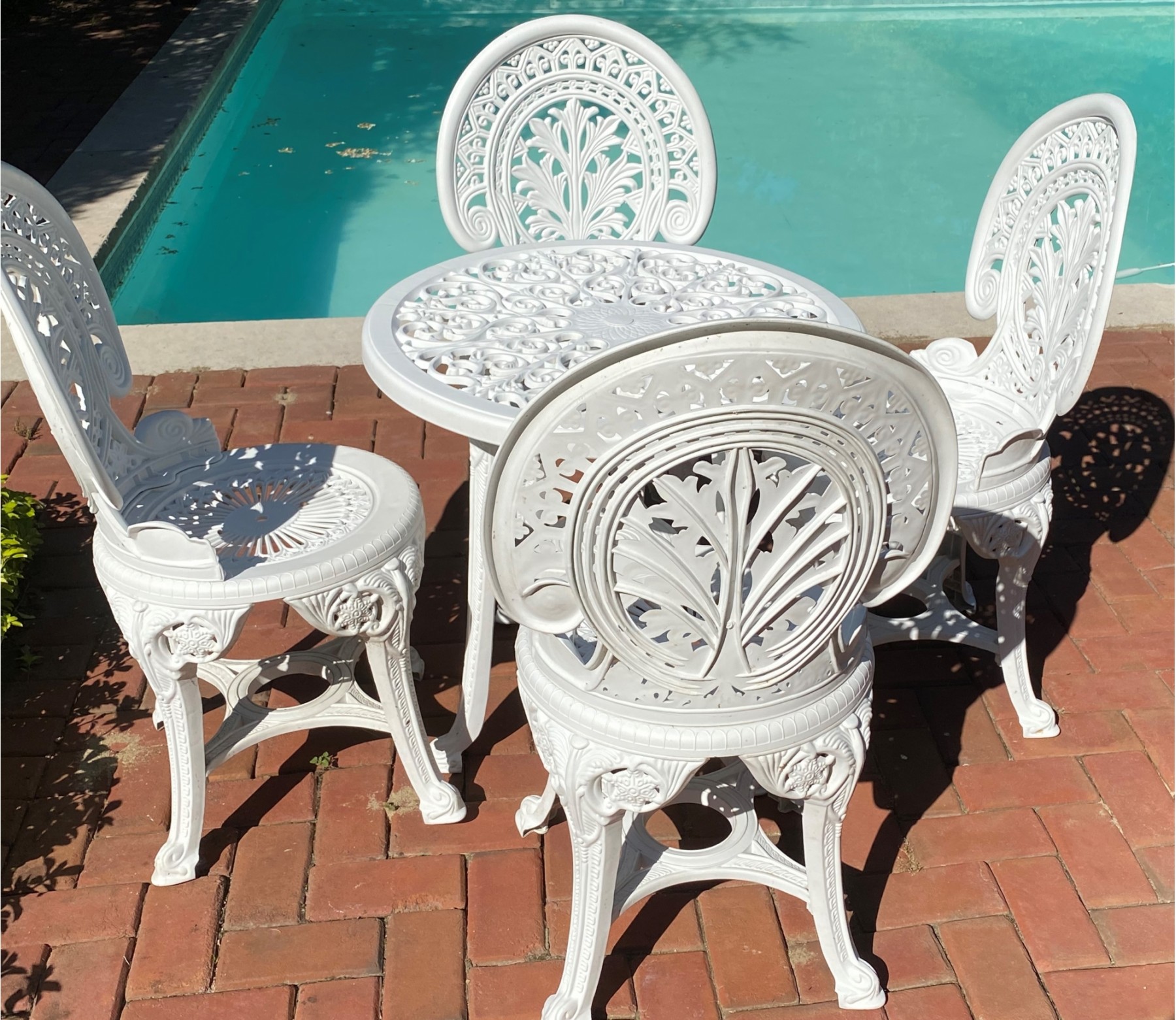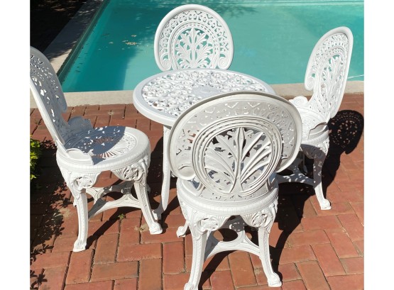 Ornate Plastic Outdoor Bistro Set With 4 Chairs 26” Diameter Table X 26” Tall.