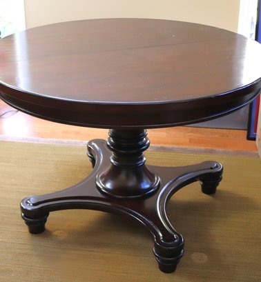 Pottery Barn Montego pedestal round dining table. The top surface does show some surface scratches as pictured. Includes an extra leaf that is 20” wide as pictured. The table measures approximately 45” diameter x 30” tall.