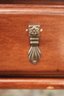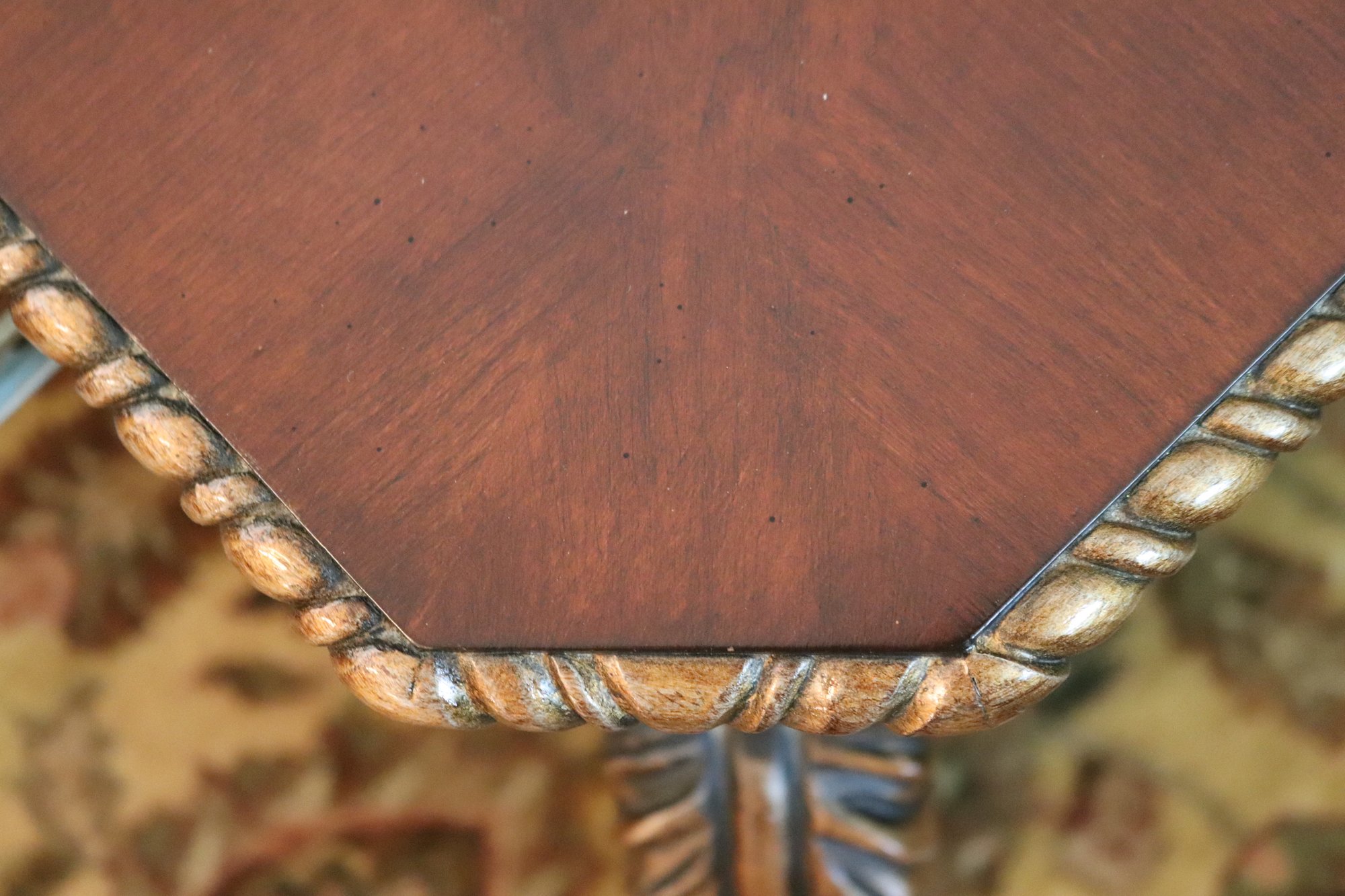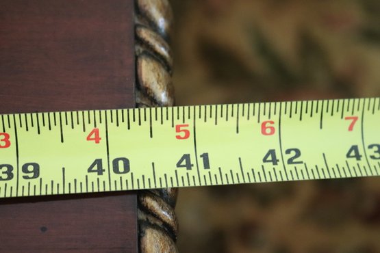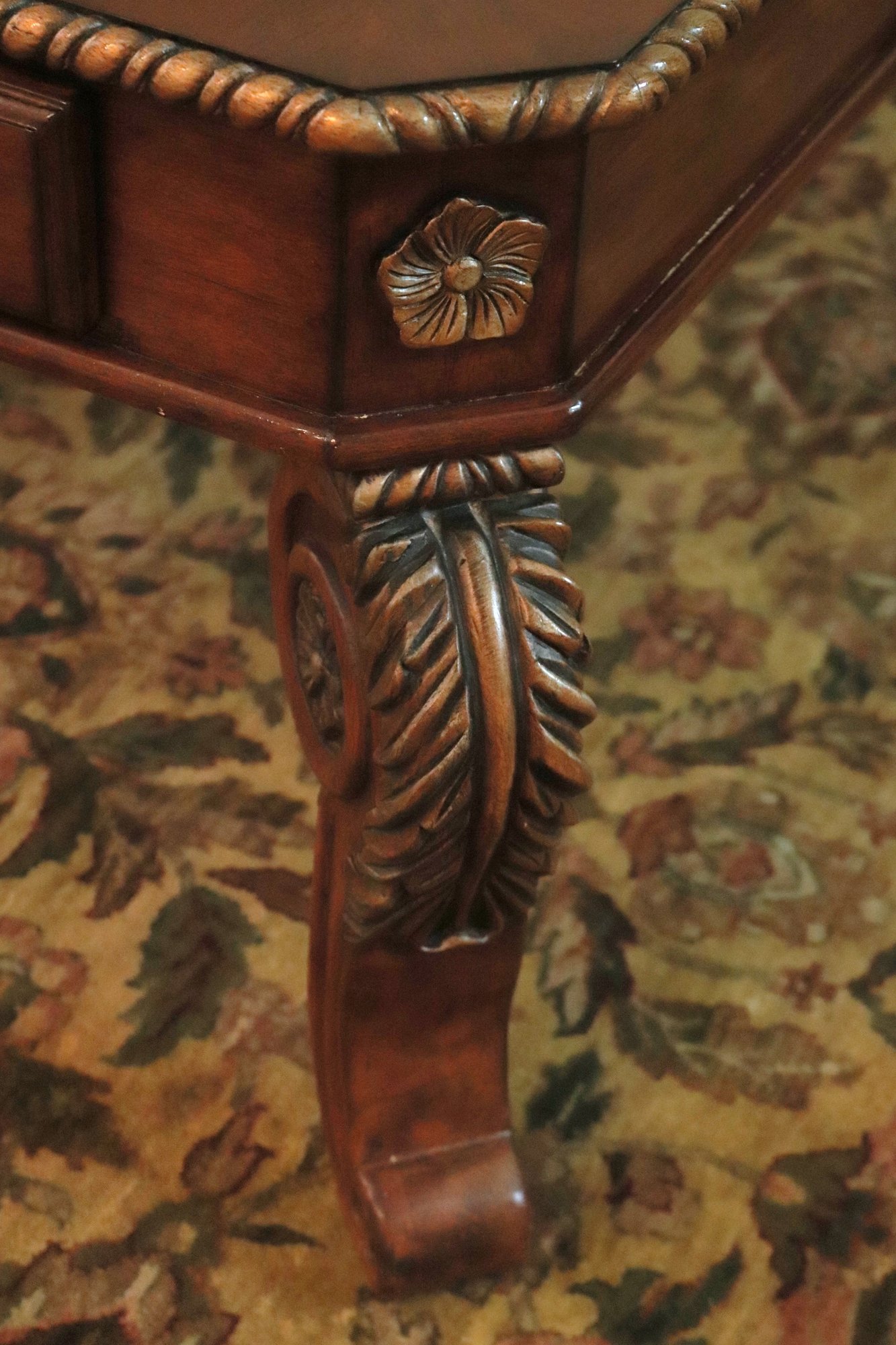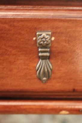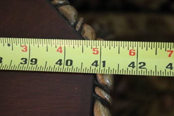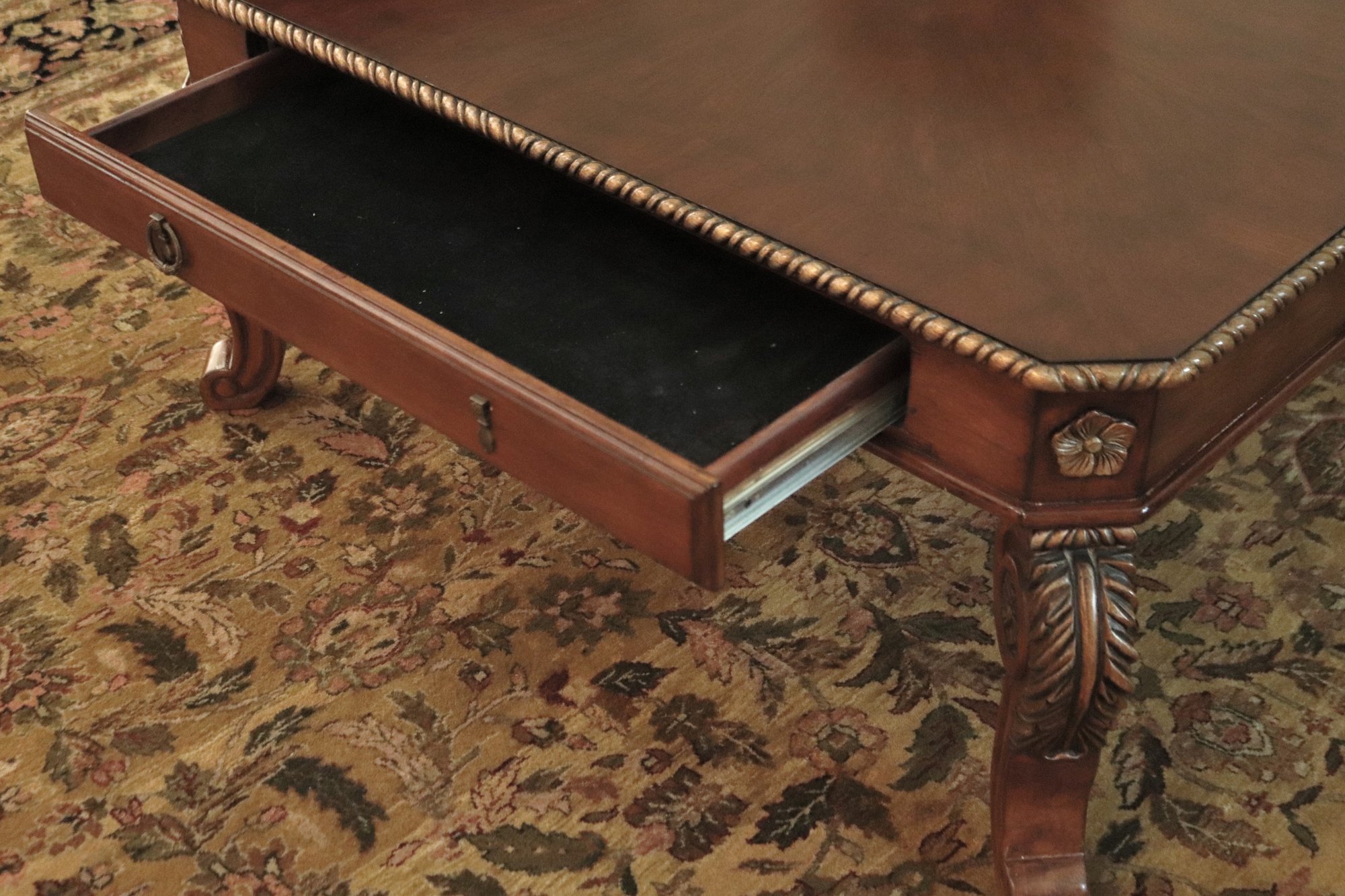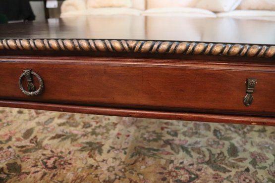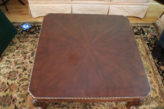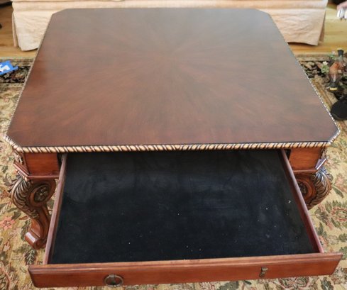 Quality carved wood coffee table with storage drawer measuring approximately 41” w x 41” d x 19.5” tall, please note there is a missing ring on the front drawer as pictured .