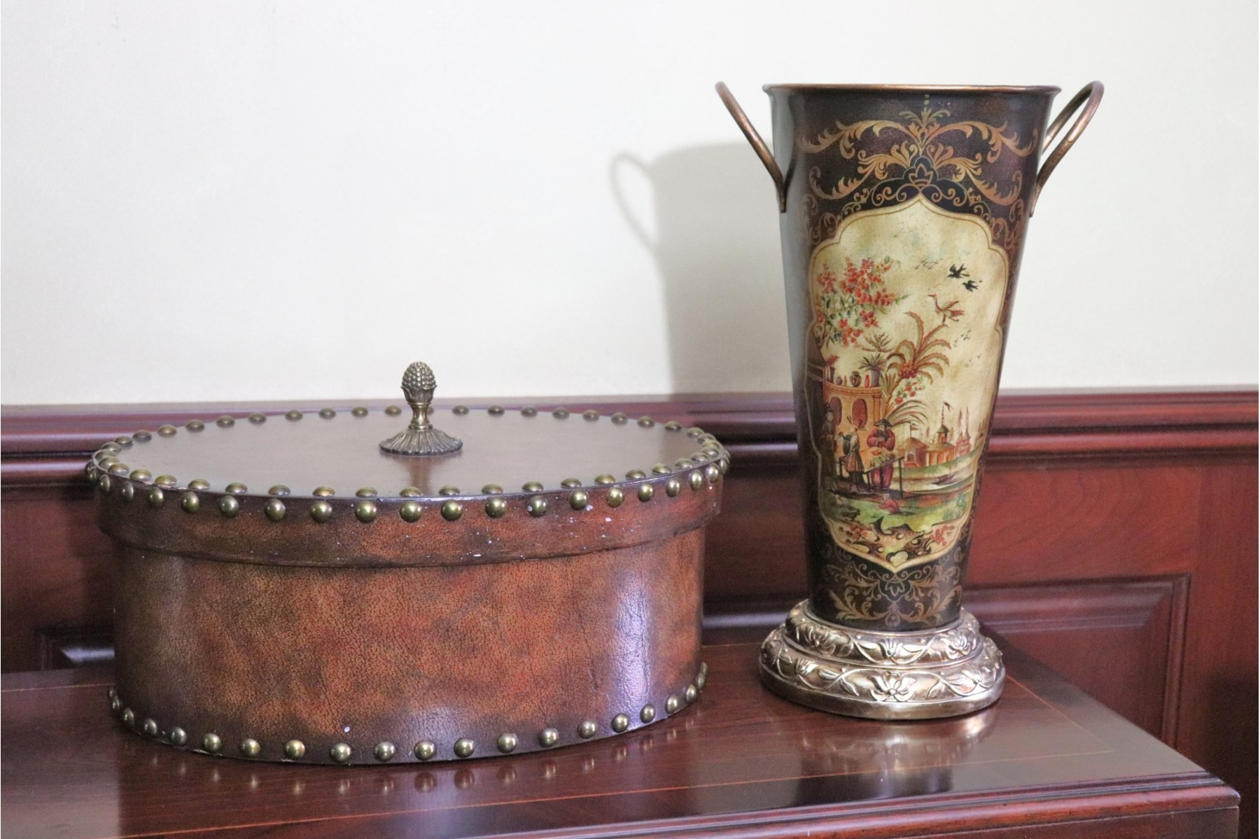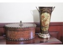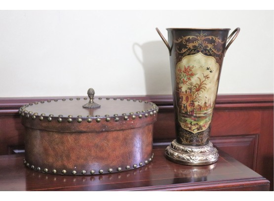 Collection Includes A Quality Leather Wrapped Box With Nail Head Detail And Acorn Handle. Measures Approximately 14” W X 10” D X 6” Tall Metal Vase With A Beautiful Asian Scenery 14” Tall With Handles.