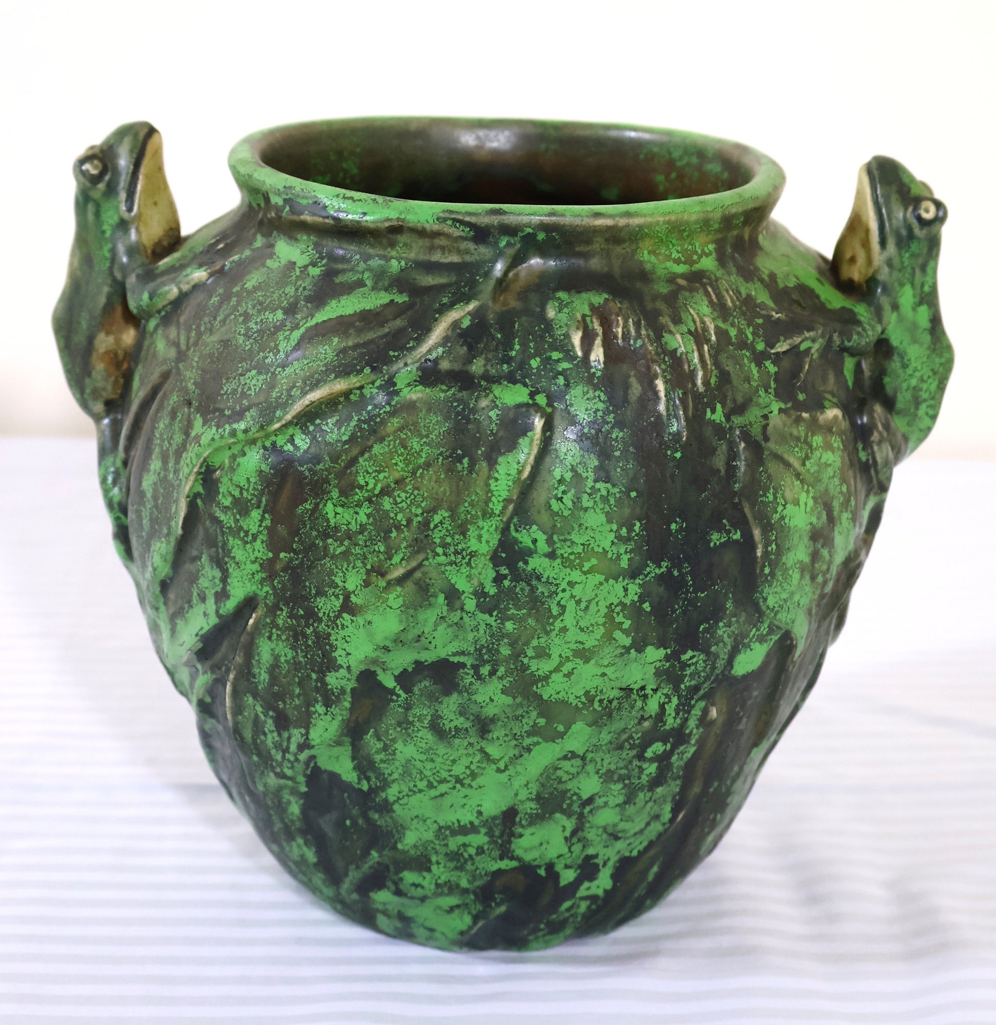 Rare Weller Coppertone 1920’s arts and crafts pottery vase with frog handles. Overall, 8.5”x 8” T