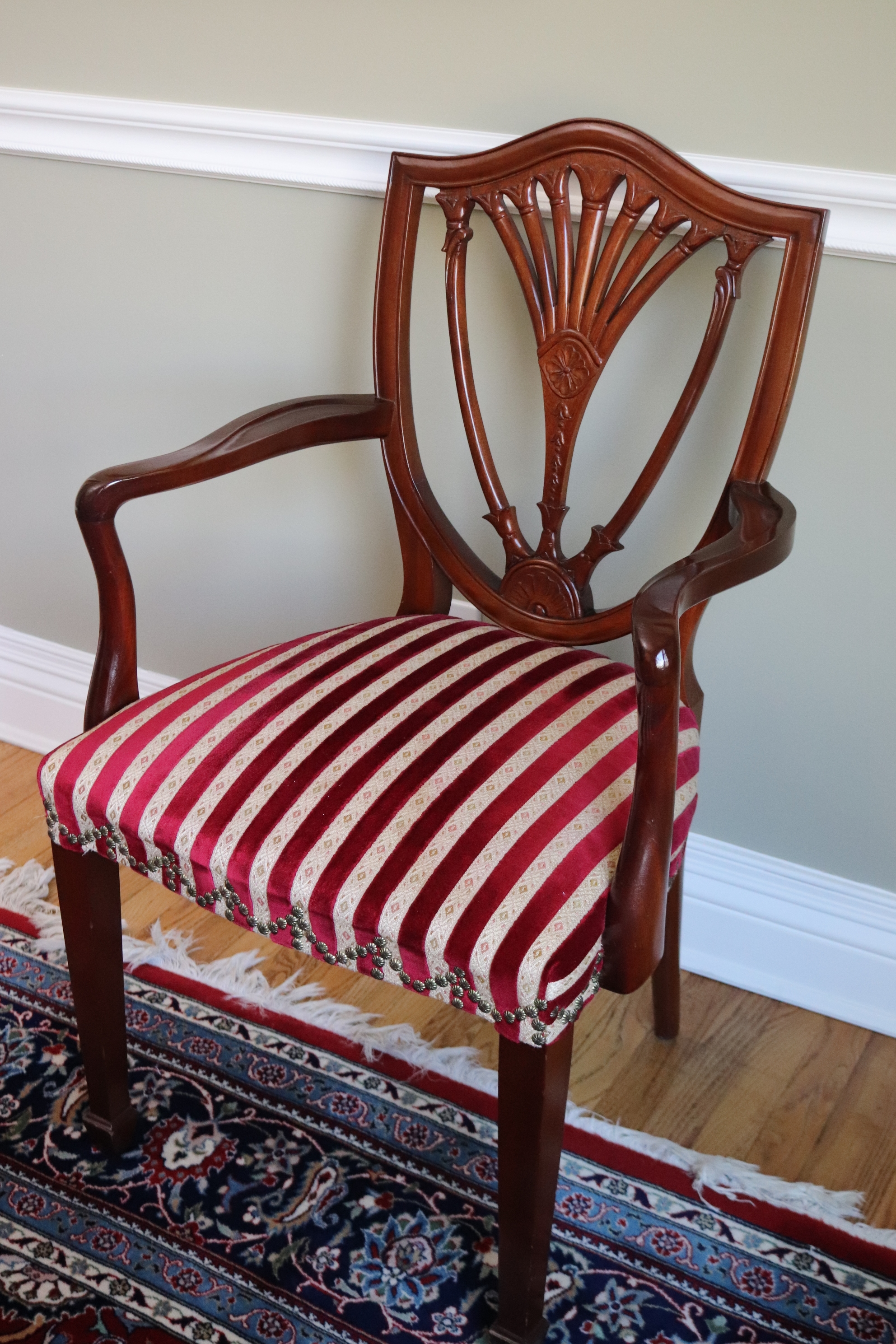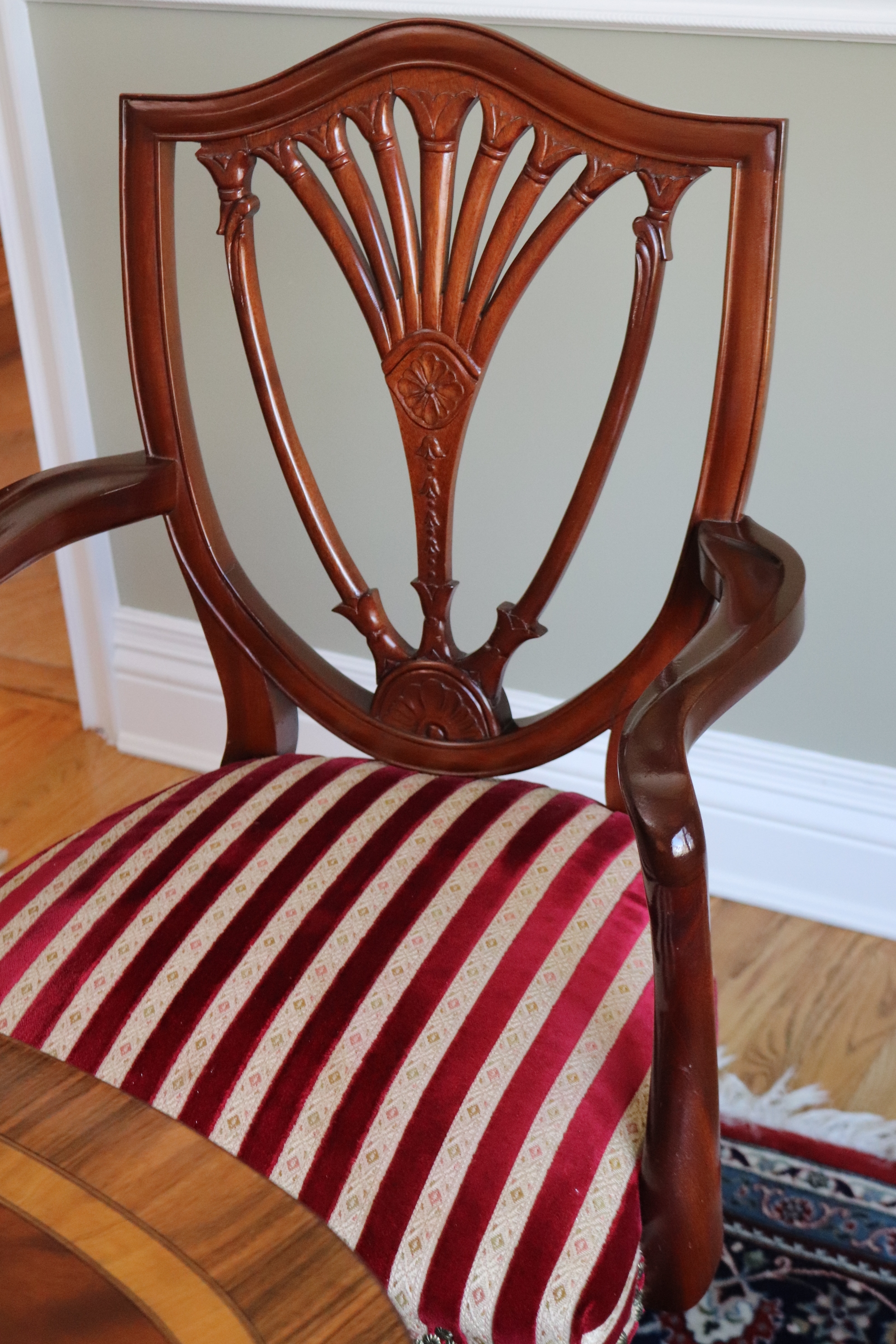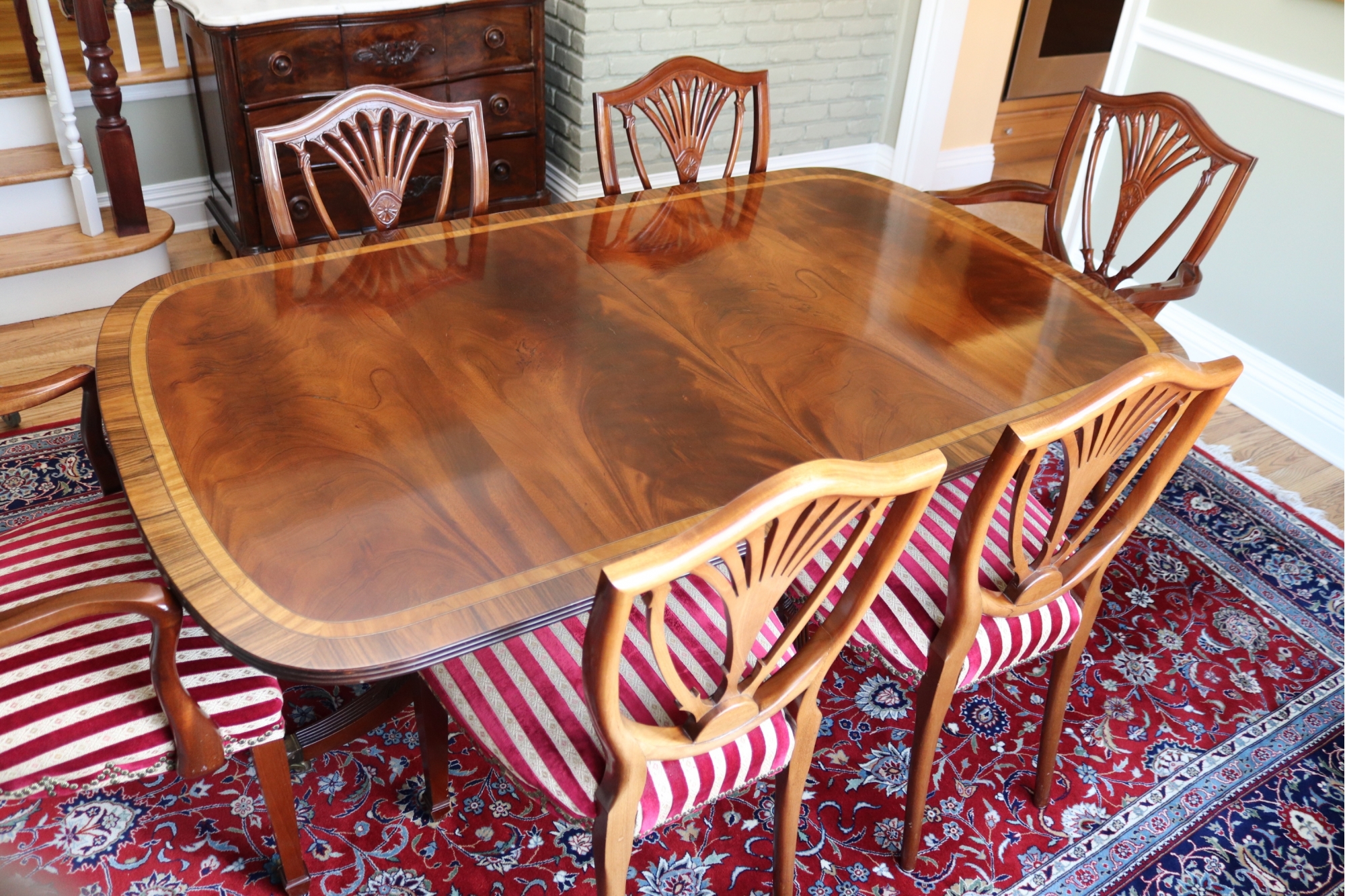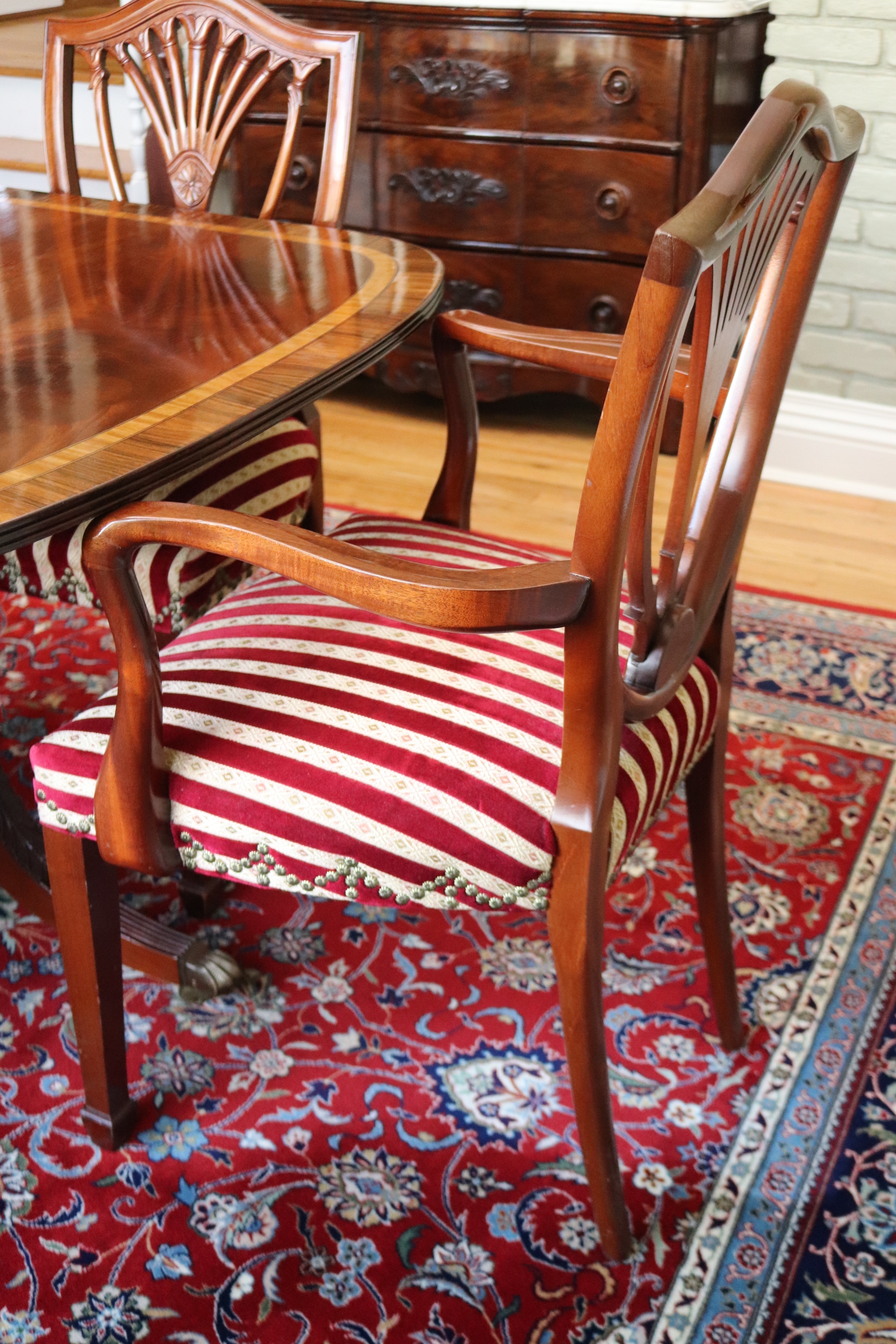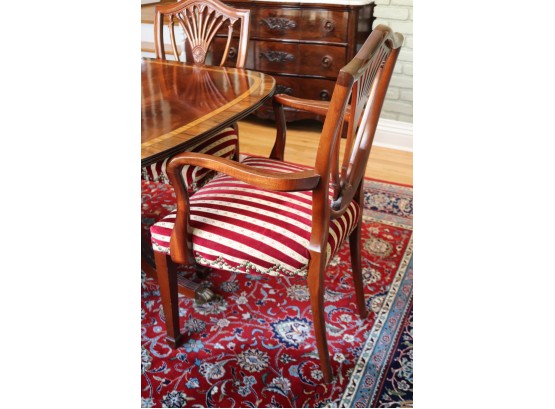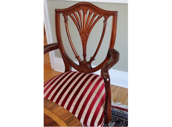 chairs. There are 2 shield back armchairs & 4 side chairs. Seat fabric very clean! Dining Table