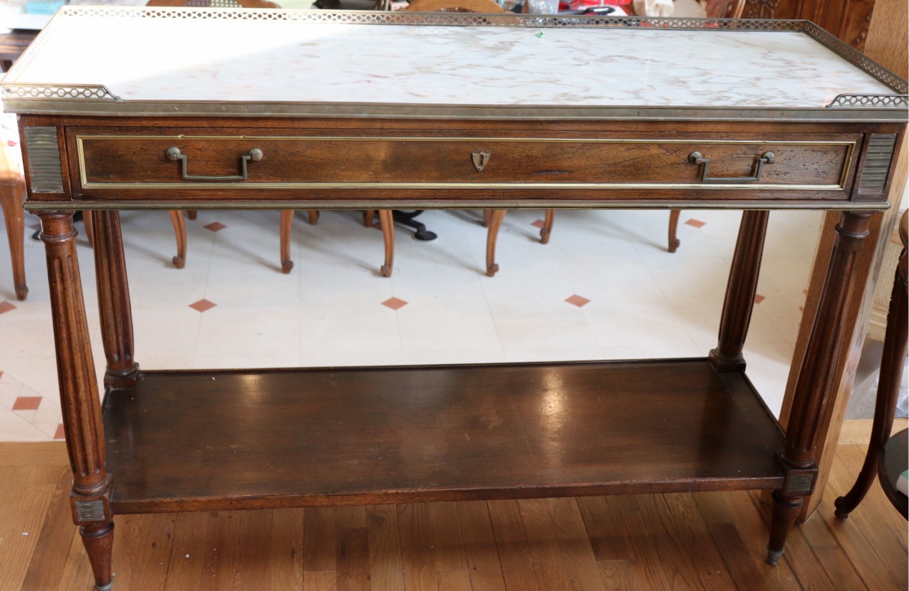 Vintage Regency style Console table with marble top and brass trim. Console has 1 drawer & shelf. Nice, pierced brass gallery surrounds the marble. Some Age-Appropriate Wear & patina to brass edging, and some old light spots shelf. Please see photos for more details. Measures 48” L x 16.5” D x 34.5” T
