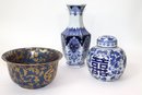Pretty blue & white Asian style vase & ginger jar with lid. The vase is approximately 6” w x 13” tall, ginger jar is 7” w x 7” tall includes a blue and gold tapestry style bowl that is 10” diameter x 5” tall.