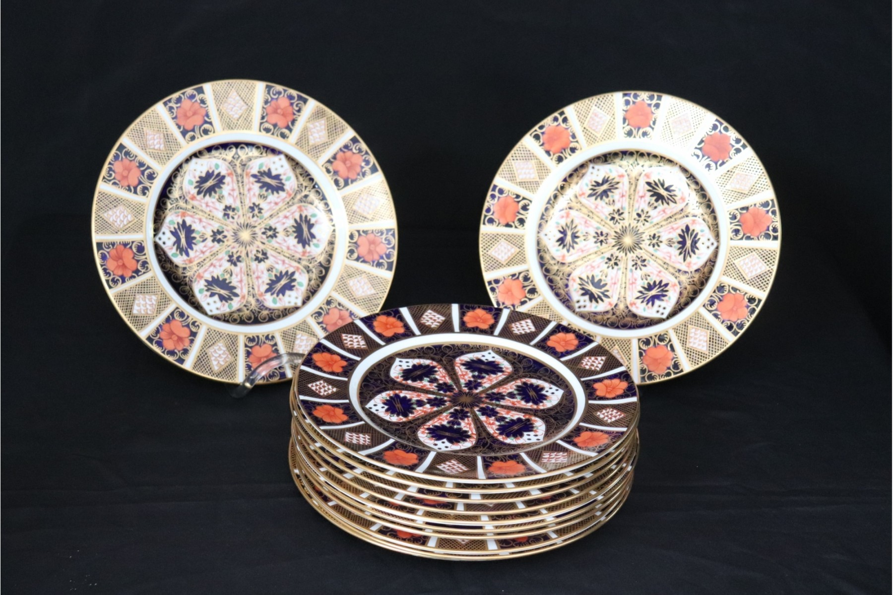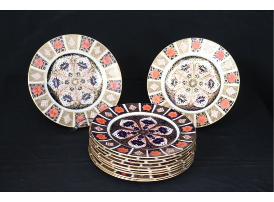 This is a wonderful set of fine bone China, by Royal Crown Derby, hand painted in an Imari style pattern. The plates measure 10.75” Dia.