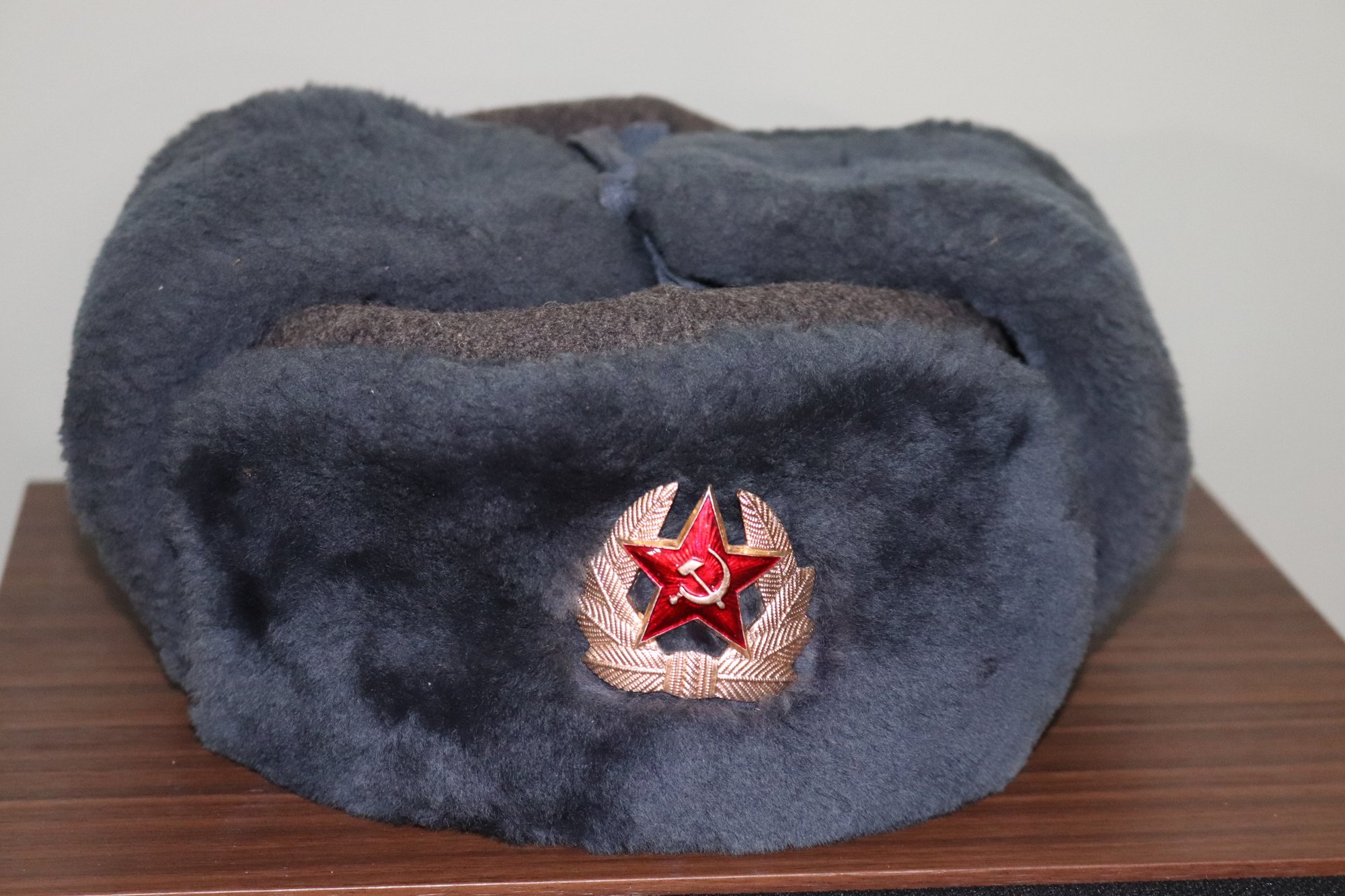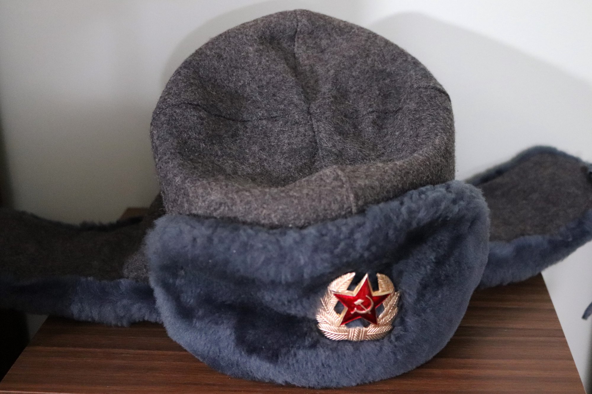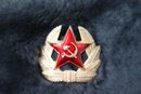 Russian communist era wool hat with hammer & sickle pin & ear flaps