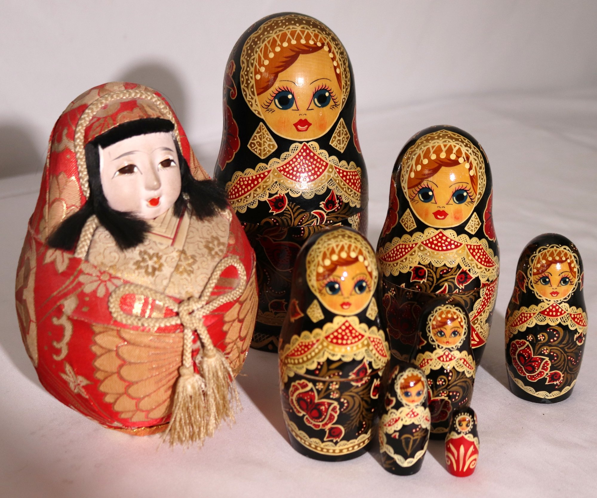 Russian nesting doll measures approximately 4” w x 8.5 tall, Includes an Asian doll with a small chip on the eye as pictured.