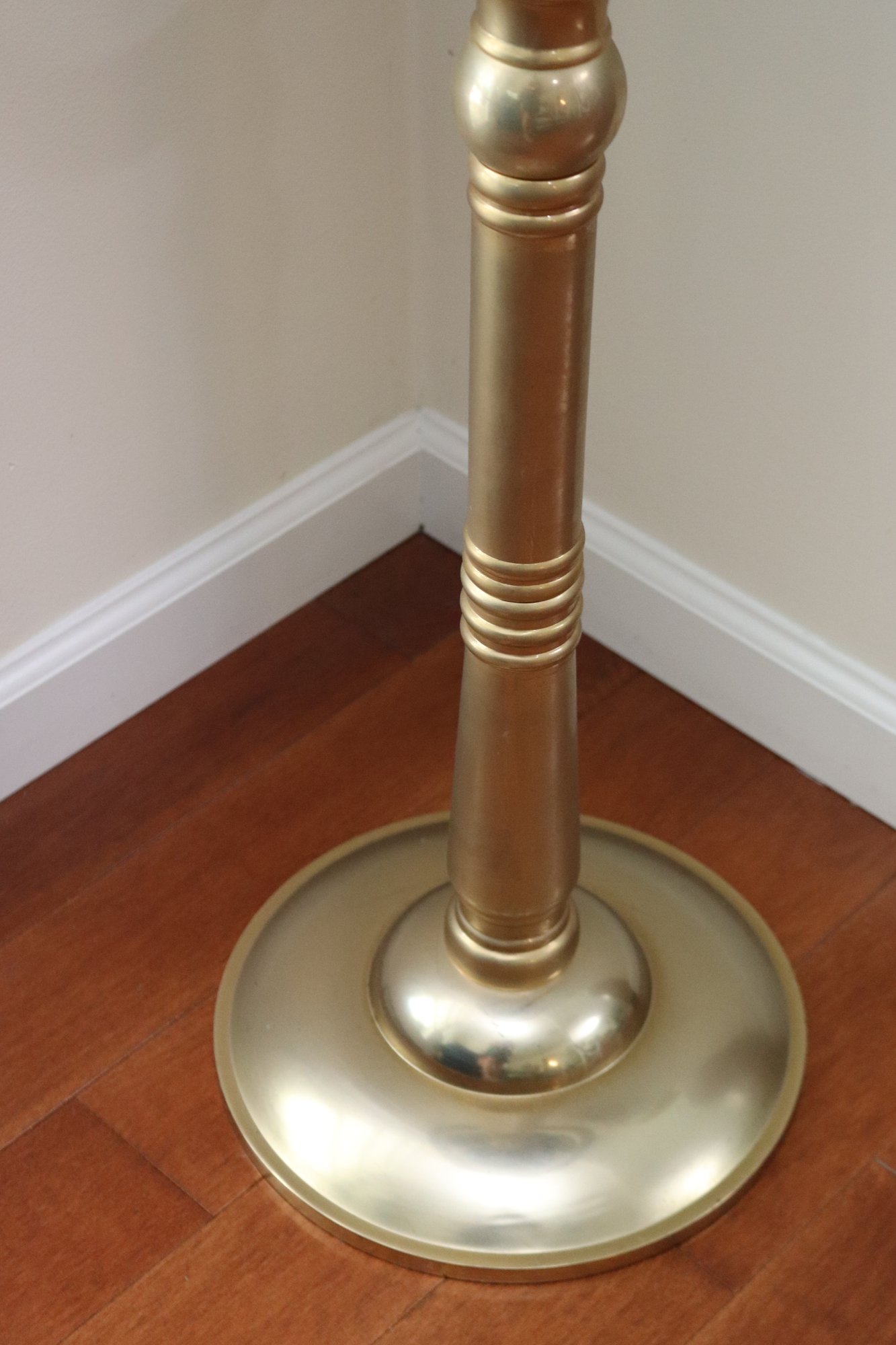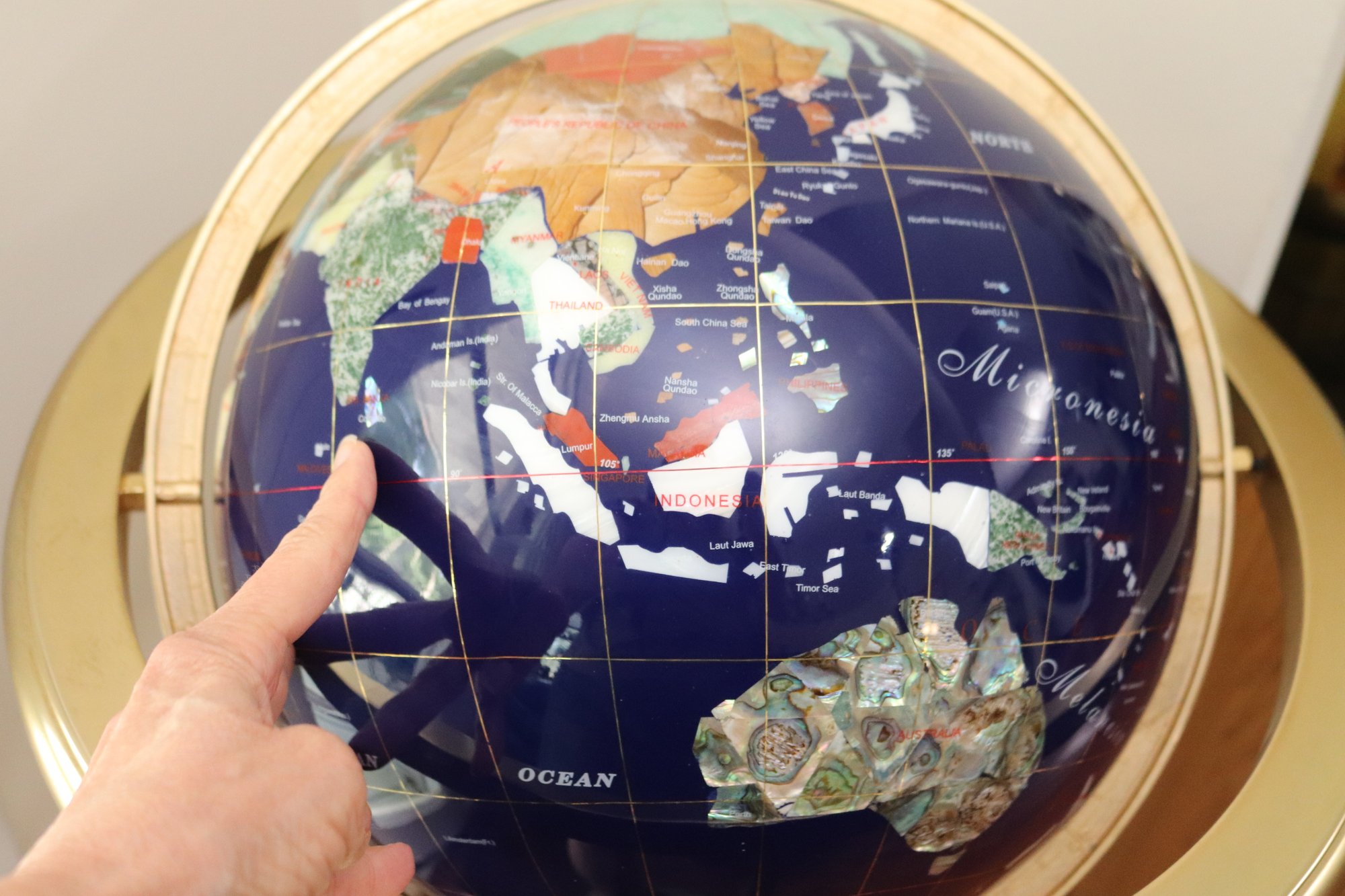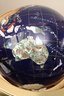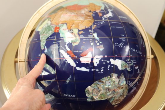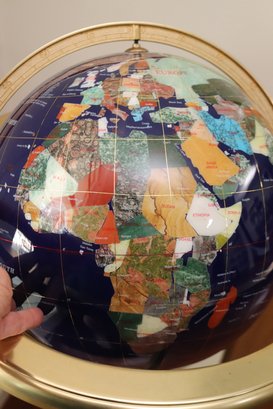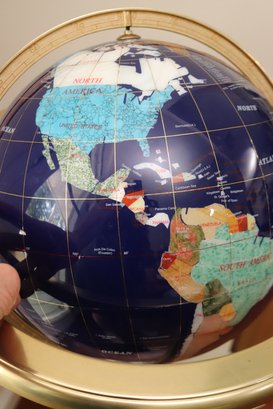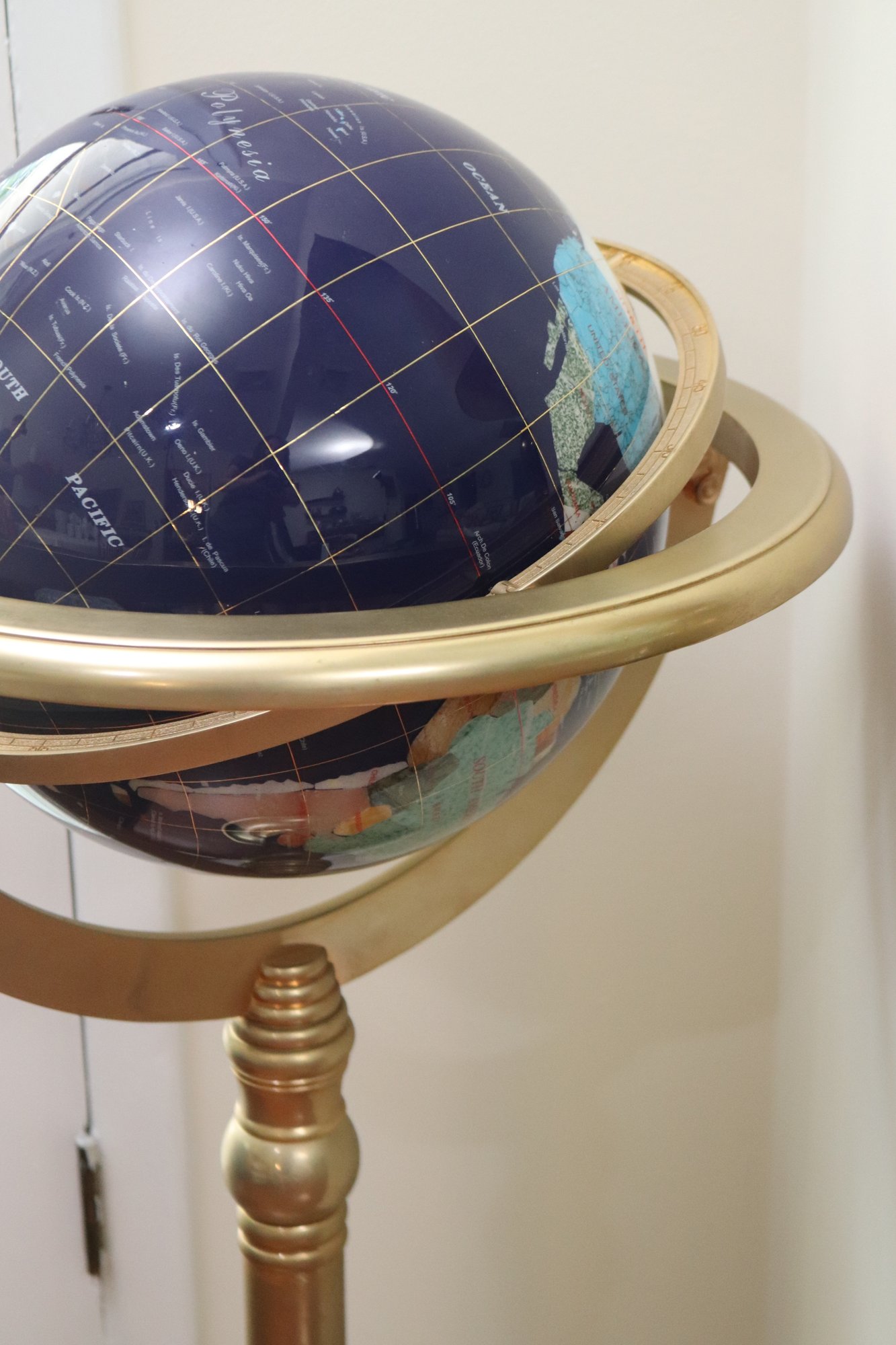 Semi-precious globe on brass base measuring approximately 18” w x 18” d x 42” tall.