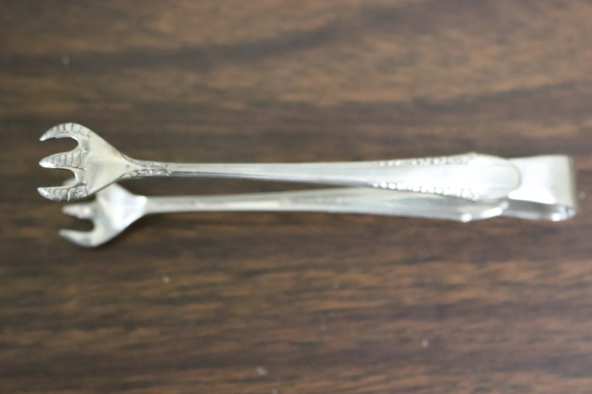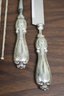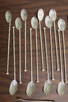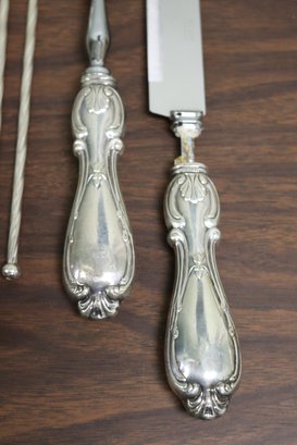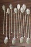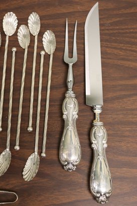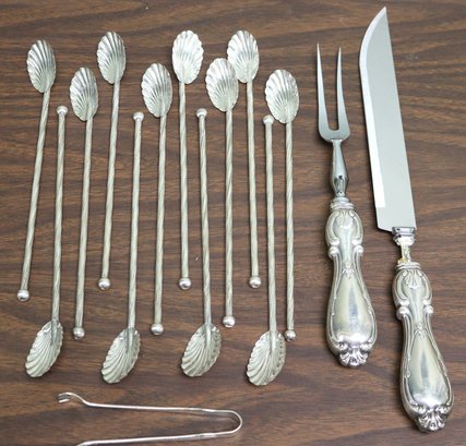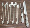 Set of 12 Sterling silver lemonade sipping spoons, SS sugar tongs & serving knife, and fork with sterling silver handles.