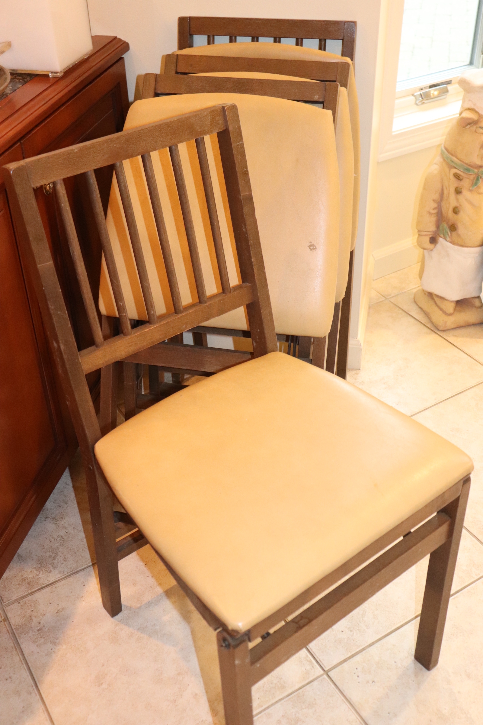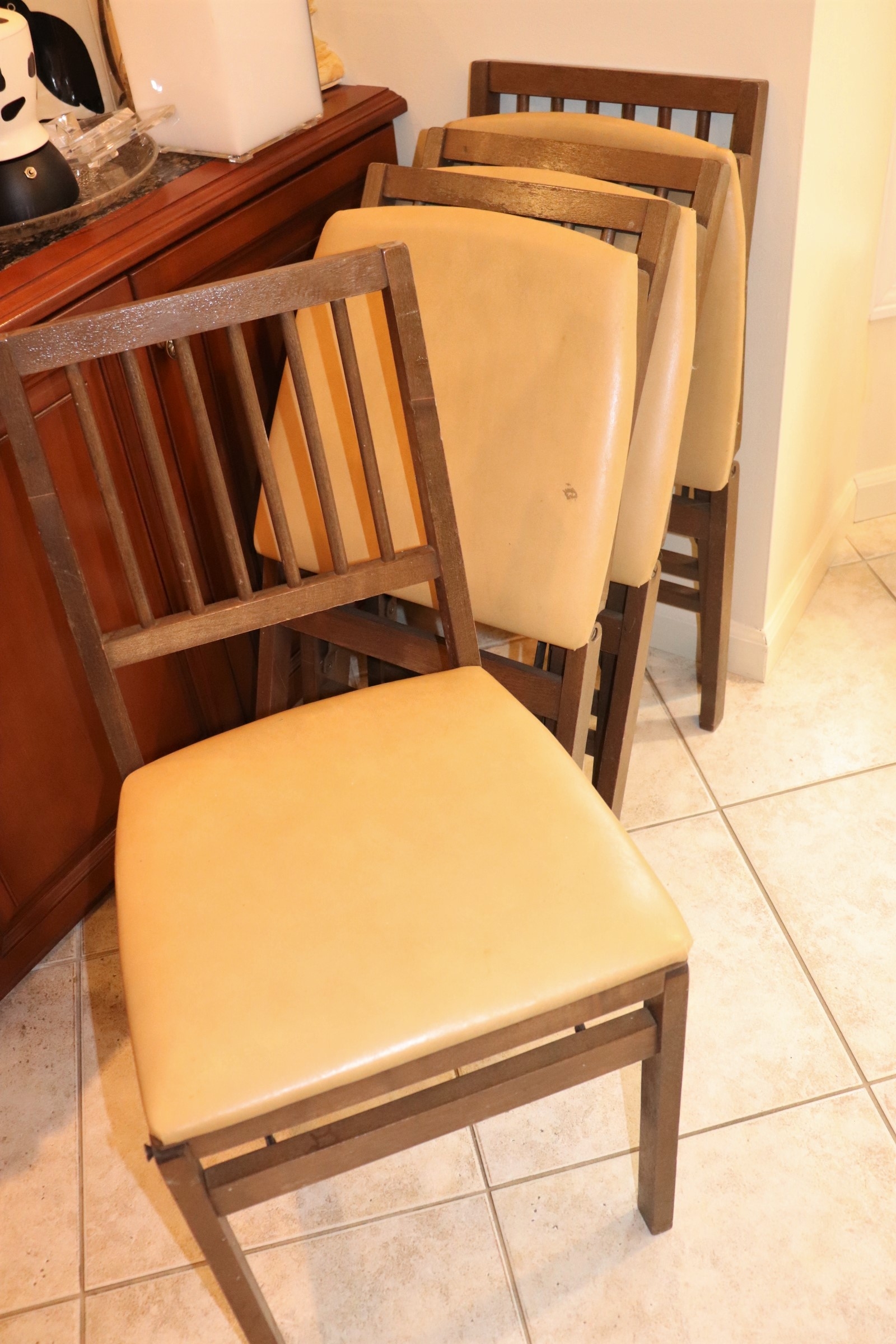 Set Of 4 Folding Chairs With Cushions Showing Some Light Staining On The Cushion. Chairs Measure Approximately 17” X 17” X 34” Tall. Great For Holiday Parties.