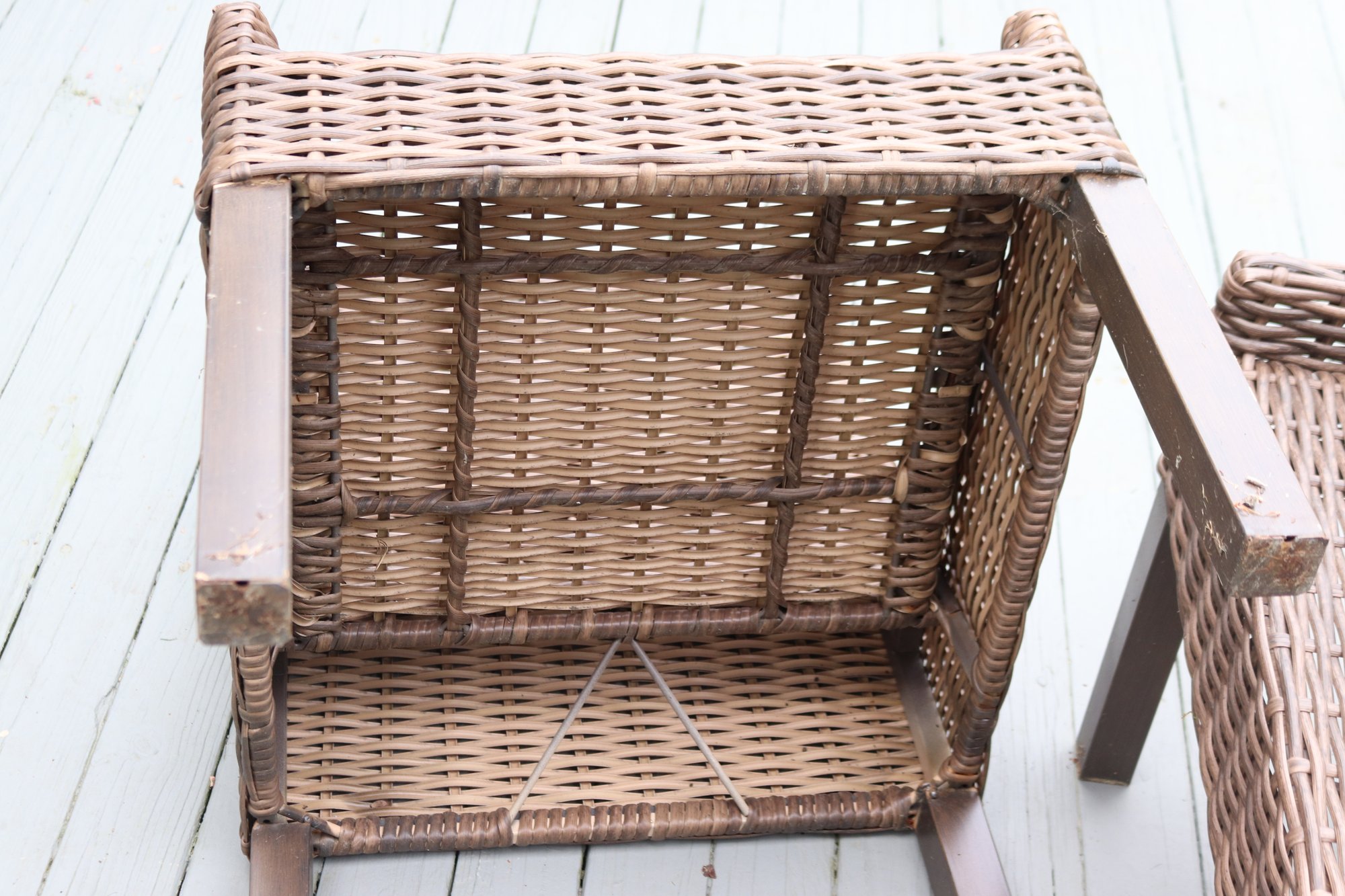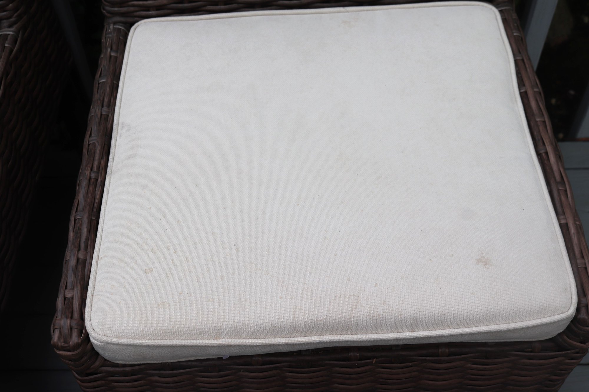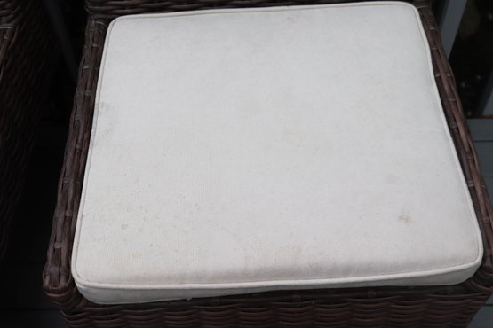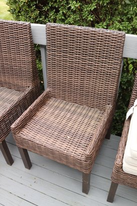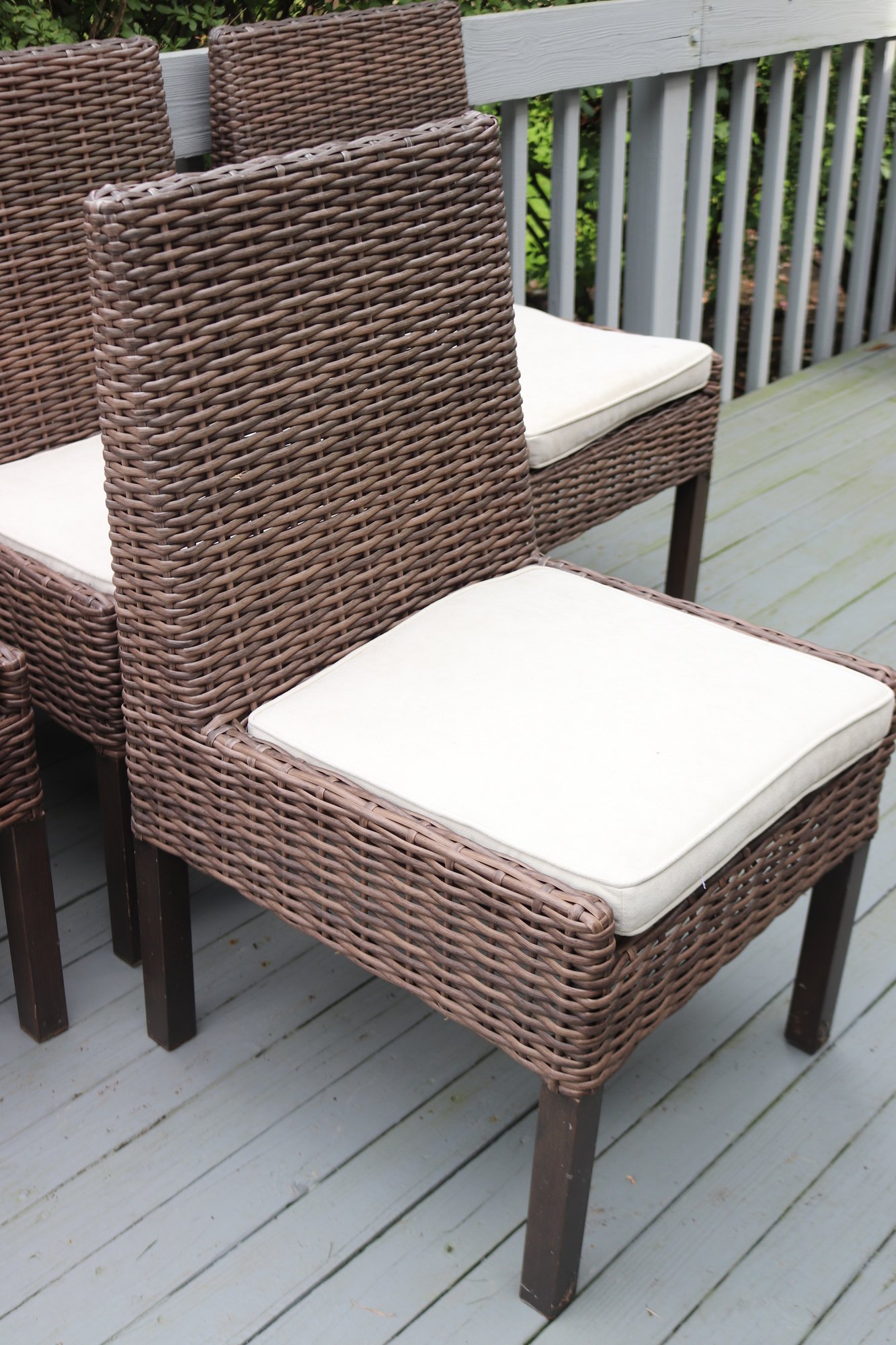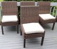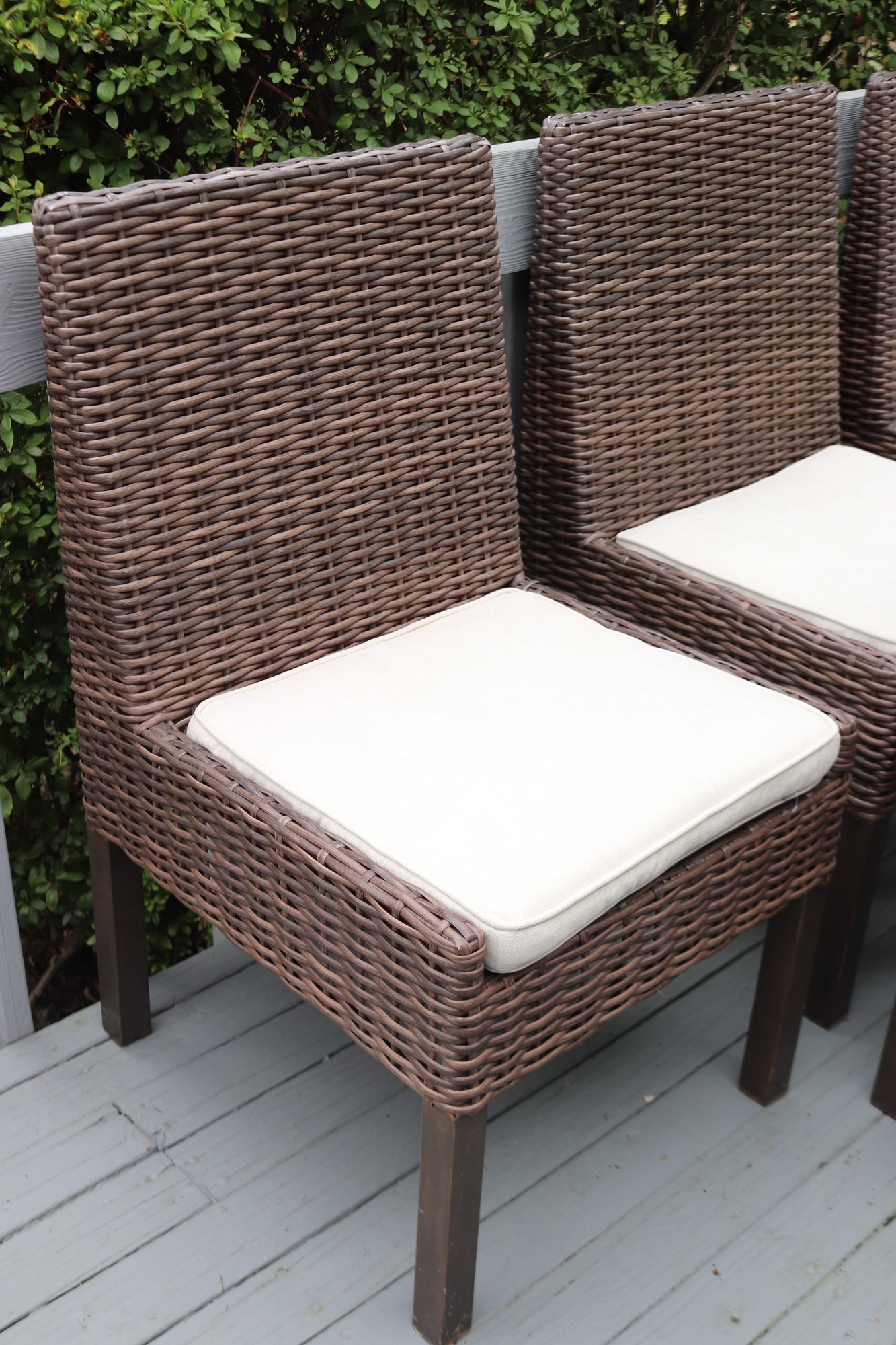 Set of 4 rattan outdoor side chairs with removable seat cushions.