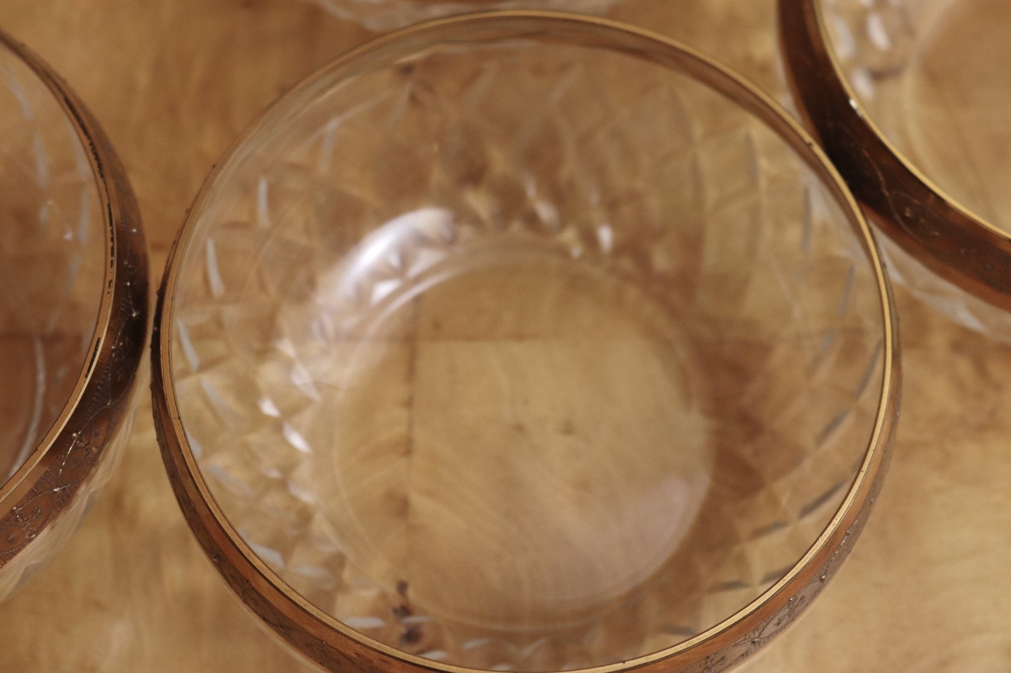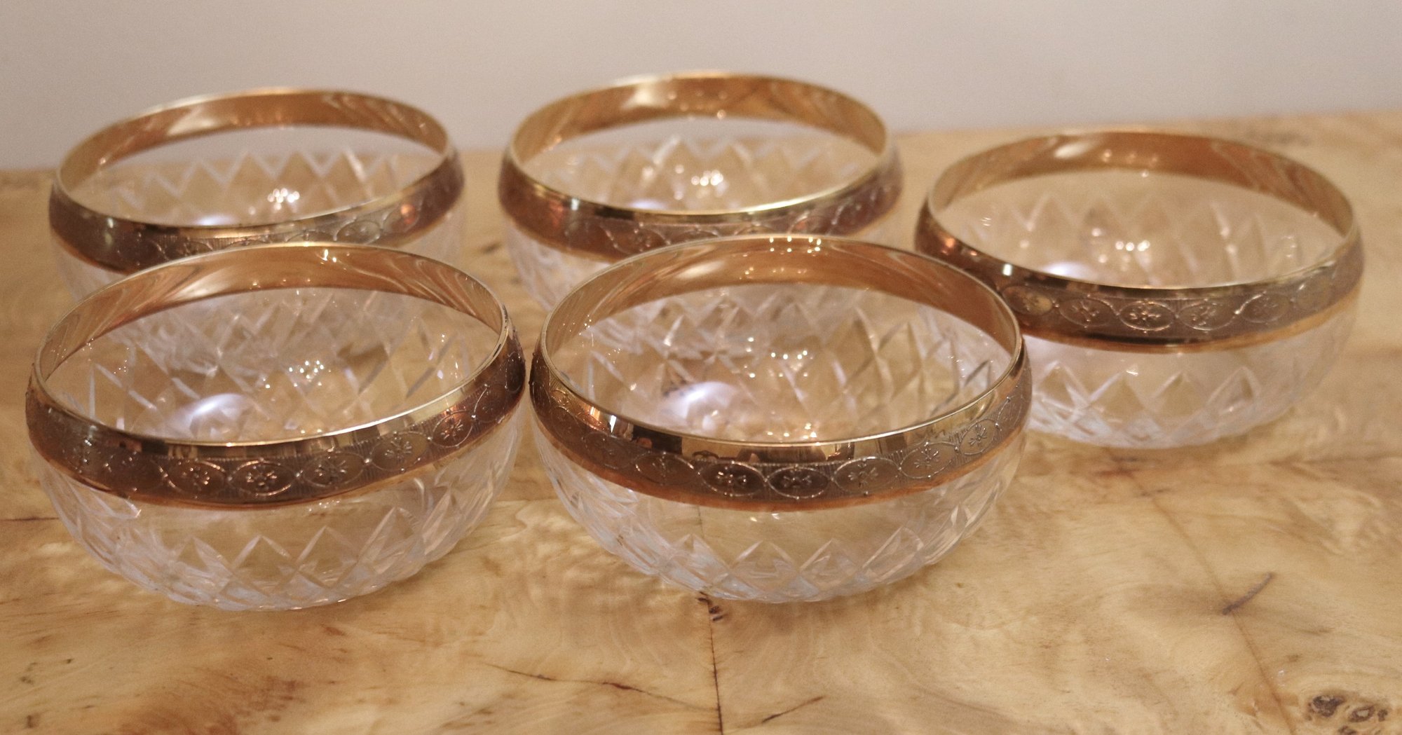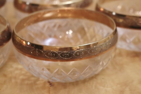 Set of 5 elegant gold rim etched ice cream/Sherbert bowls. Measure 4 1/4”