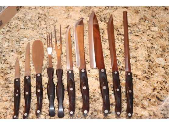 Set of Cutco knives in wooden holder. Set is comprised of 12 New Steak Knives. 2 Bread knives, Chef’s Knife, 2 Serving Forks & More - the Best for your Kitchen!