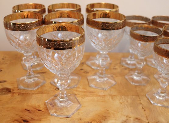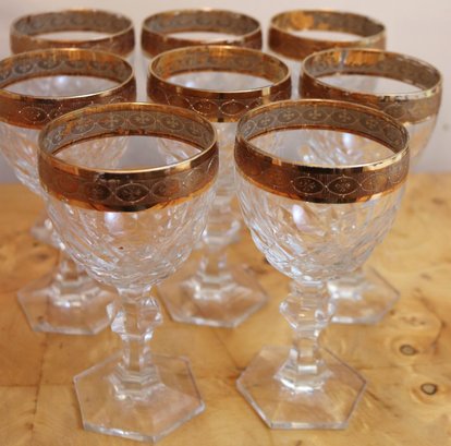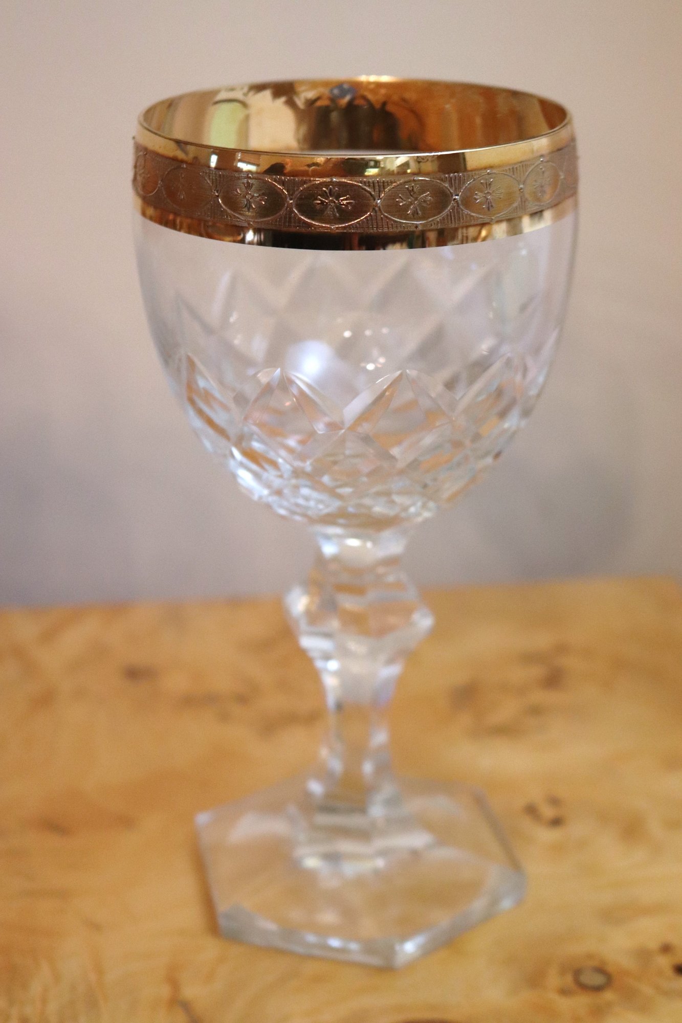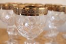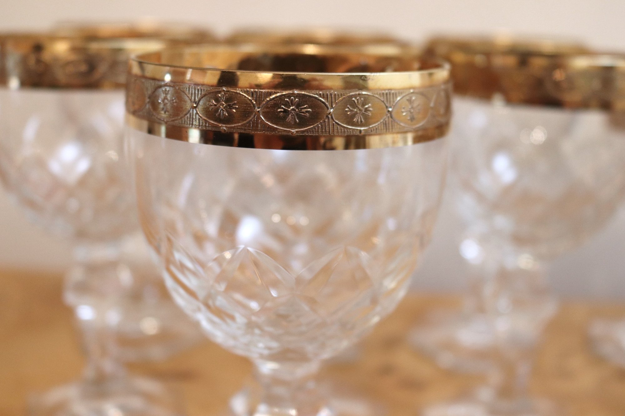 Set of elegant gold rim etched crystal wine glasses in goblet form and liqueur