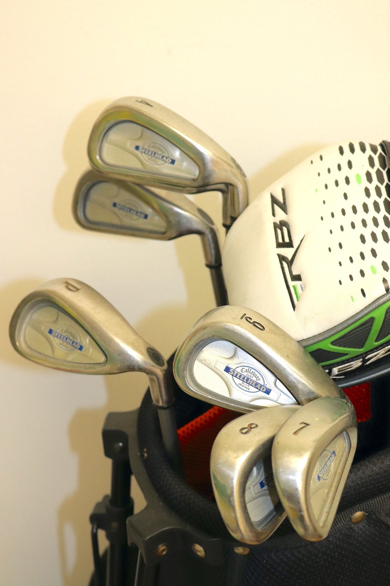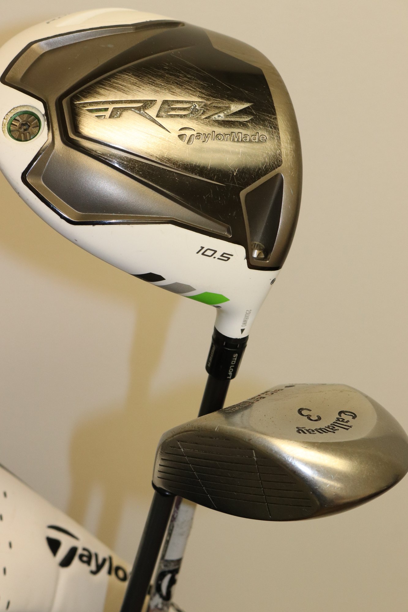 Set of Vintage golf clubs with Calloway steel head woods & Taylor made driver with golf bag. Please see all photos.
