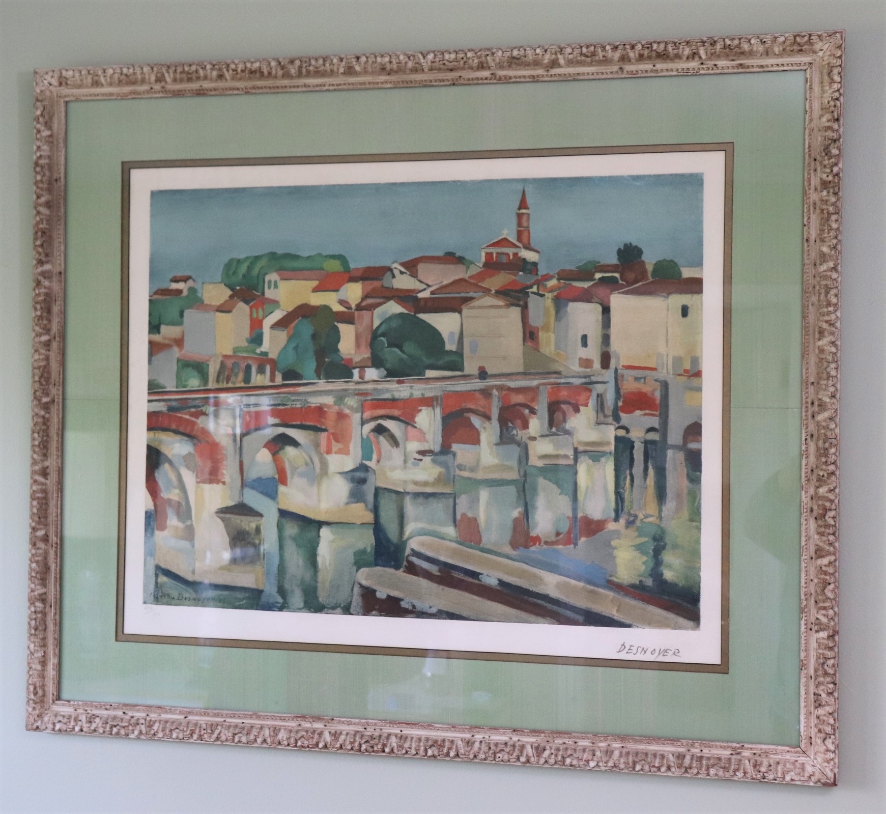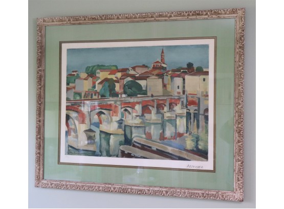 Wonderfully evocative Lithograph of colorful Riverside French city and bridge. Signed in pencil on LR and numbered 306/350. Framed Artwork measures 41.5” L x 35” T Francois Desnoyer, 1894-1972 was a French Impressionist & Post-Impressionist painter who drew his inspiration from the seafront & worked with the bright, vibrant colors of Provencal France.