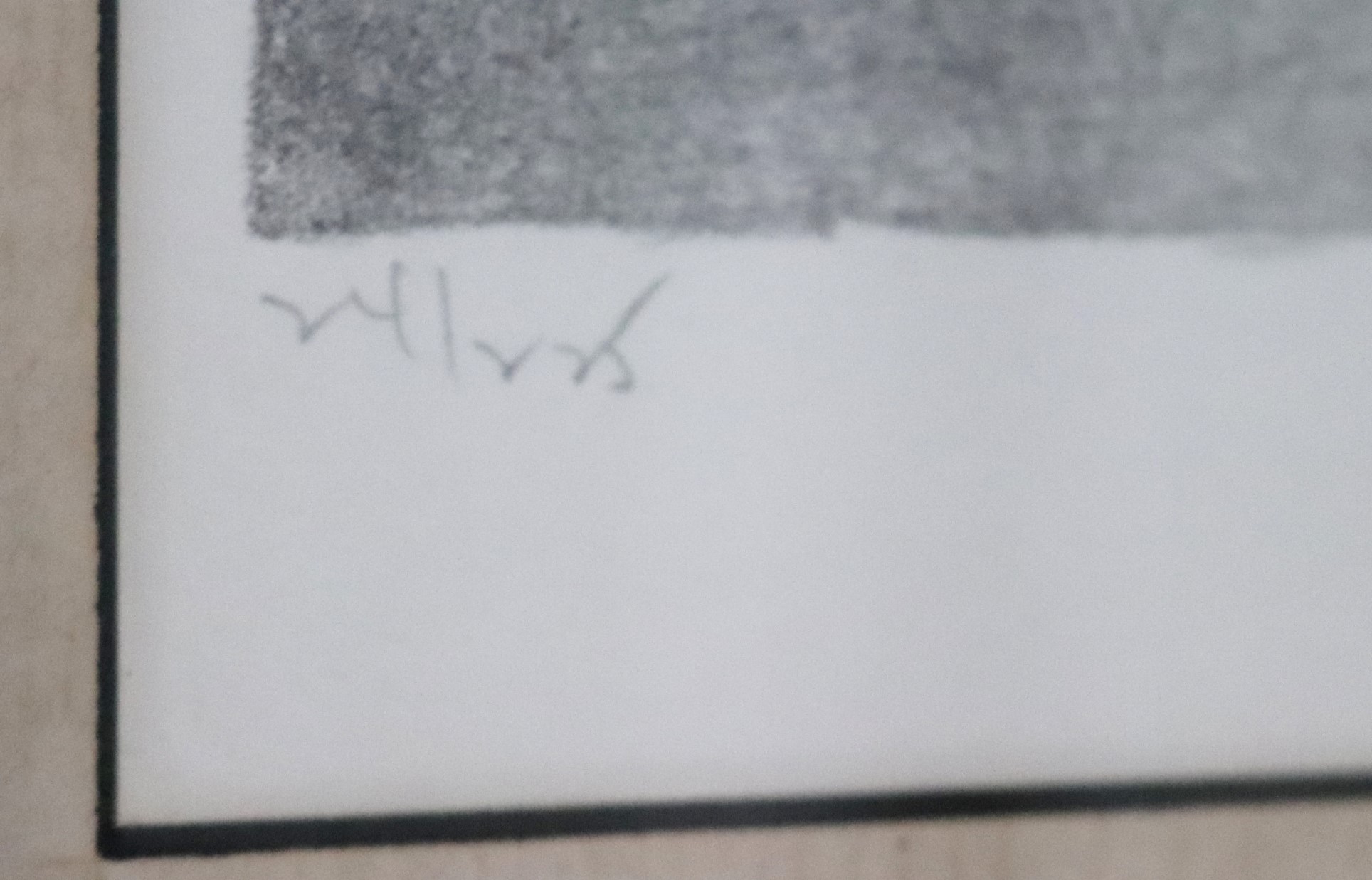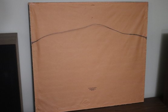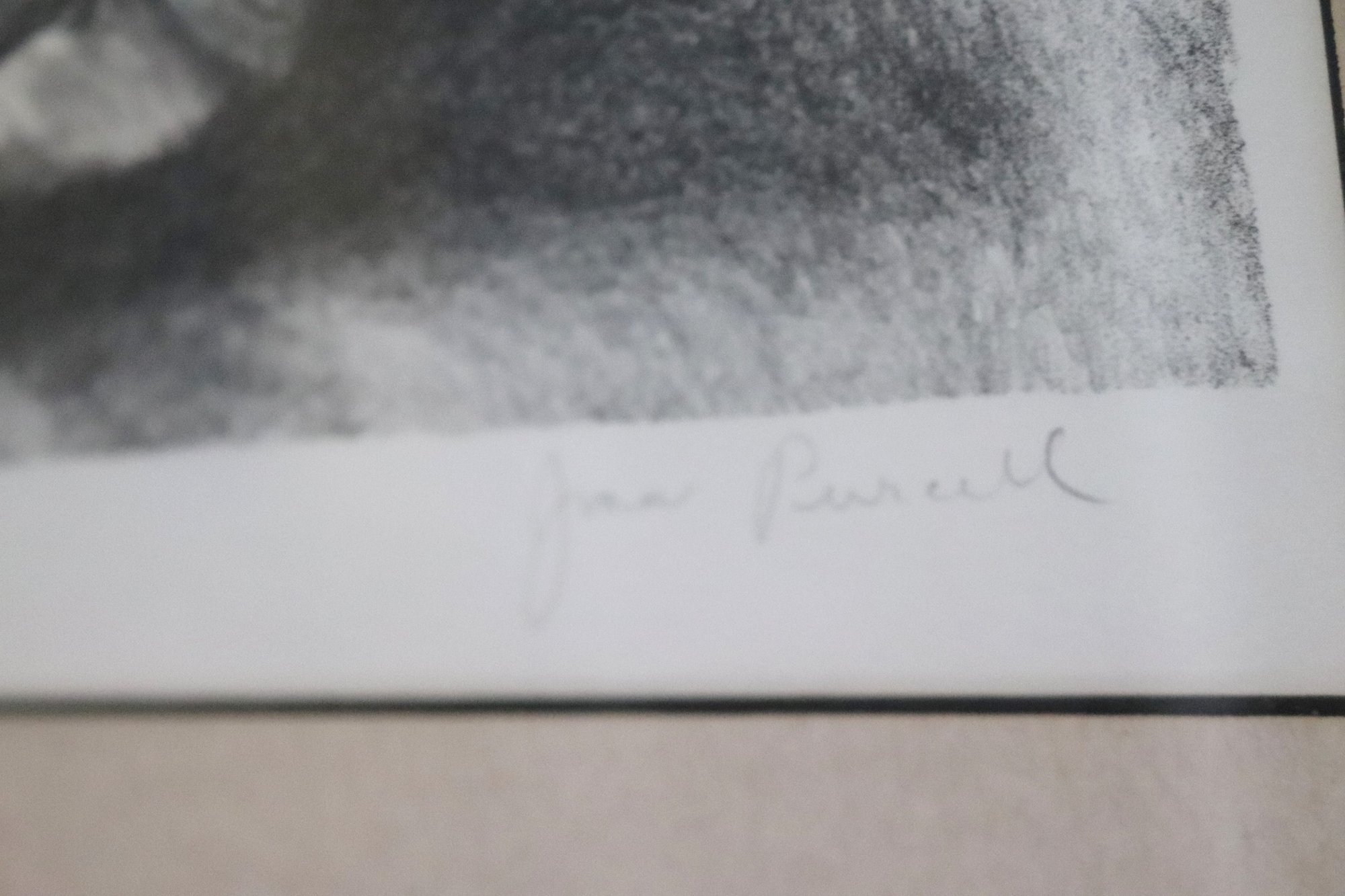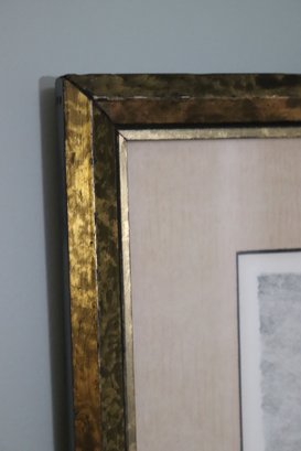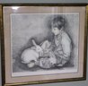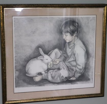 Signed & numbered print of boy feeding a bunny in mottled gold frame signed Joan Purcell. Frame measures 26” x 24”