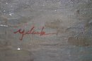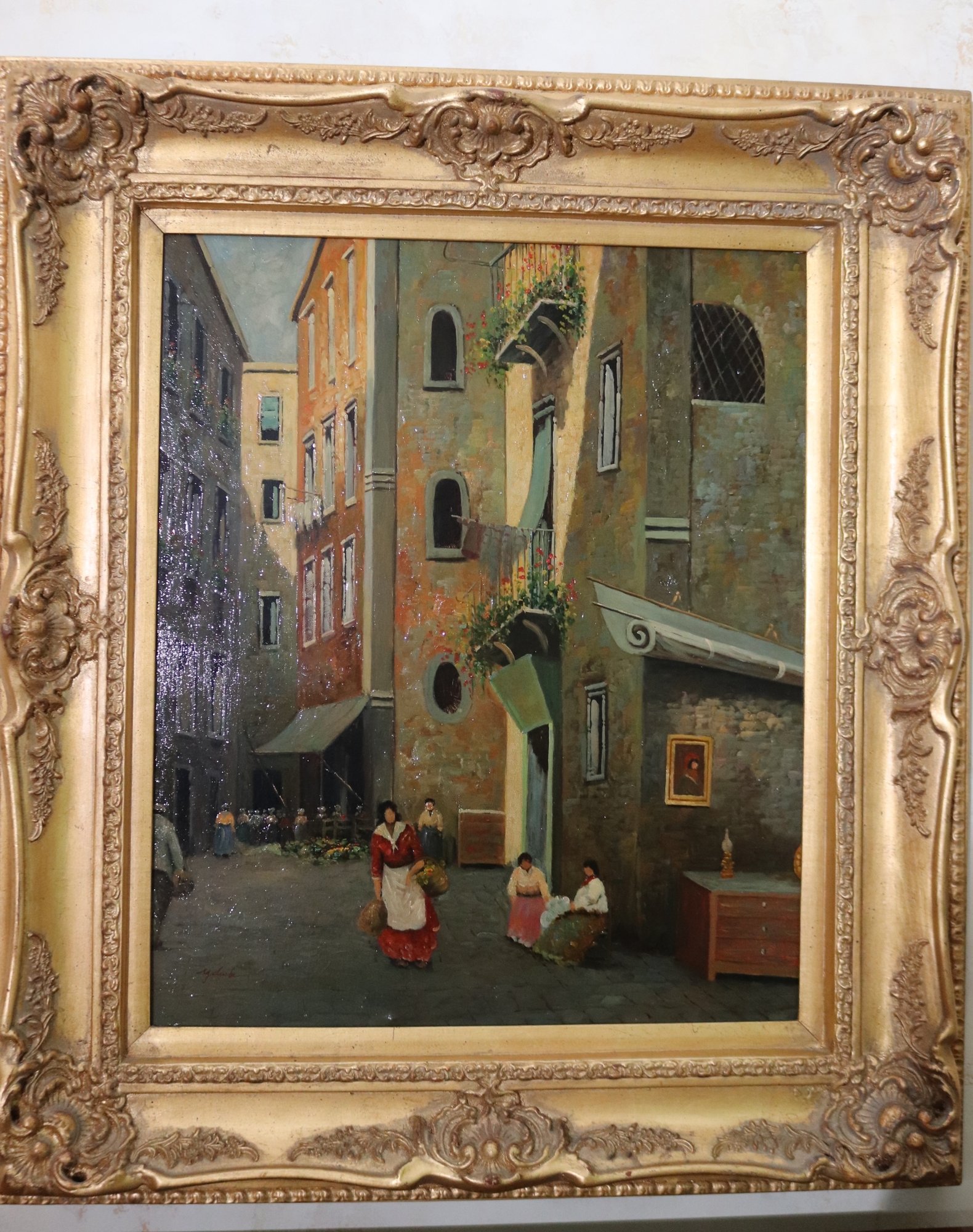 measures approximately 28” w x 34” tall in an ornate gilt wood frame.