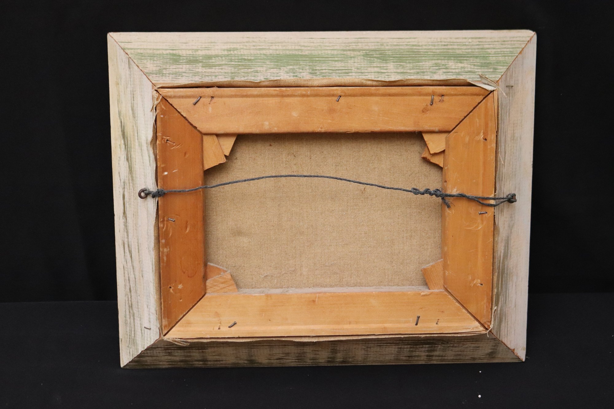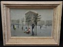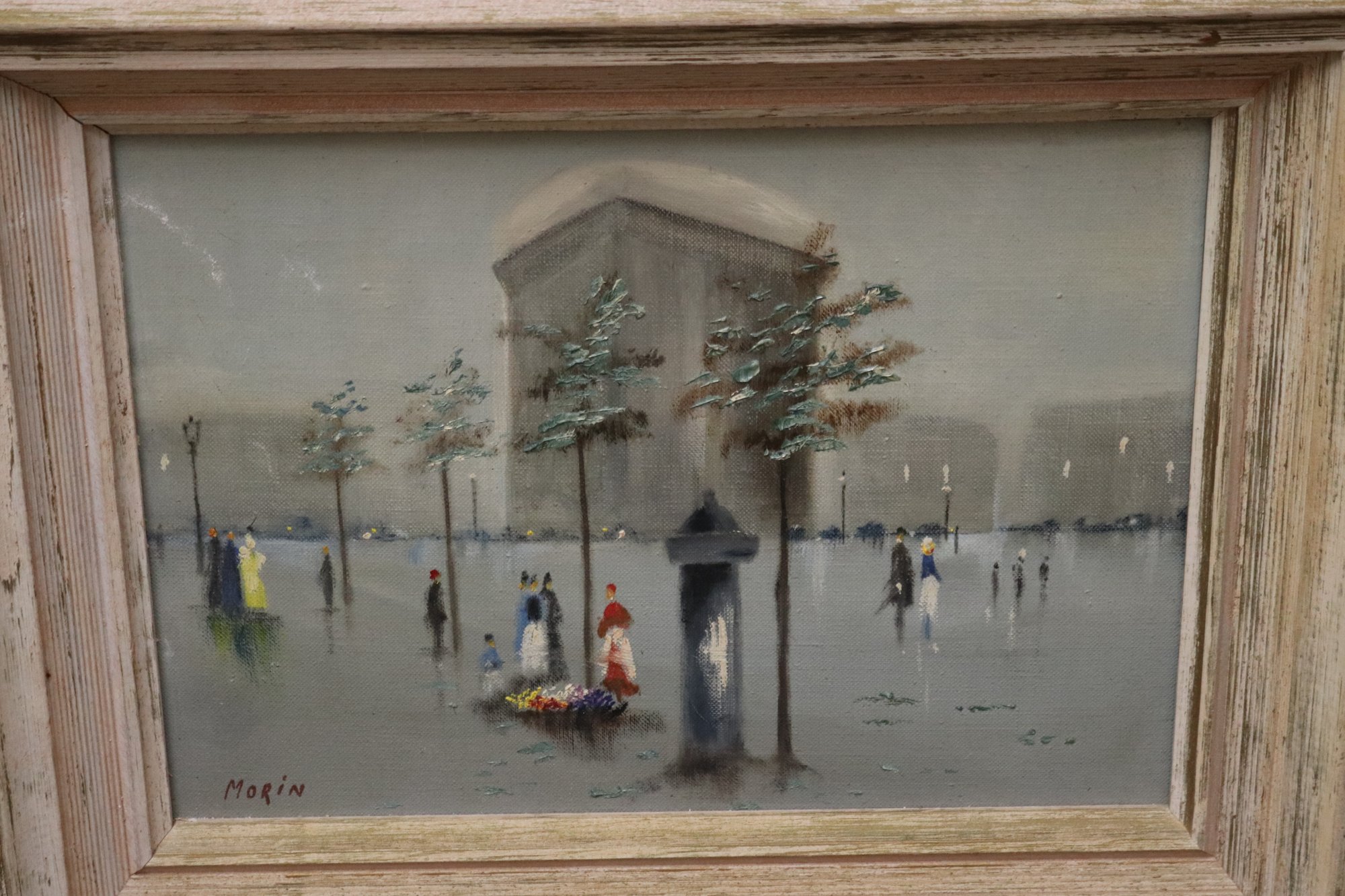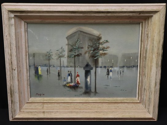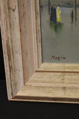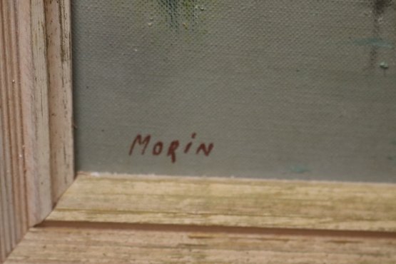 Signed winter scene painting signed by the artist Morin, measures approximately 16” w x 13” tall in the frame, sight is approximately 12” w x 9” tall as pictured