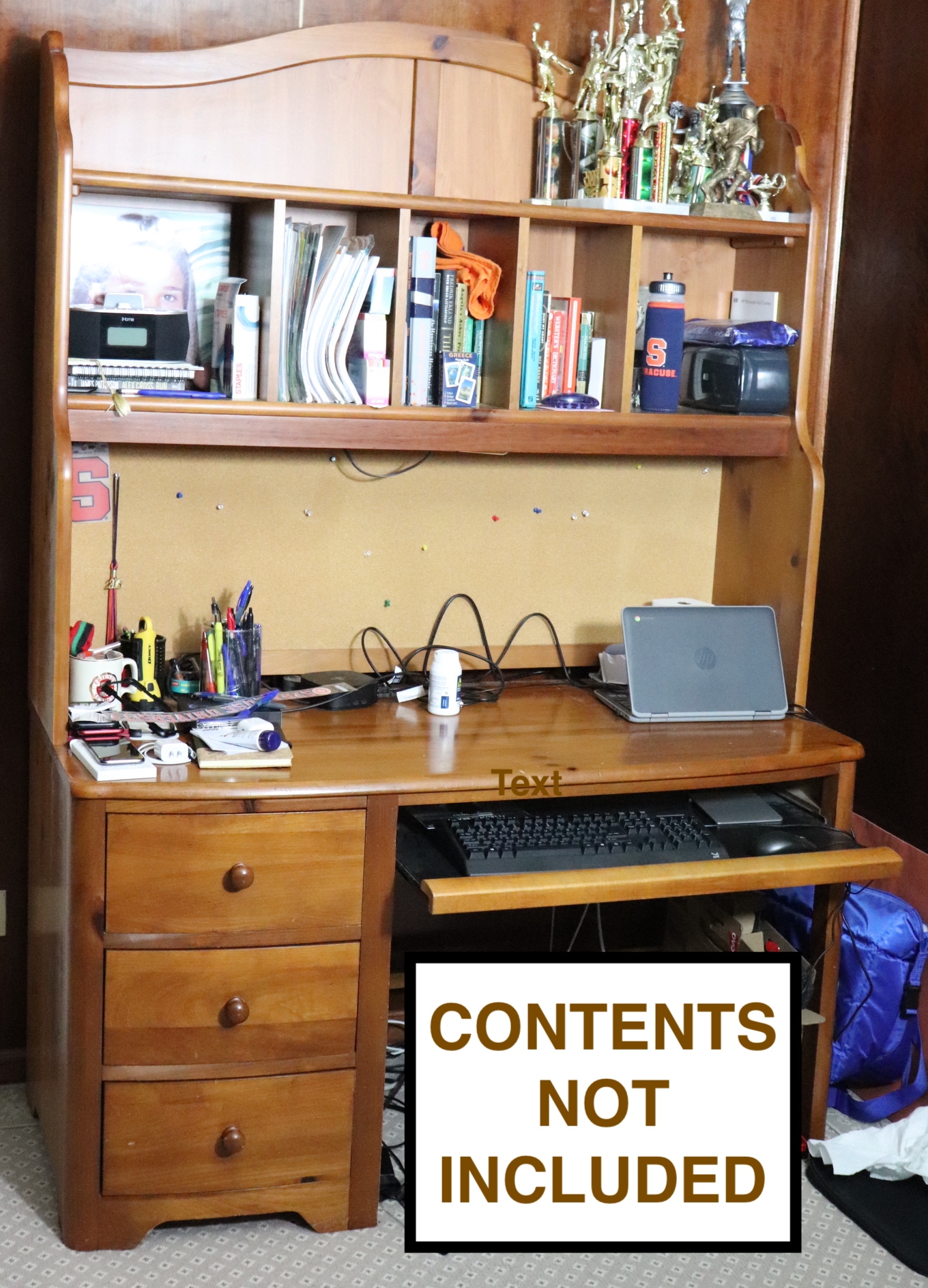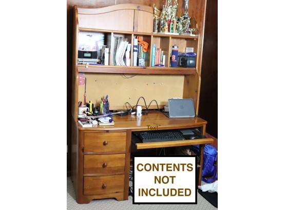 Stanley Furniture Desk with 3 drawers and computer keyboard drawer. Hutch with cork board and open bin shelving. 2 pieces. Contents NOT included. In good used condition with minor wear as shown. Approximate Measurements: Desk: 54”W x 24.5”D x 30”H, Hutch: 54”W x 14”D x 48”H